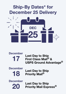 We will offer USPS & FedEx shipping throughout the holiday season. The cutoff dates are Noon on December 18th via USPS Priority Mail and Noon on December 22nd via FedEx 2-day. Details are listed below. Please visit our shipping partner’s website for more information.