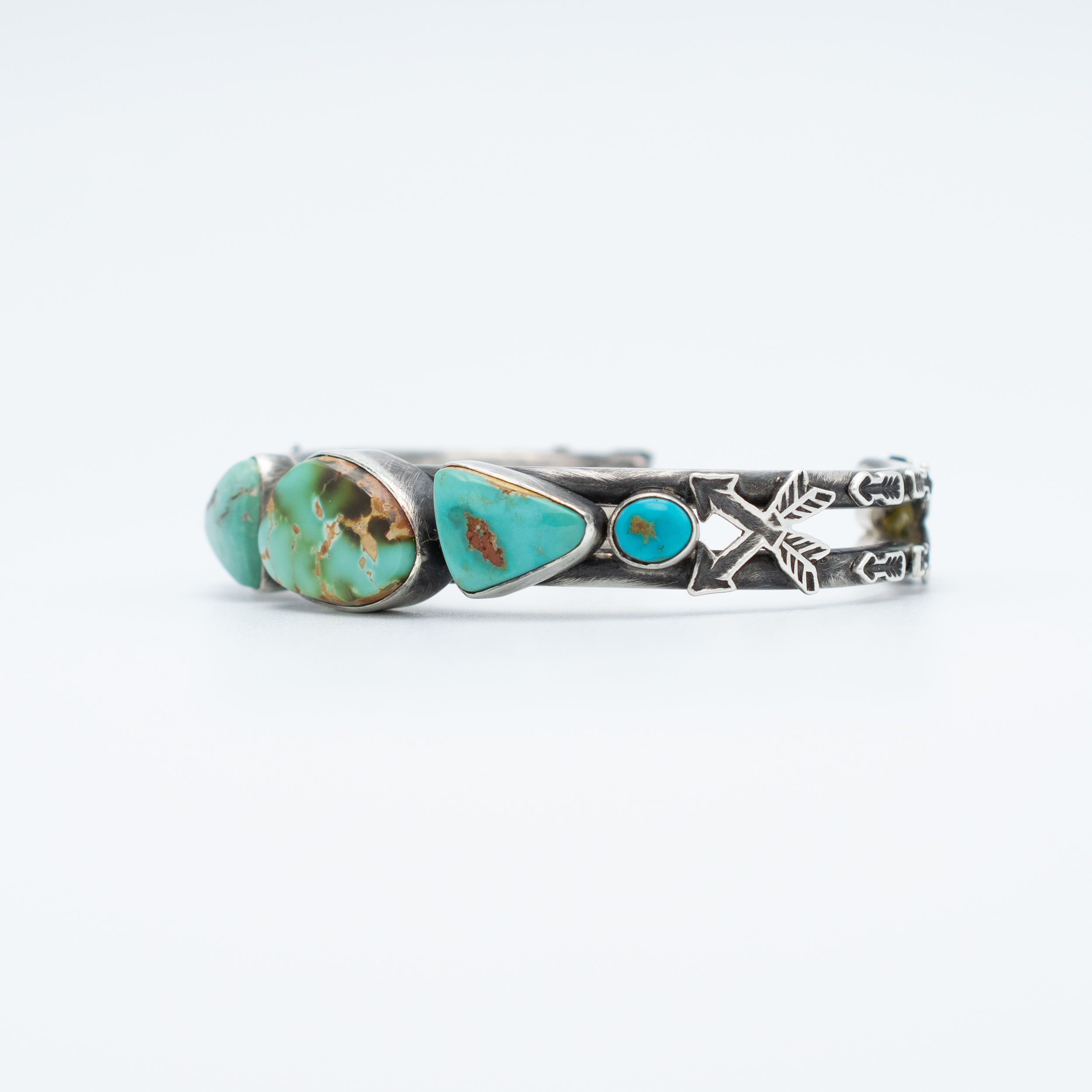 This exquisite bracelet by Bryant Martinez, Navajo, showcases five beautifully unique Natural Royston Turquoise stones. The stones vary in color from sky blue and teal to pale blue, and even dark green, each with its own distinctive matrix ranging from light to dark brown. The silver shank is adorned with intricate applique arrows, adding a touch of traditional craftsmanship. This bracelet is a blend of vibrant hues and meticulous detail, making it a stunning piece for any turquoise enthusiast!