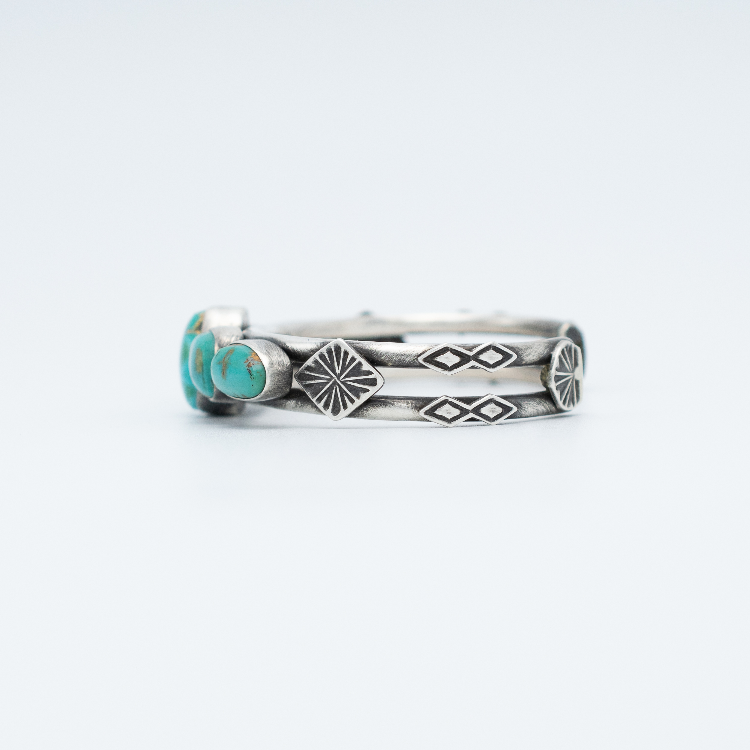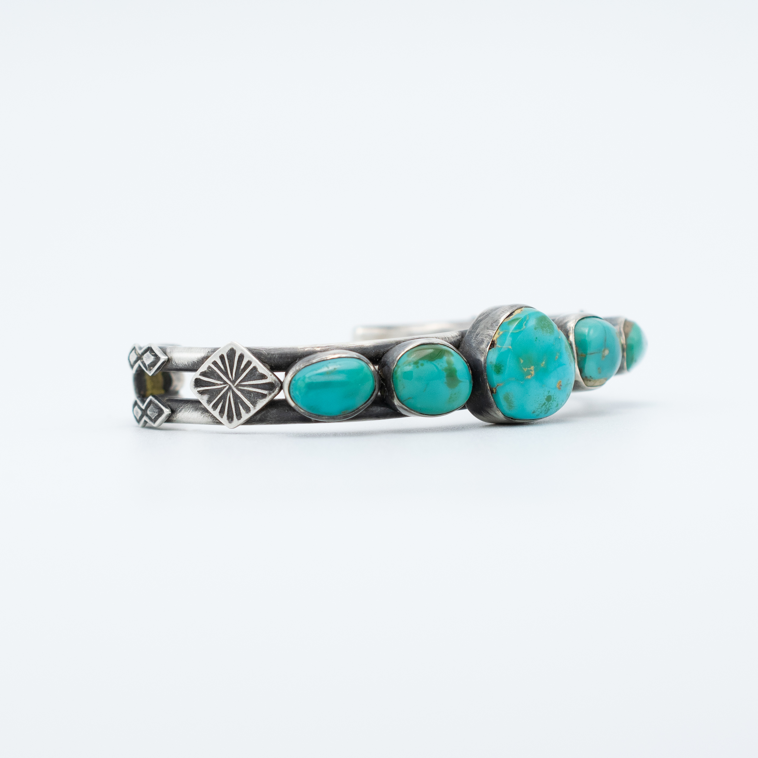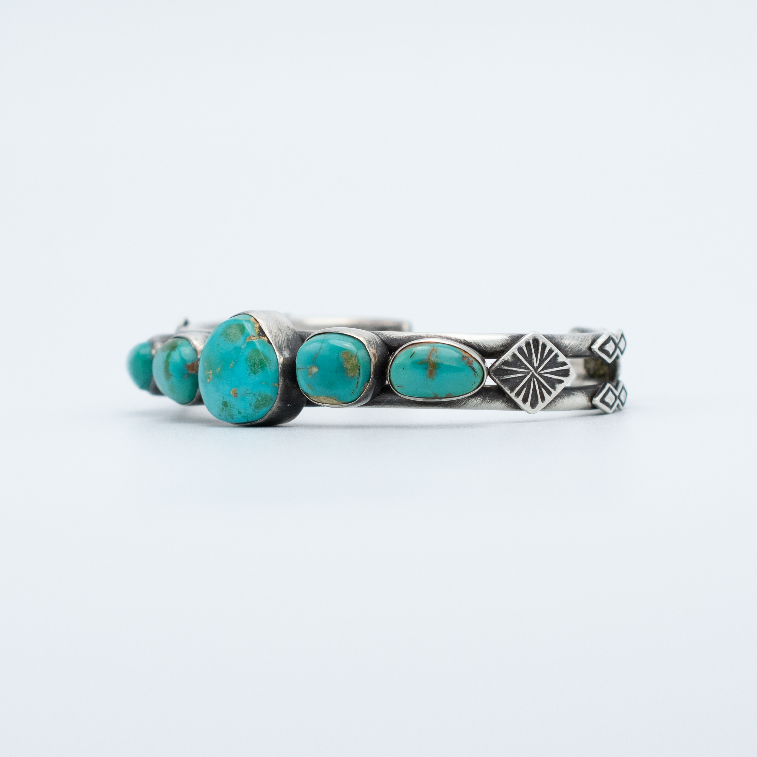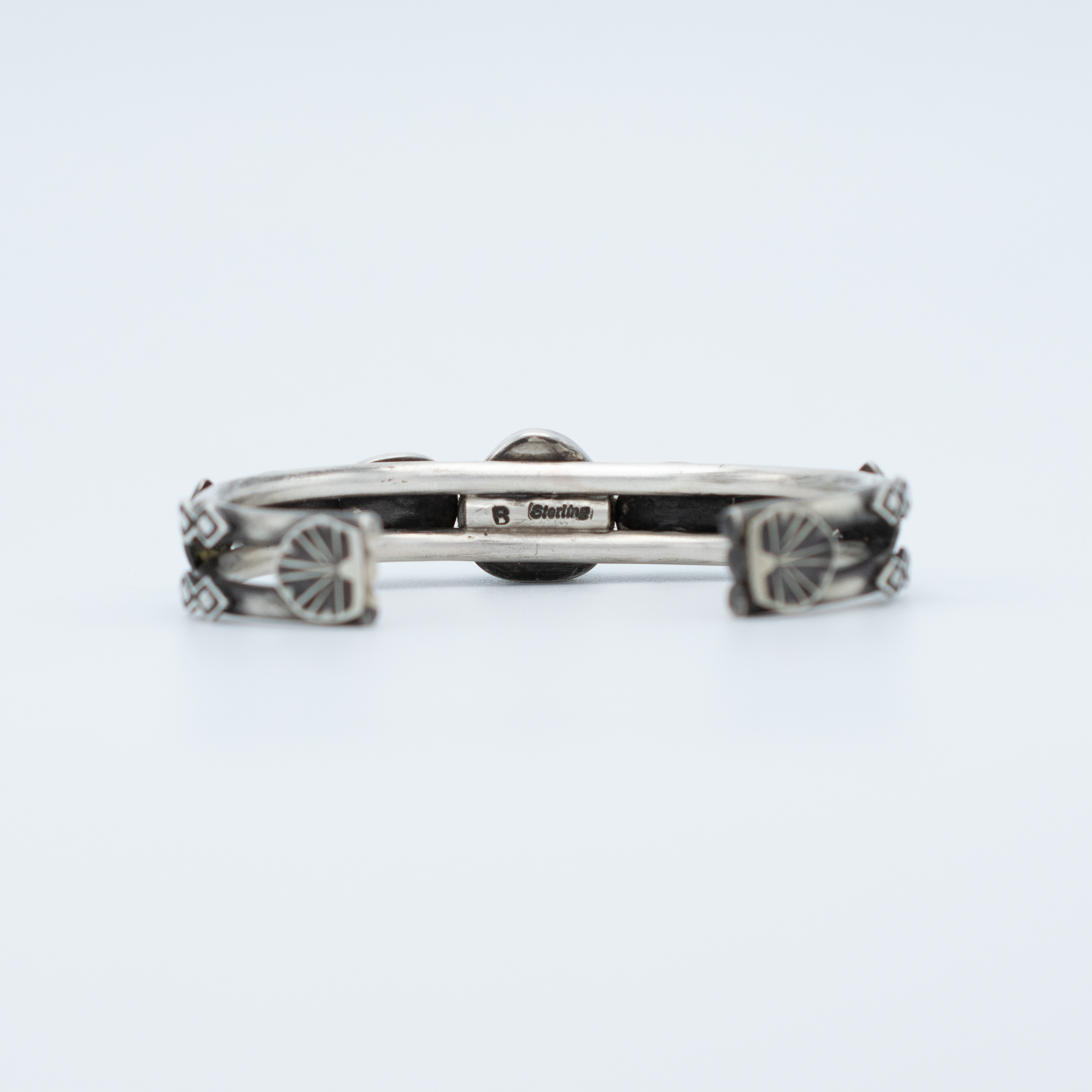 Experience the allure of Southwest symbolism with this striking bracelet by Bryant Martinez. Featuringclam shell symbols and vibrant Royston Turquoise stones, it makes a bold statement.