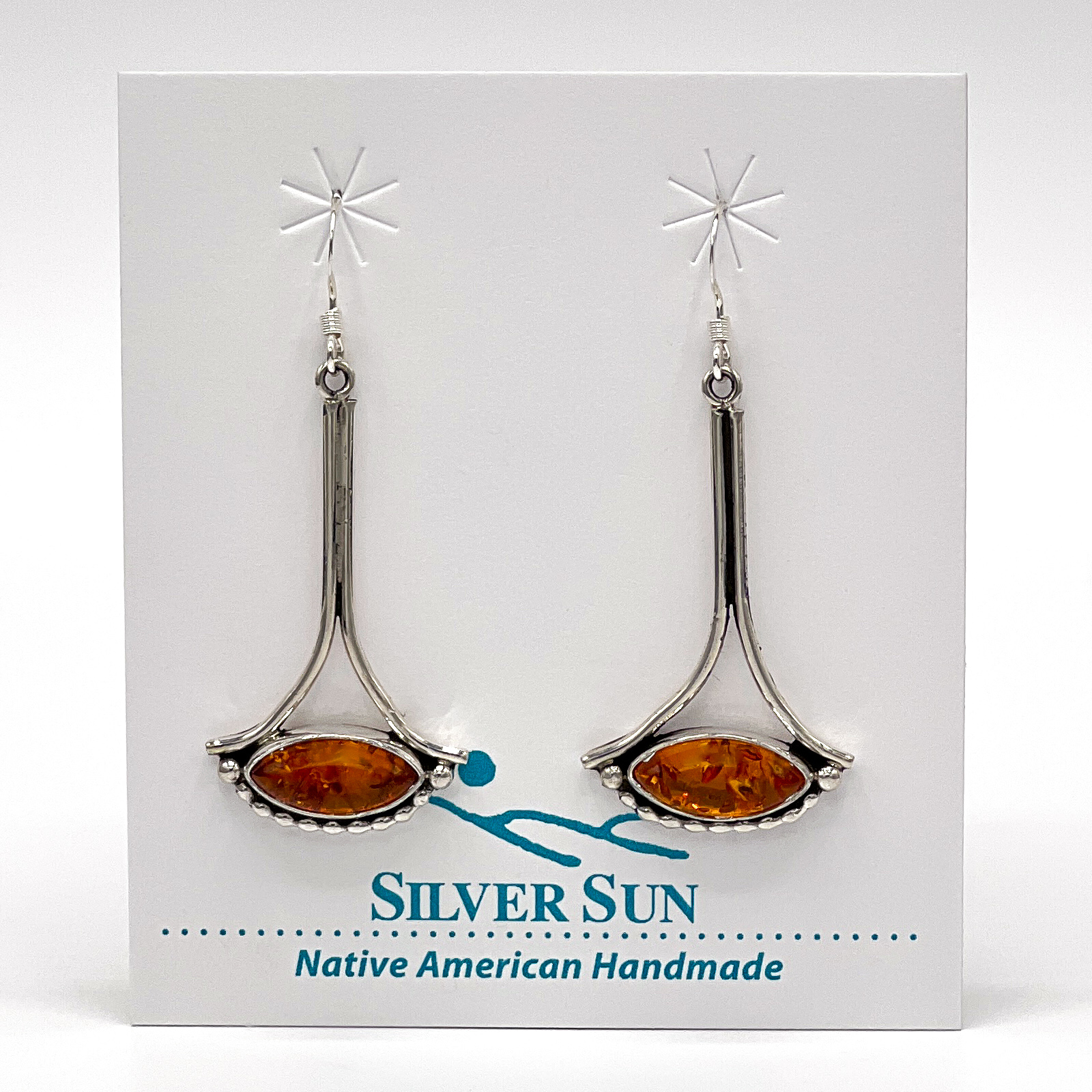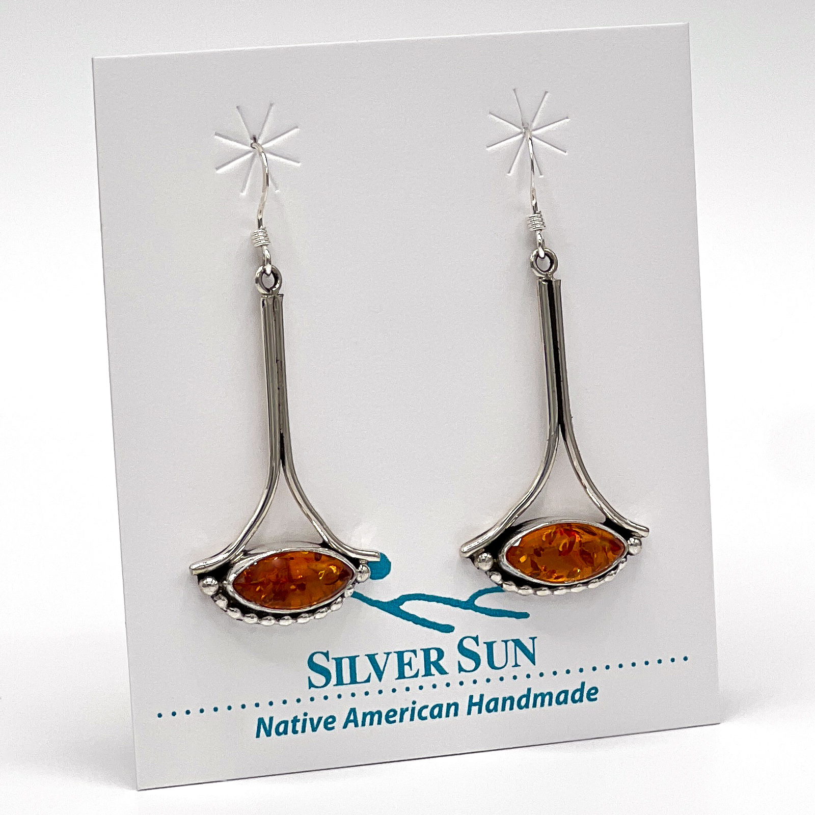 Brilliant Amber stones are featured at the bottom of long silver rods, a modern design in Native handmade.