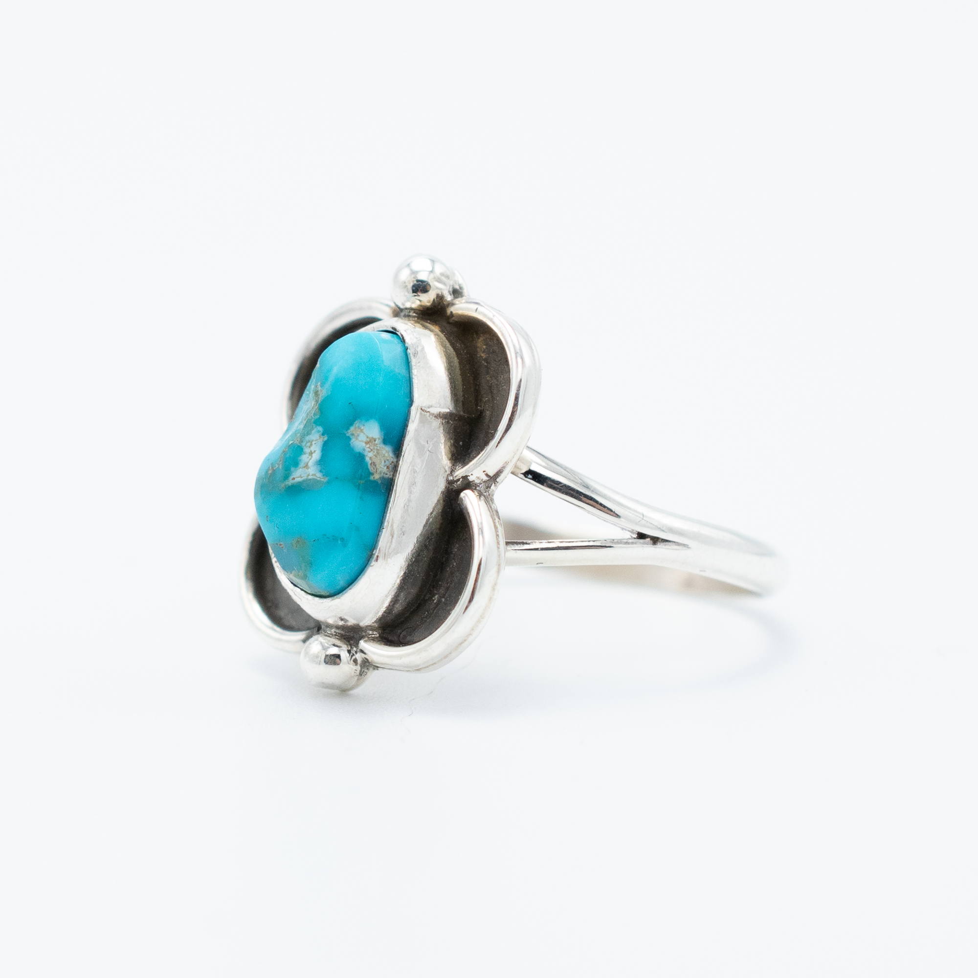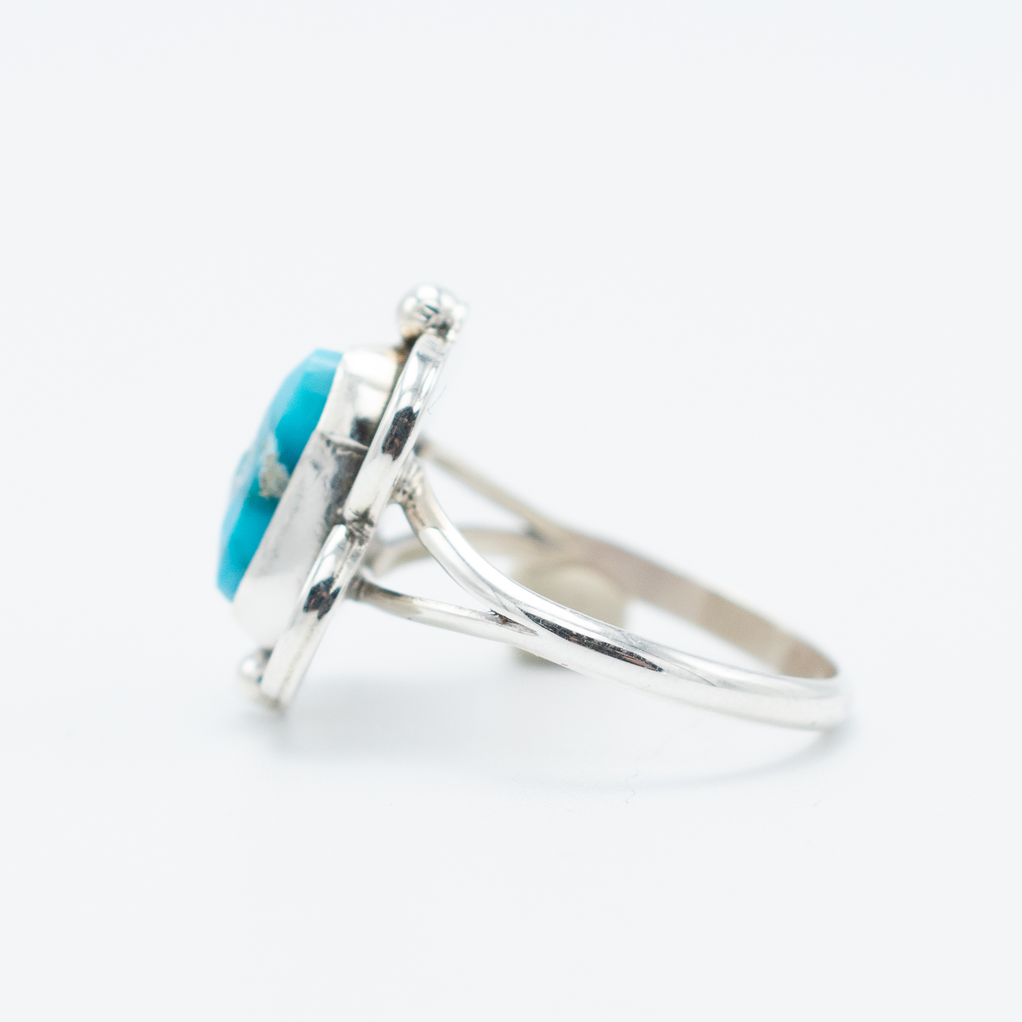 This Apache Blue Turquoise Butterfly Ring by Navajo artist Ruth Ann Begay features a beautifully shaped turquoise stone framed within a sterling silver butterfly-inspired design. The deep blue hues and natural matrix of the Apache Blue turquoise are accentuated by delicate silverwork, creating a piece that embodies grace and tradition. Handcrafted with care, this ring is a unique expression of Native artistry.