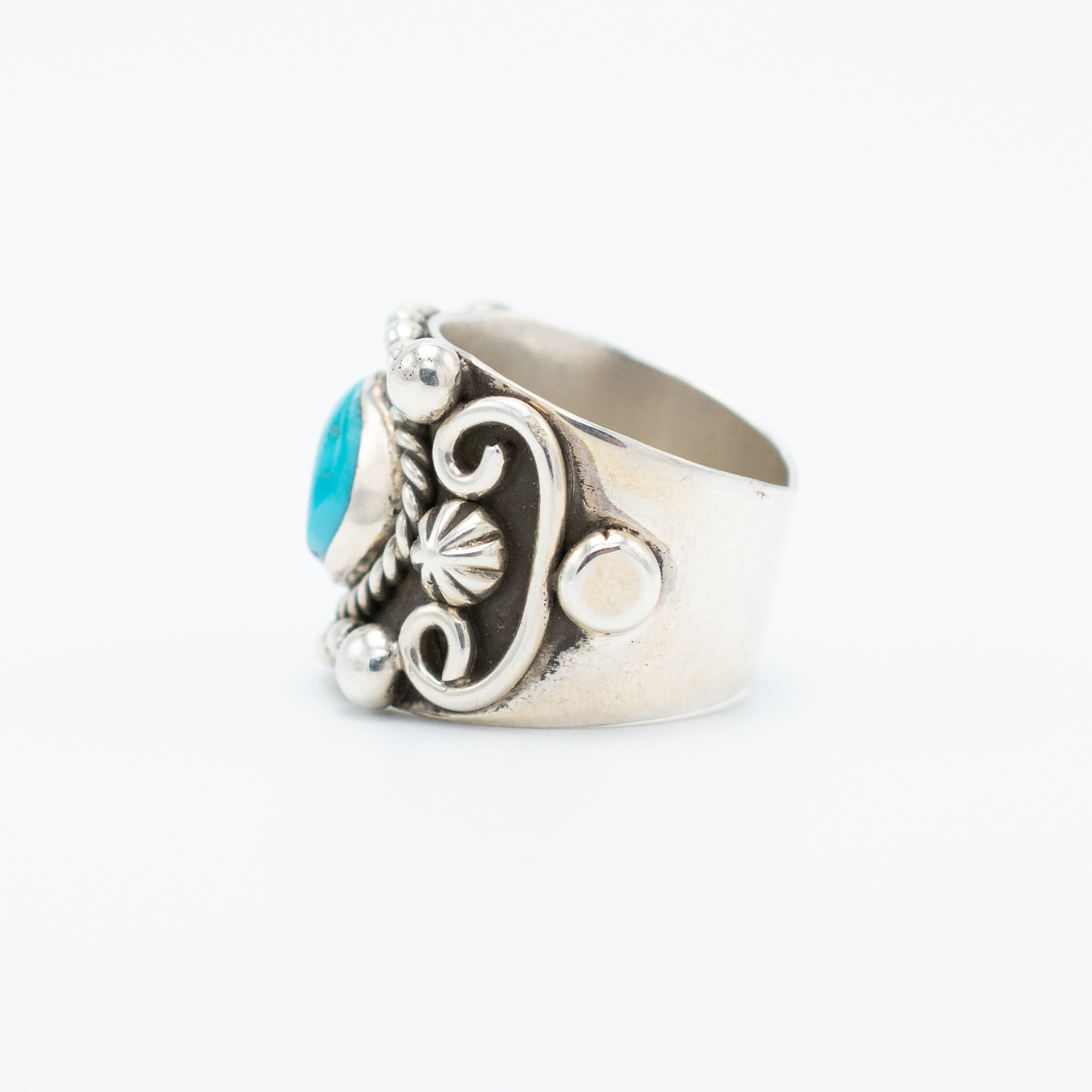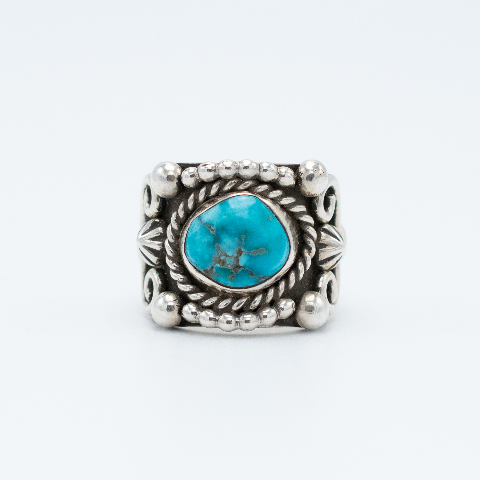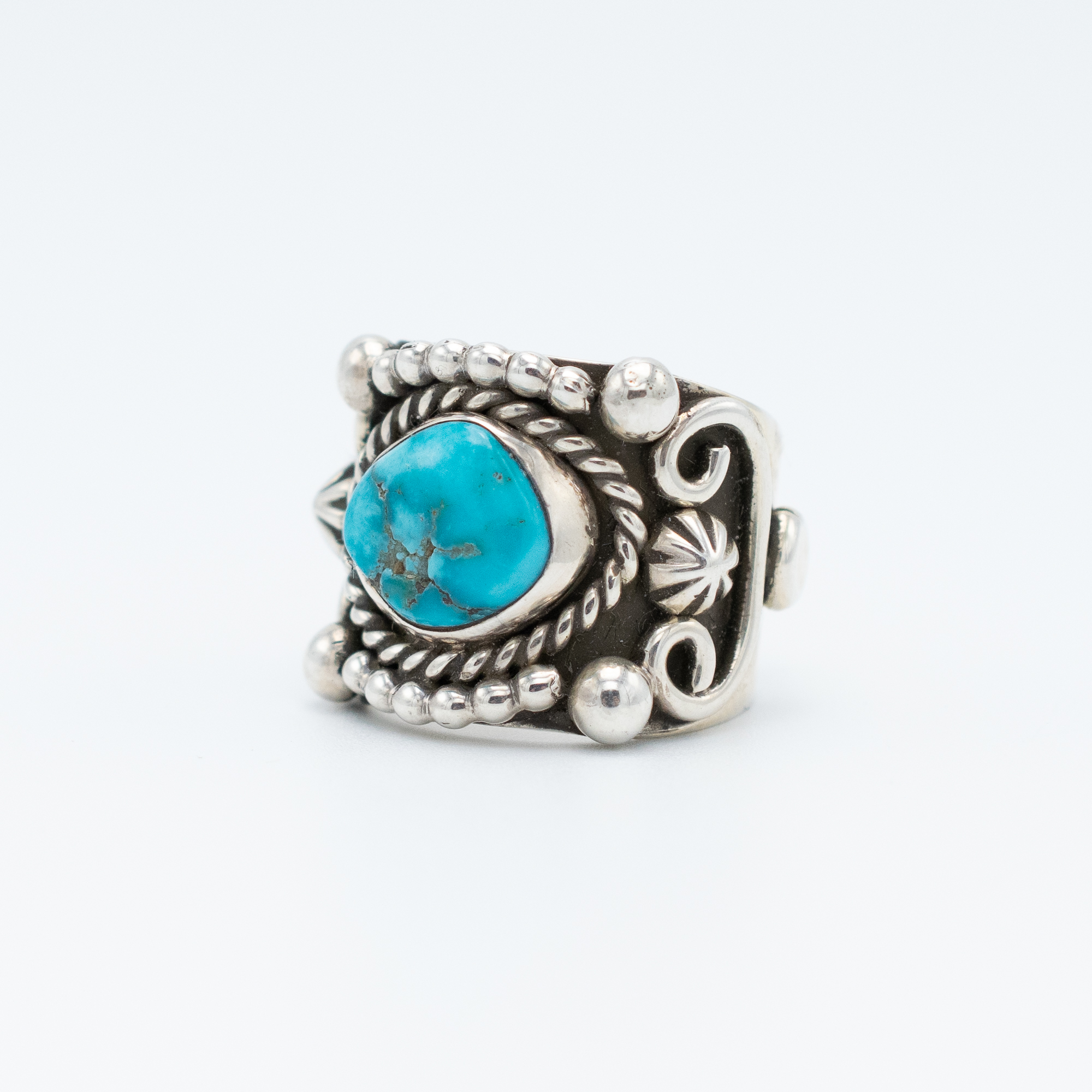This striking ring by Navajo artisan Ruth Ann Begay exudes a bold, rockstar vibe with its vibrant Apache Blue turquoise stone. Adorned with intricate silver appliqué, the ring combines dynamic design with traditional craftsmanship. The detailed silverwork accentuates the stone’s rich blue tones, creating a statement piece that stands out. Perfect for those who appreciate both artistry and a touch of glamour, this ring is a standout addition to any collection.