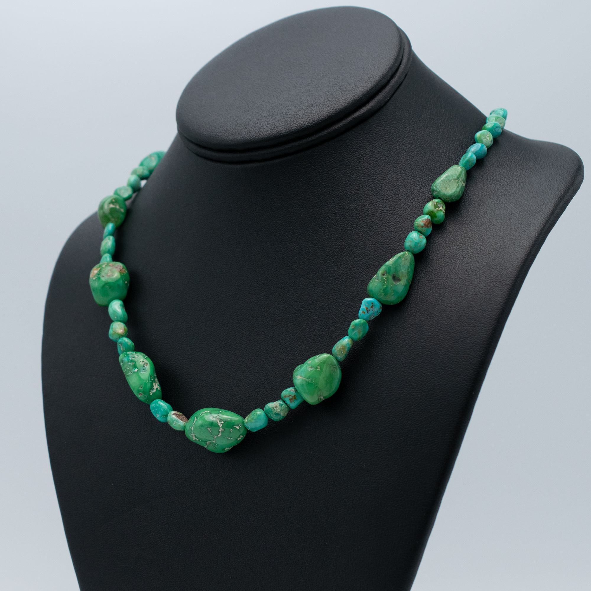 This Natural Armenian Turquoise Bead Necklace by Kathleen Sanchez of San Felipe Pueblo showcases a vibrant blend of green and blue tones with organic matrix patterns. Each natural nugget is carefully hand-strung to highlight the beauty and individuality of the stones. Earthy and elegant, this necklace is a timeless piece of wearable tradition.