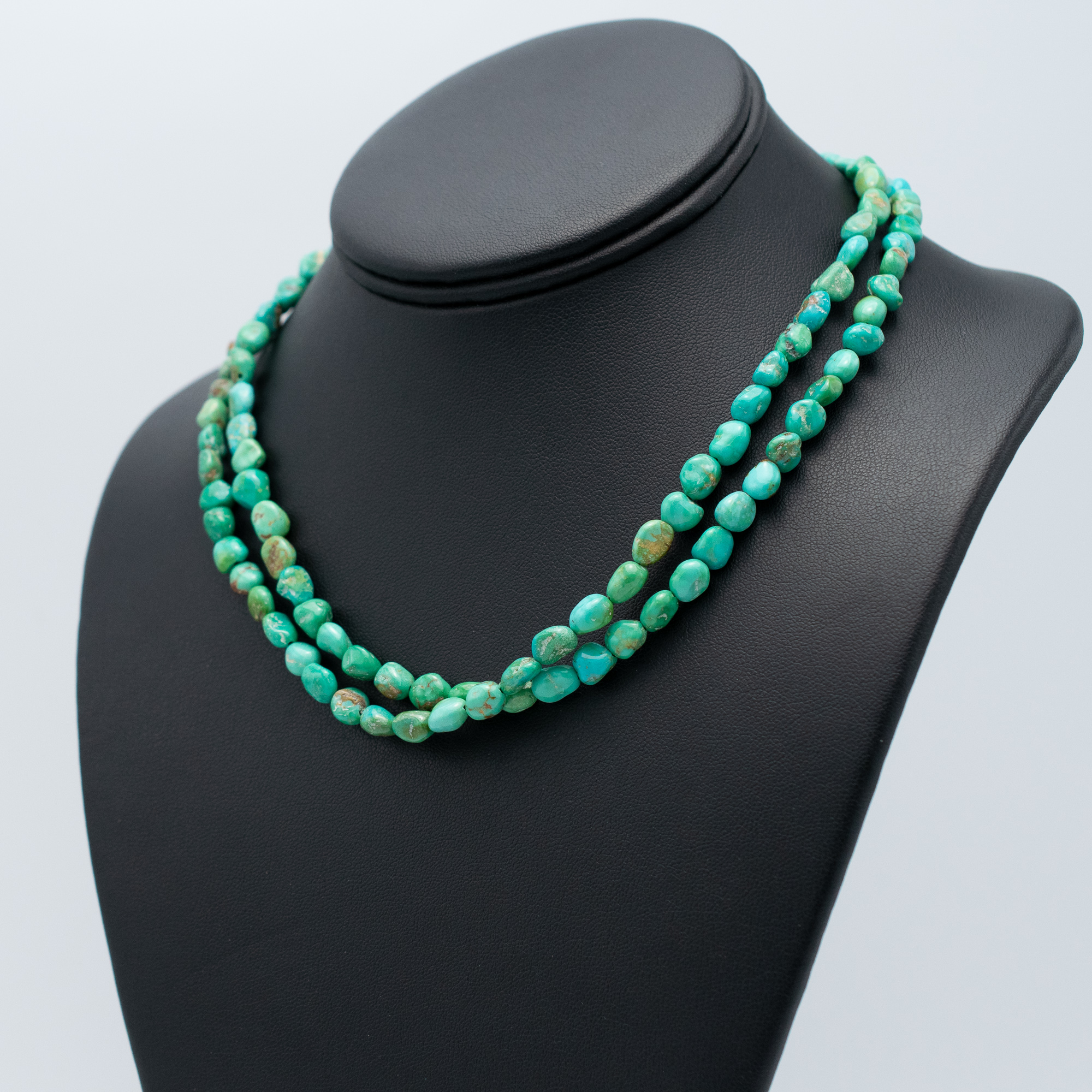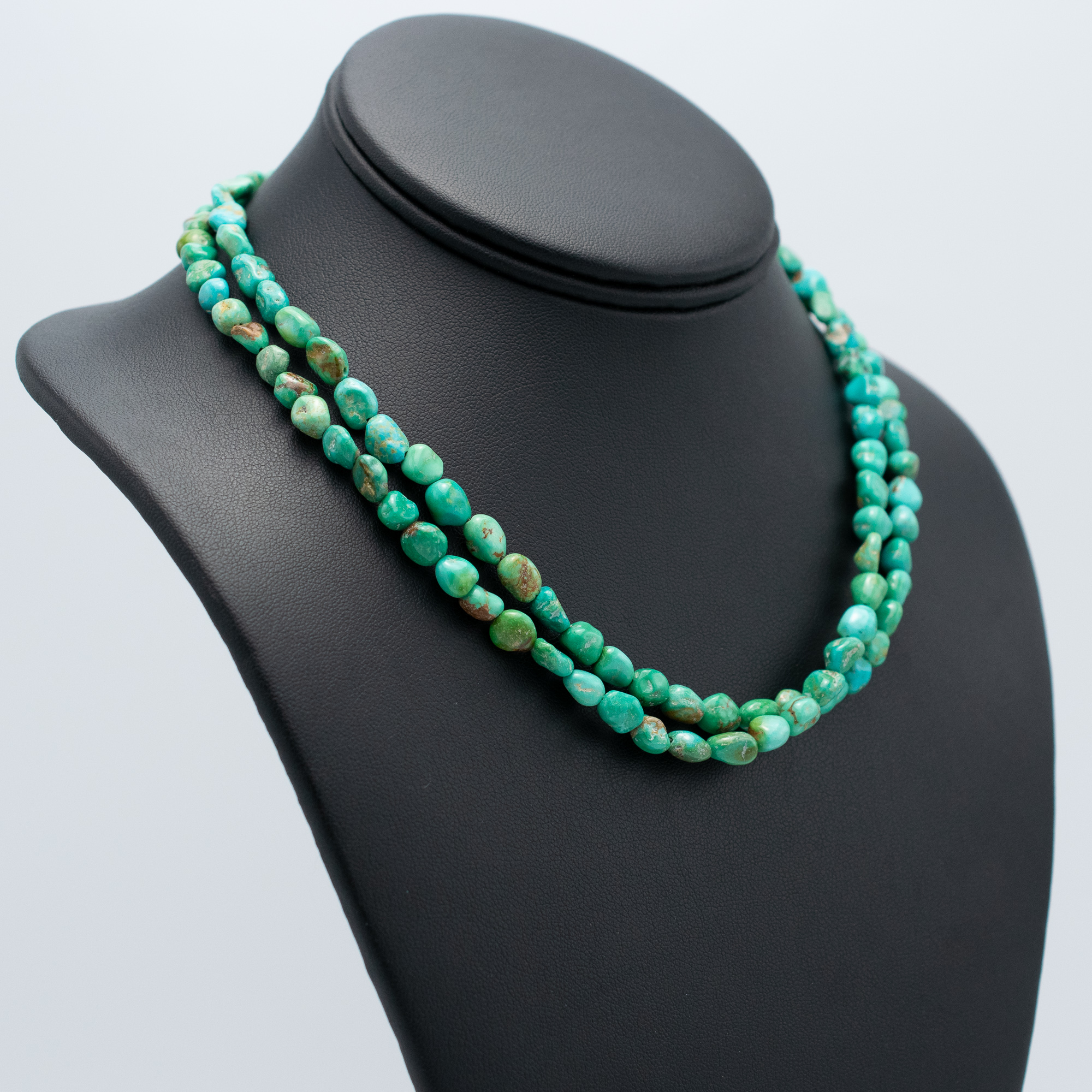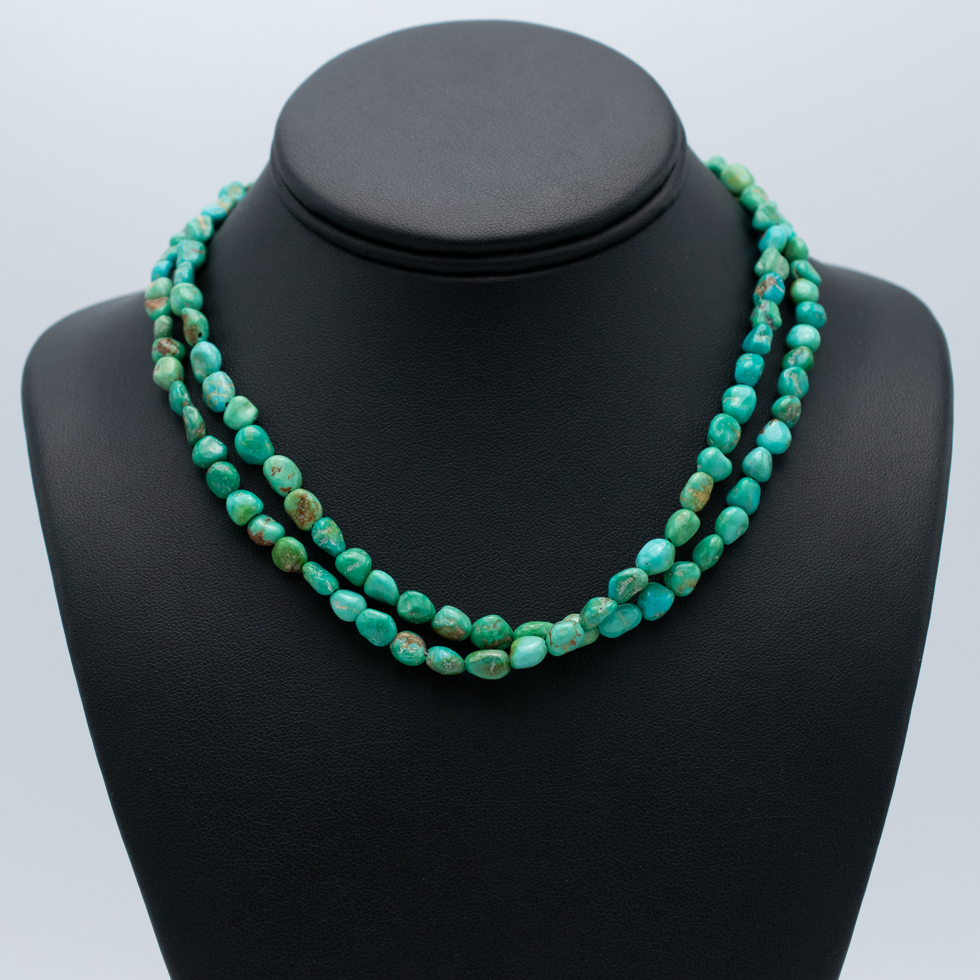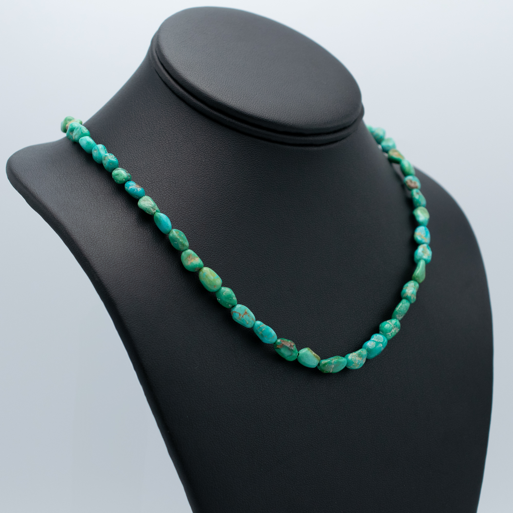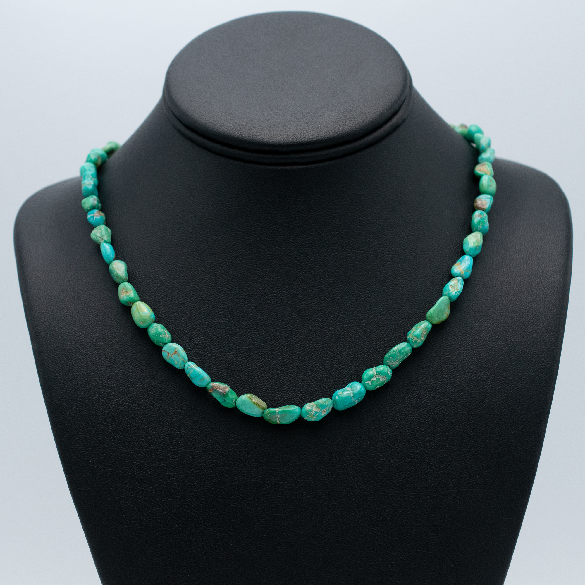 This Natural Armenian Turquoise Bead Necklace by Kathleen Sanchez of San Felipe Pueblo features a beautifully earthy strand of 5 mm hand-strung turquoise nuggets. With its soft green-blue hues and natural matrix, this 34″ necklace reflects the organic charm and understated elegance of traditional Native jewelry. A timeless piece perfect for layering or wearing solo.