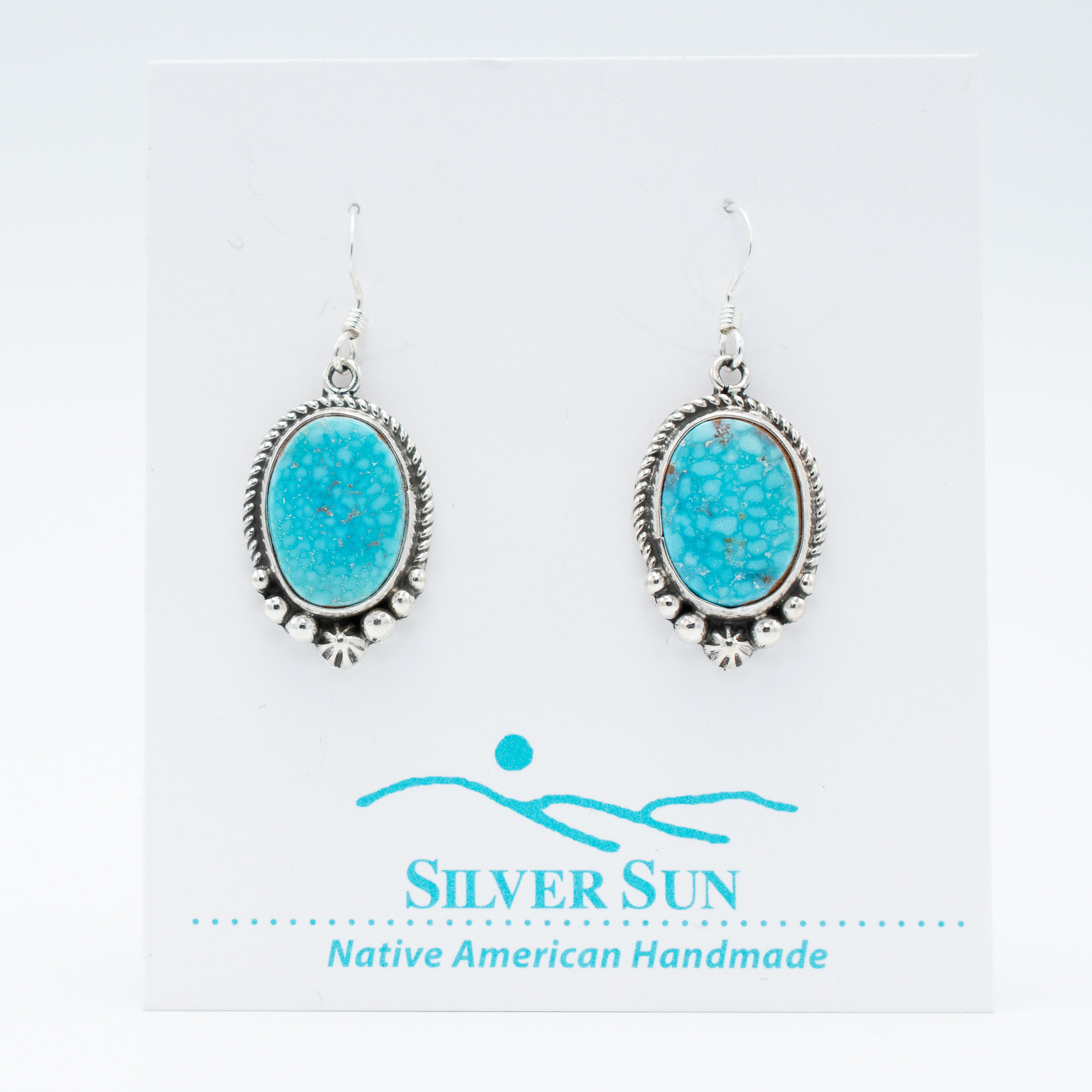 These elegant earrings by Diné artist Ruth Ann Begay feature stunning Bird’s Eye Kingman turquoise, known for its captivating sky-blue color and intricate web-like matrix. Set in sterling silver with a twisted rope border, each stone is accented by handcrafted silver details that enhance its timeless charm. A perfect blend of traditional Navajo craftsmanship and everyday elegance, these earrings make a beautiful addition to any jewelry collection.