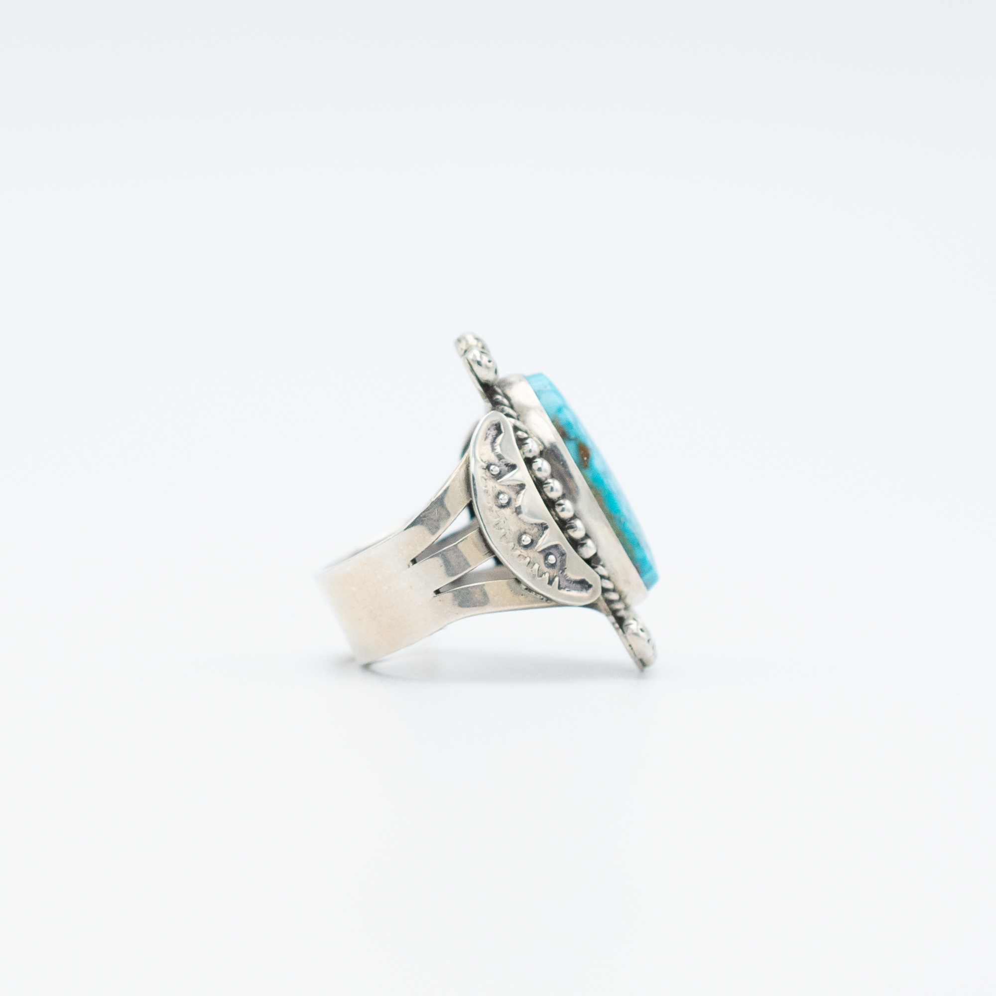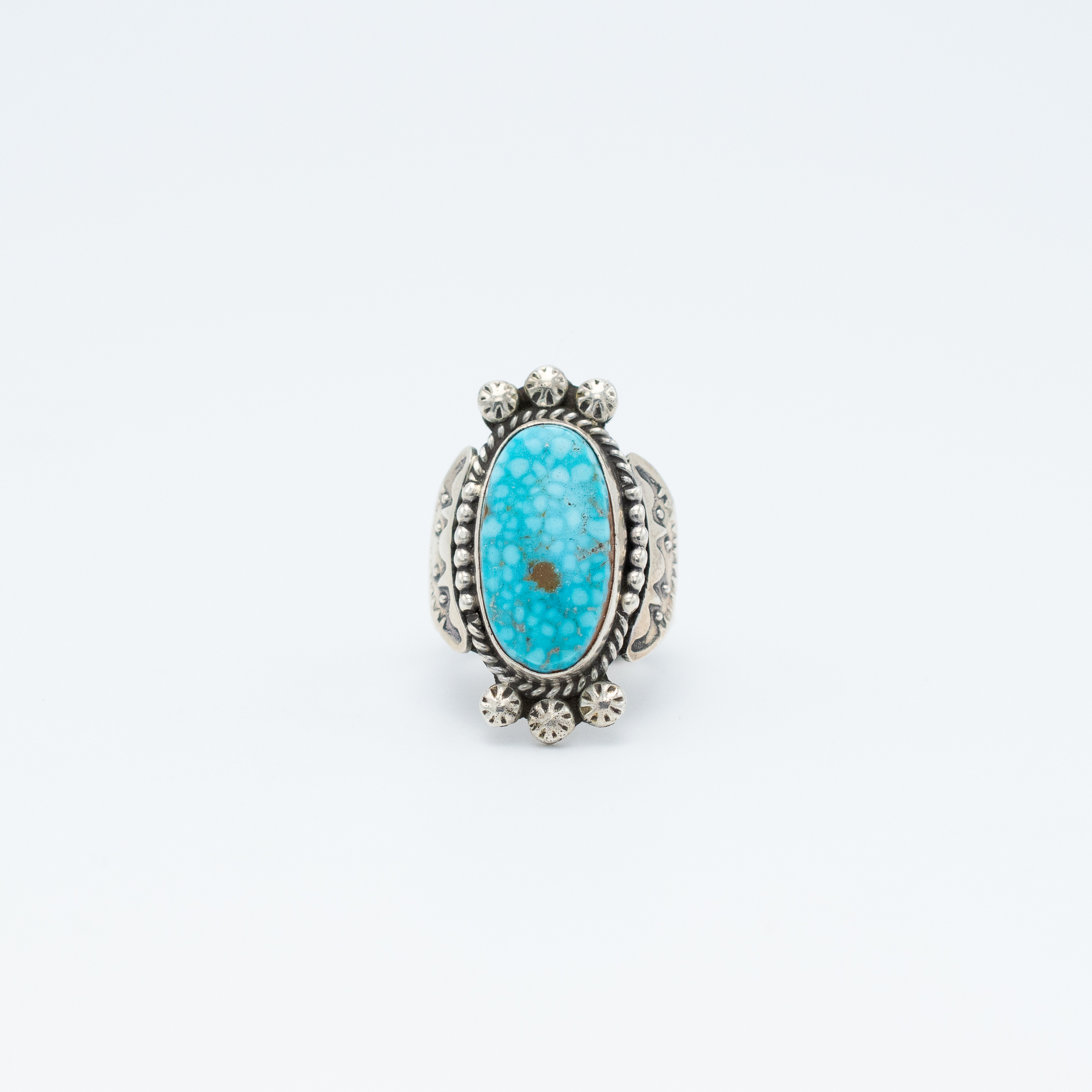 This Natural Bird’s Eye Kingman Turquoise Ring by Navajo artists Randy and Etta Endito features a striking oval stone with the distinctive speckled pattern that gives Bird’s Eye turquoise its name. Set in a polished sterling silver bezel and framed with traditional Navajo stampwork and silver drop accents, this bold design makes a statement while honoring timeless craftsmanship.