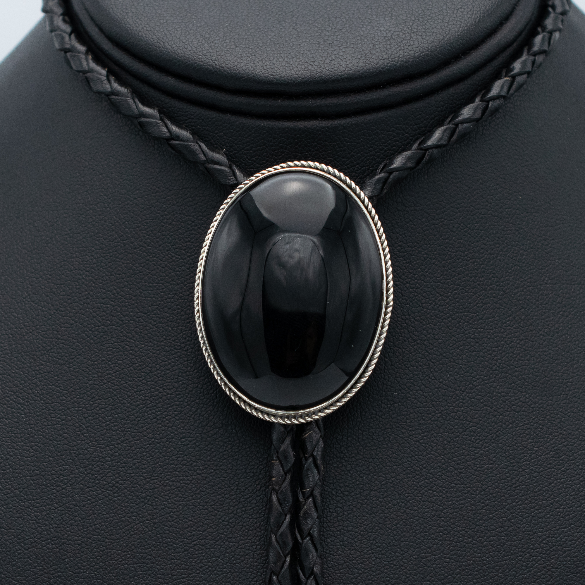 Add a bold statement to your look with this Black Onyx Bolo Tie by Navajo artist Bryant Martinez. The high-polish, oval black onyx stone is set in sterling silver with a rope border, offering a sleek and timeless appeal. Finished with braided leather and handmade sterling silver tips, this bolo tie blends classic Western style with handcrafted Native artistry.