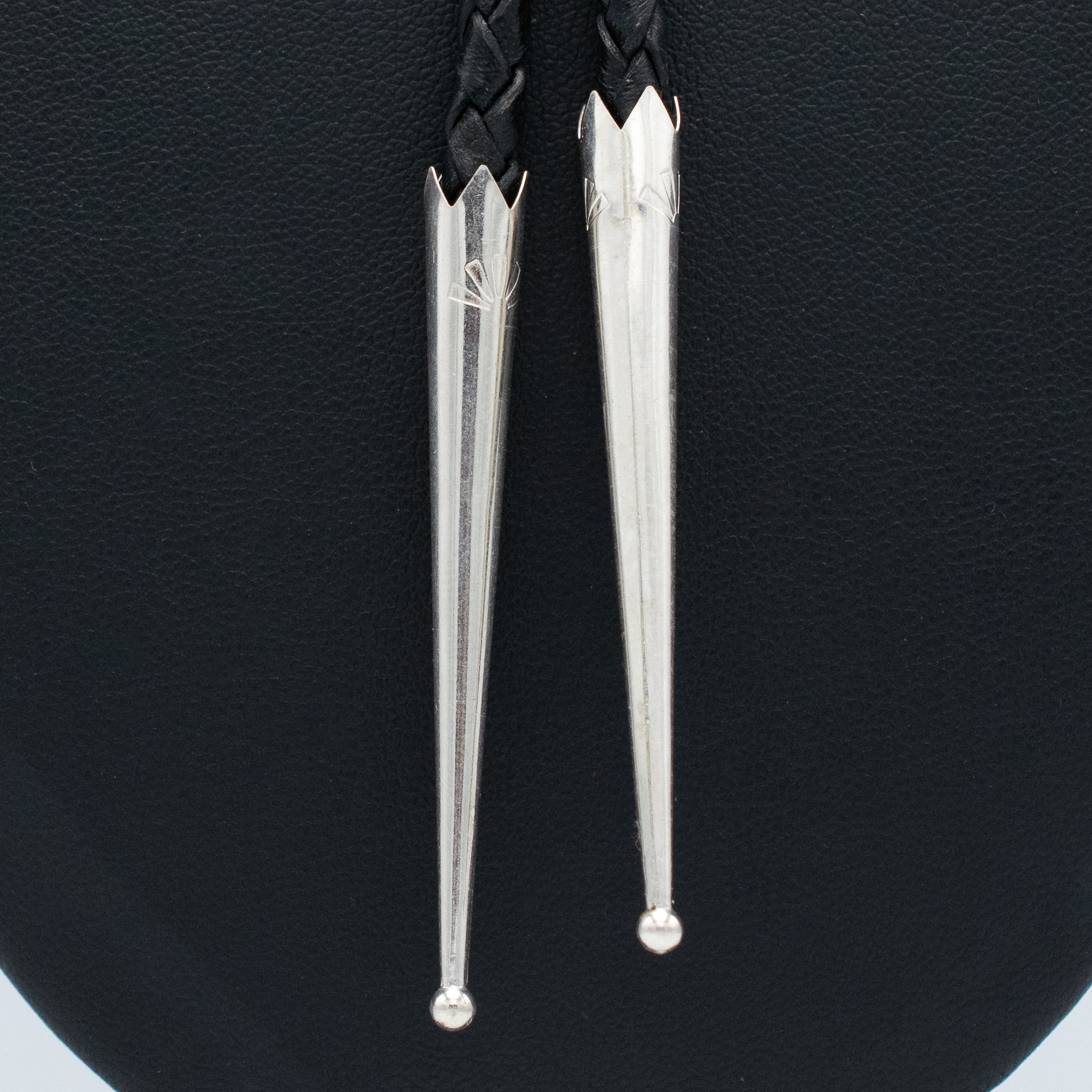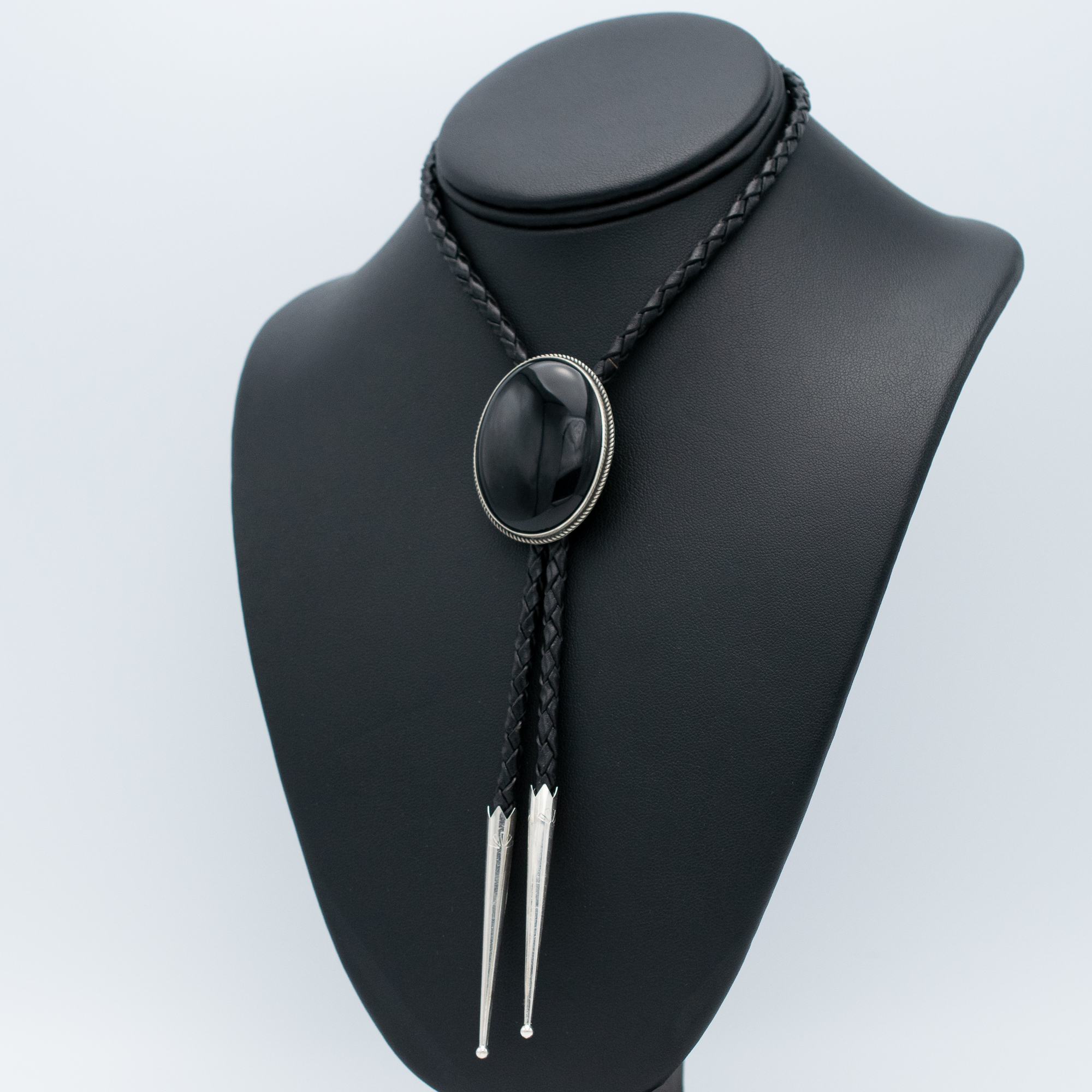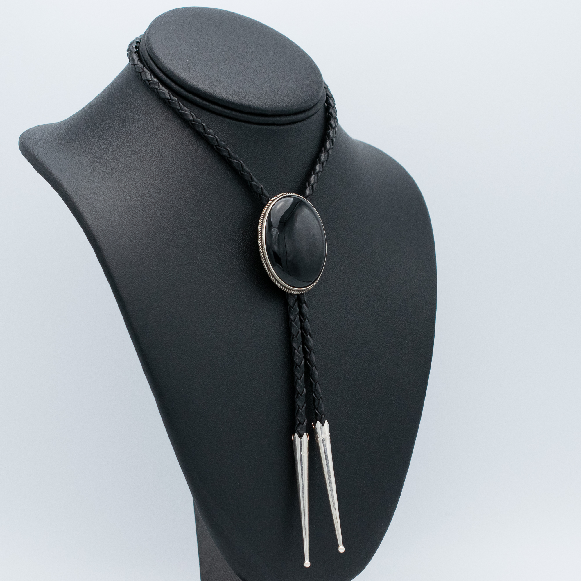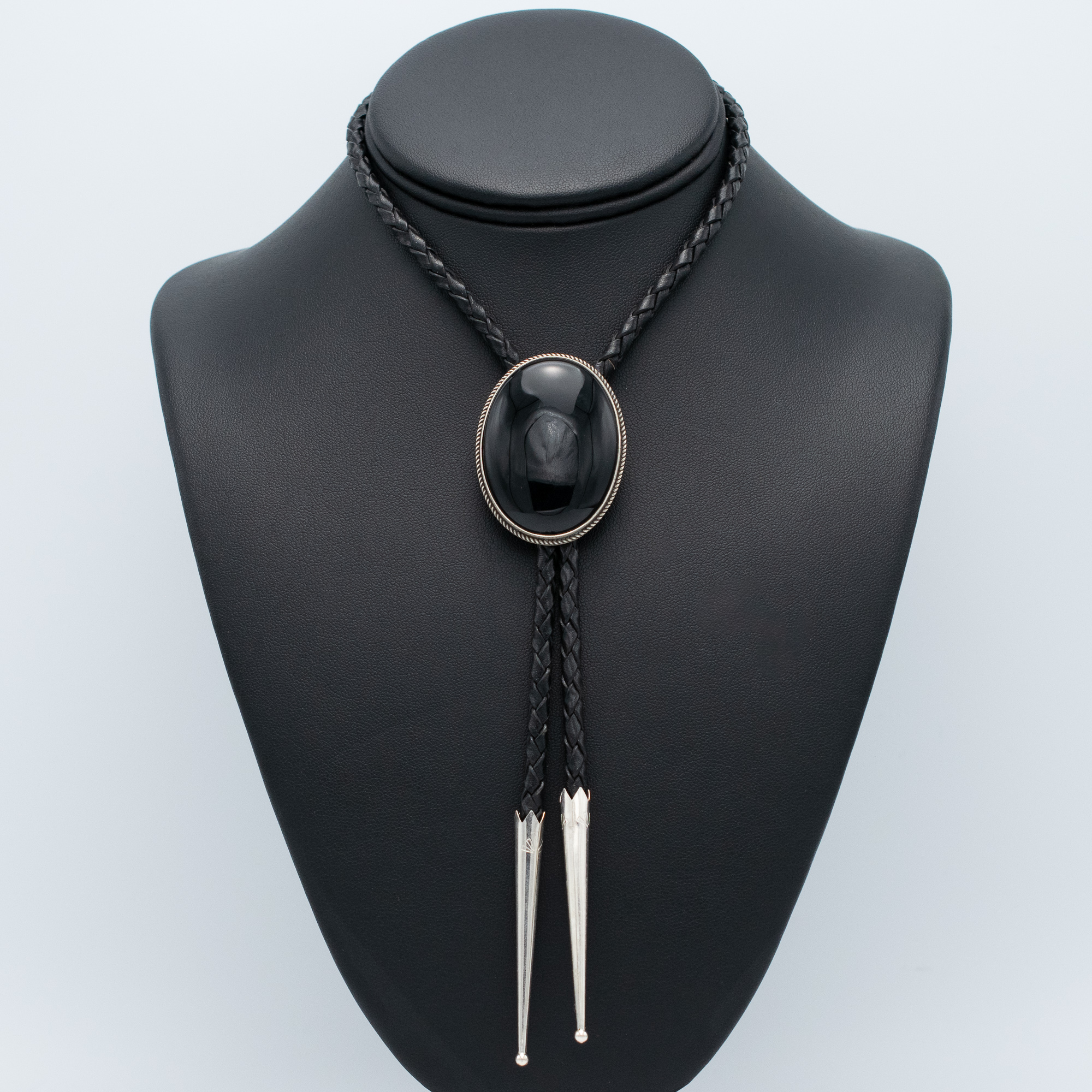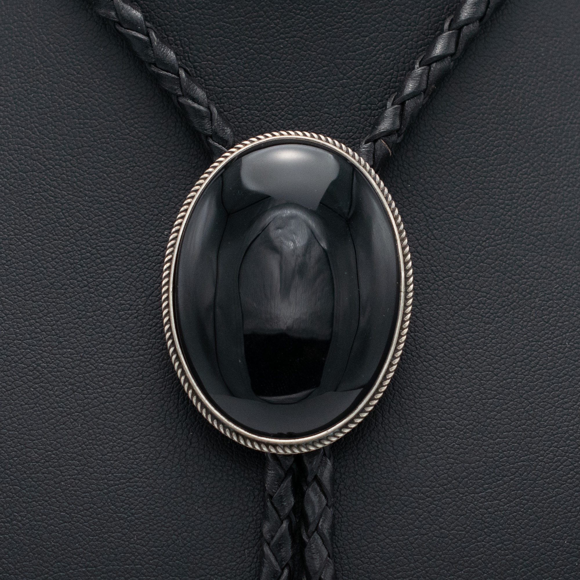 This classic Black Onyx Bolo Tie by Navajo artist Bryant Martinez features a bold oval cabochon set in a hand-stamped sterling silver bezel. The high-polish stone contrasts beautifully with the subtle detailing of the silver, while traditional bolo tips and braided leather add a timeless touch. A sleek, versatile piece that brings understated elegance to both formal and casual wear.