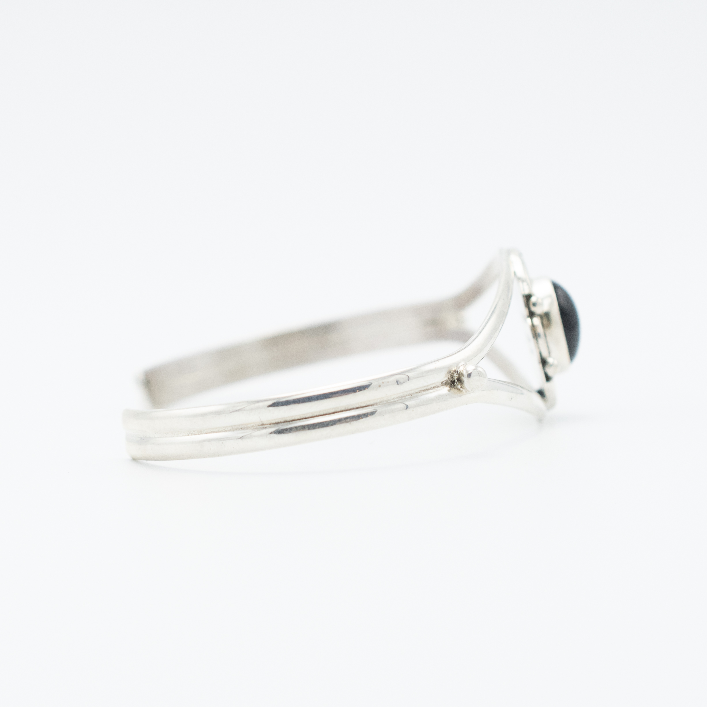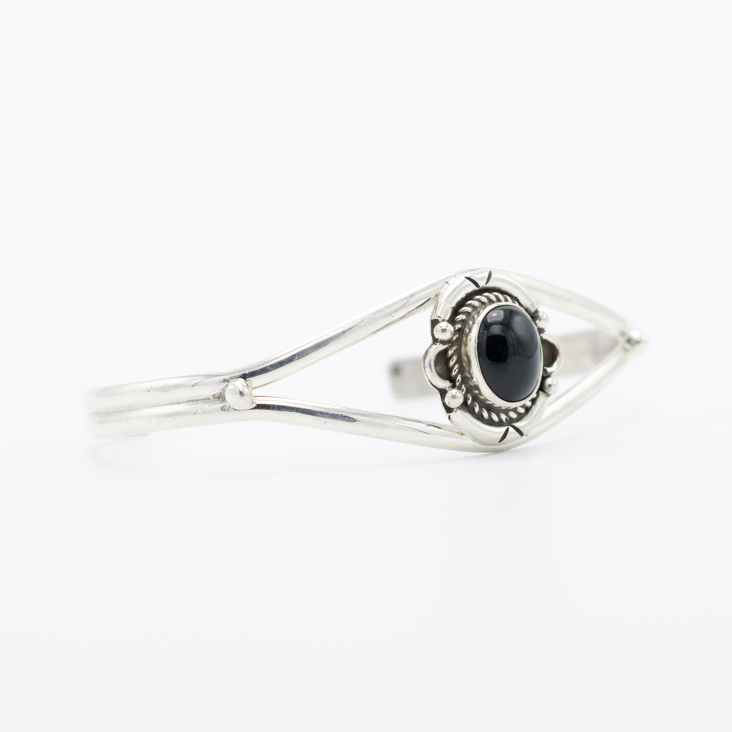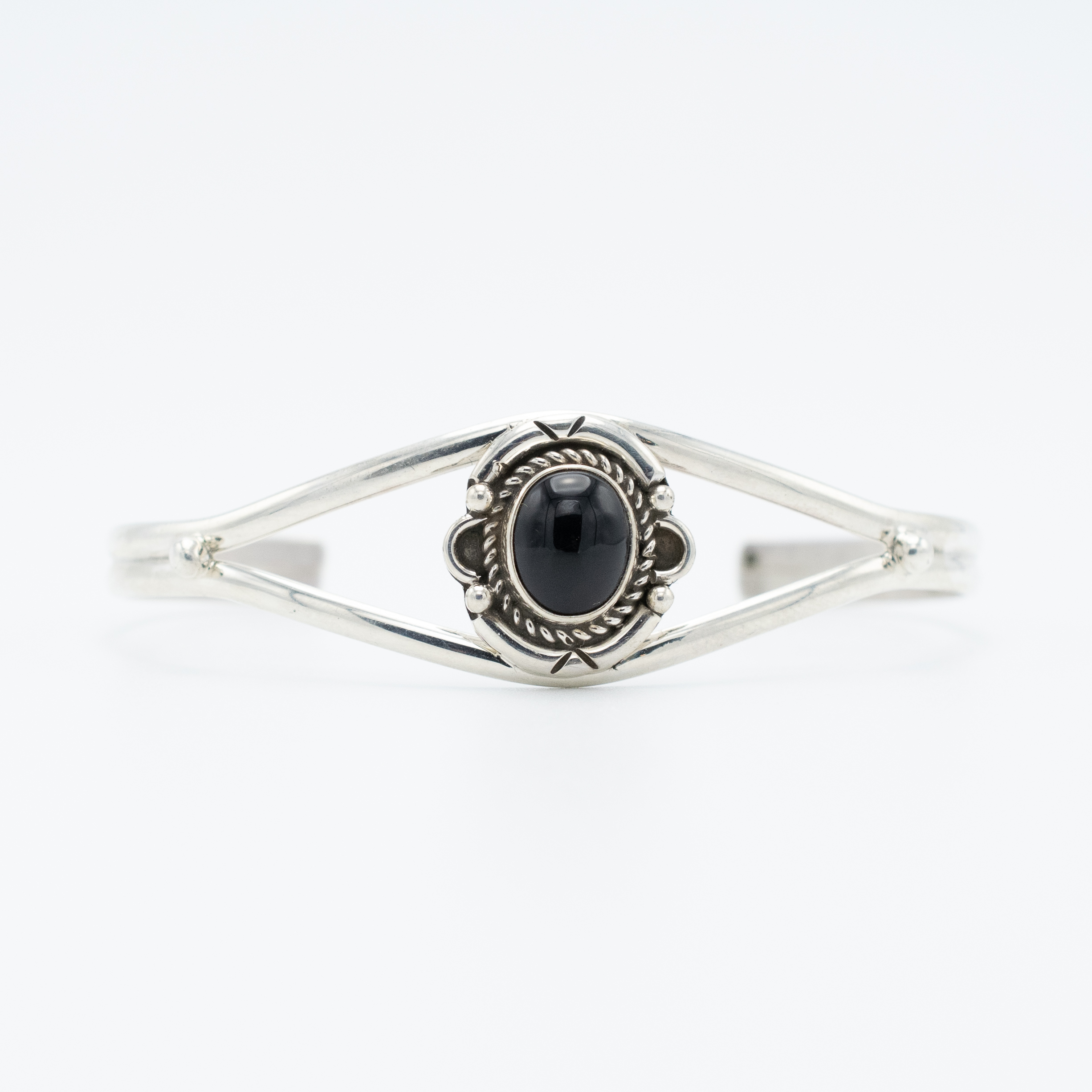 Add a touch of sleek sophistication to your look with this Black Onyx Bracelet by Navajo artist Ruth Ann Begay. The deep black onyx gemstone is set in sterling silver, highlighted by a twisted rope bezel and delicate silver bead accents. The open shank design allows for a comfortable fit while maintaining an elegant style. Perfect for adding a bold yet classic statement to any outfit.