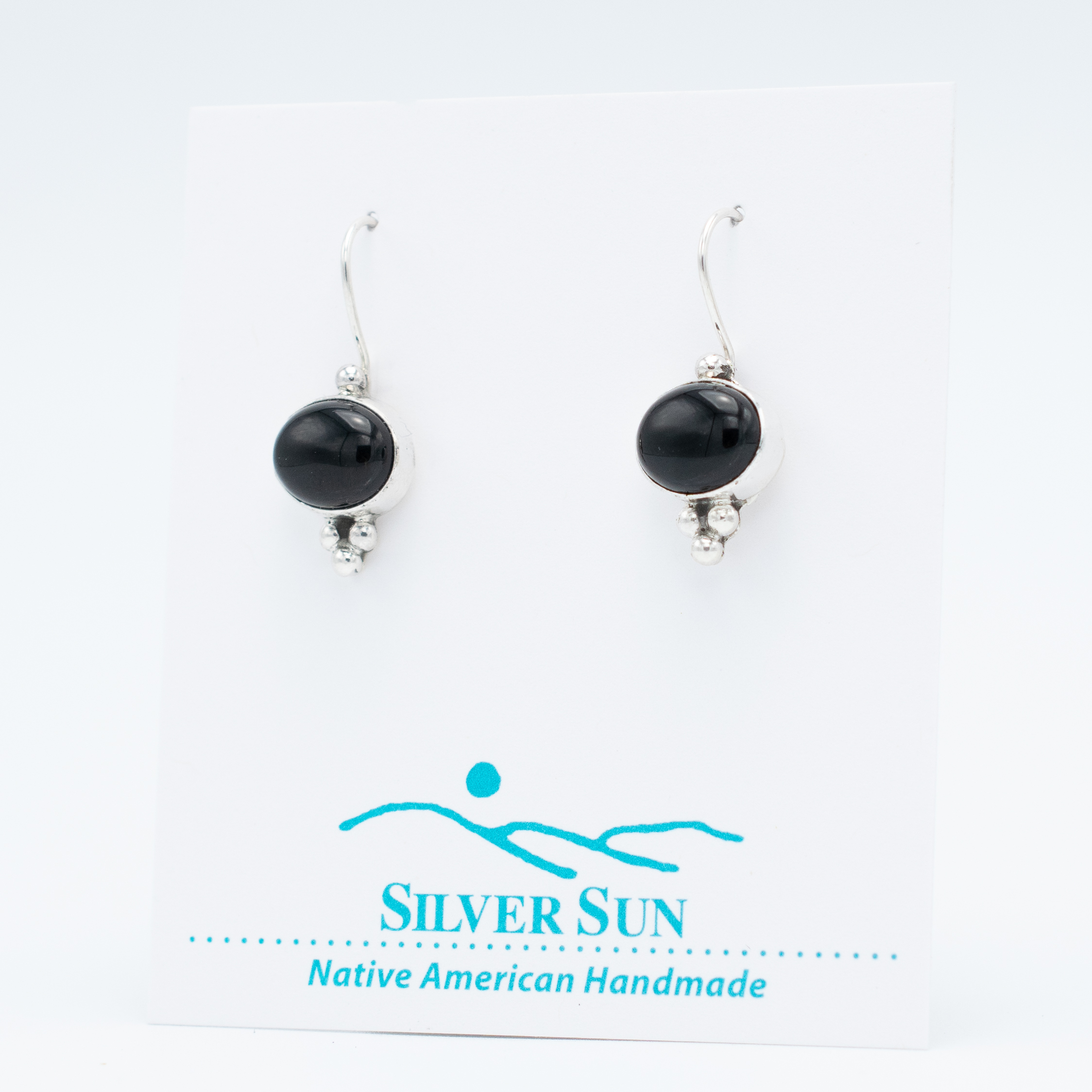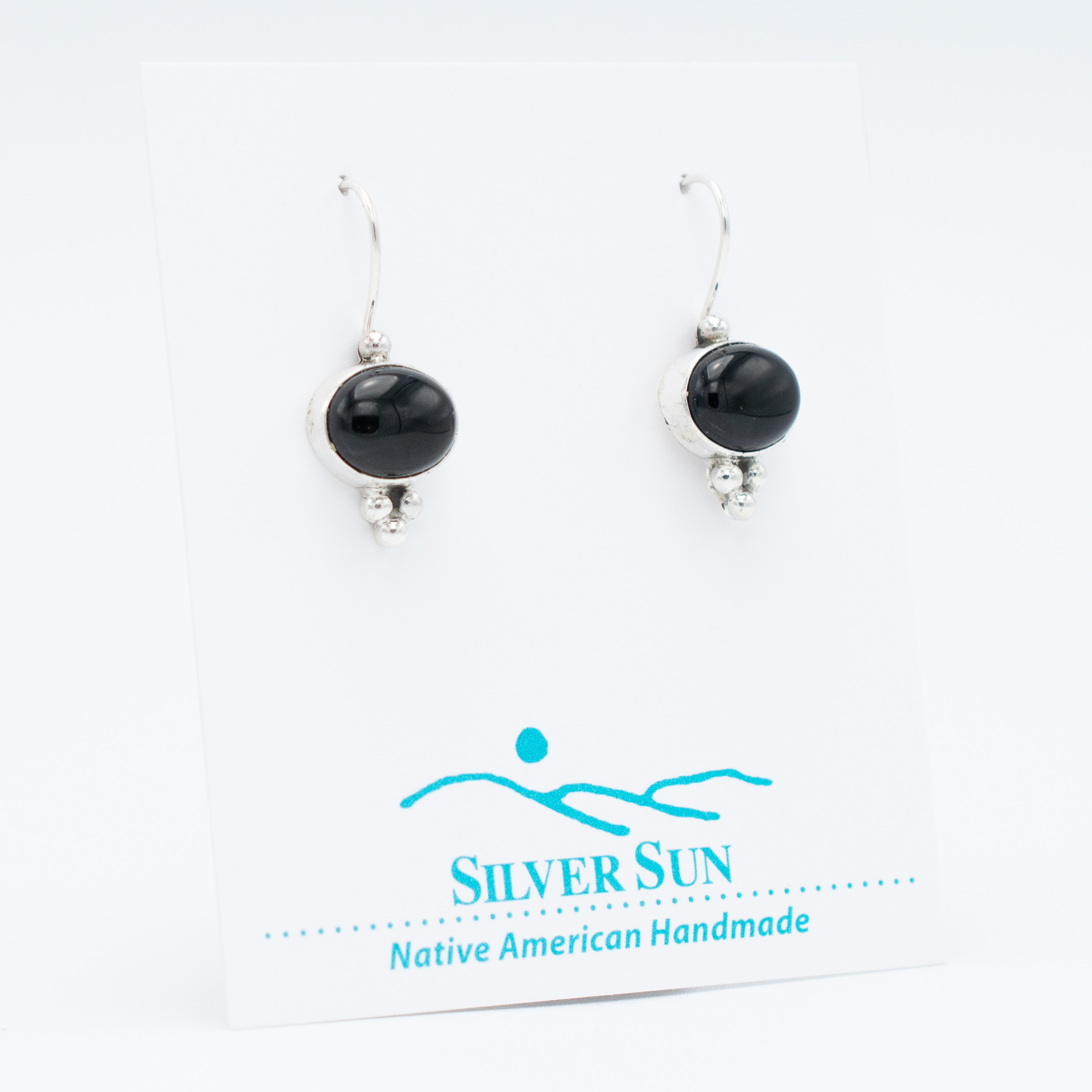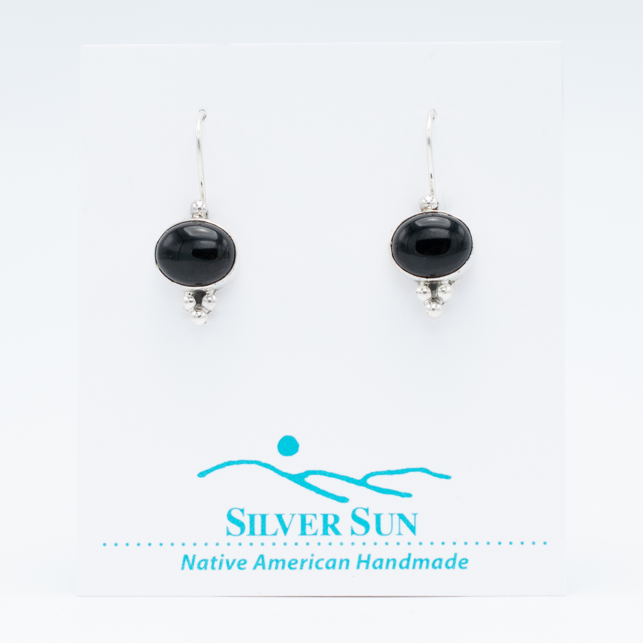 Highlight your style with these Black Onyx Earrings by Navajo artisan Ruth Ann Begay. Featuring sleek oval black onyx stones set in a plain bezel, these earrings are adorned with delicate silver raindrop details above and below the stones. Handcrafted with precision, these earrings offer a timeless and elegant accessory that effortlessly complements any outfit.