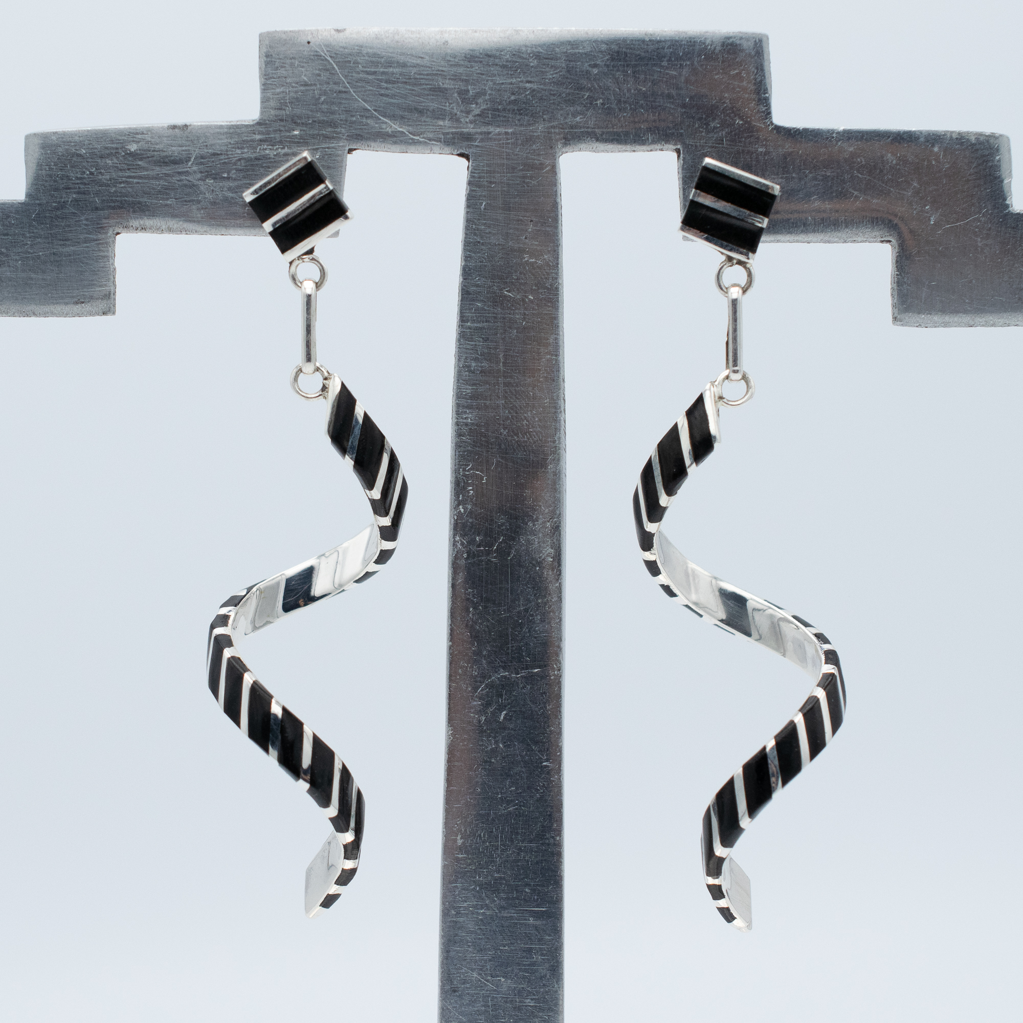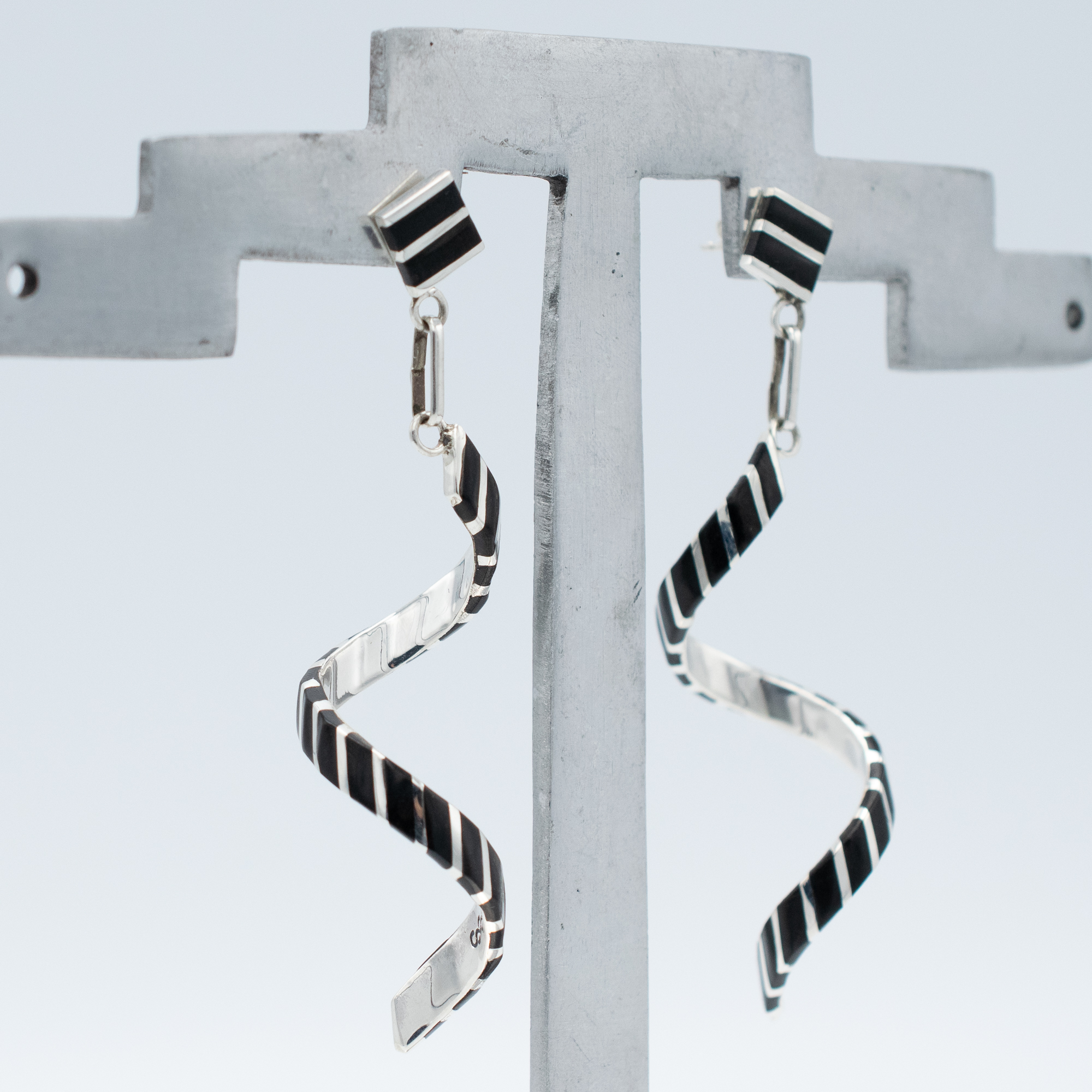 These striking Black Onyx Earrings by Zuni artist Shawn Sheyka showcase a bold, contemporary twist on traditional inlay work. Each earring features a flowing spiral of sterling silver accented with sleek black onyx in precise channel inlay, creating a dramatic ribbon-like movement as they sway. Handcrafted with exceptional attention to detail, they offer a modern, eye-catching style perfect for adding depth and elegance to any look.