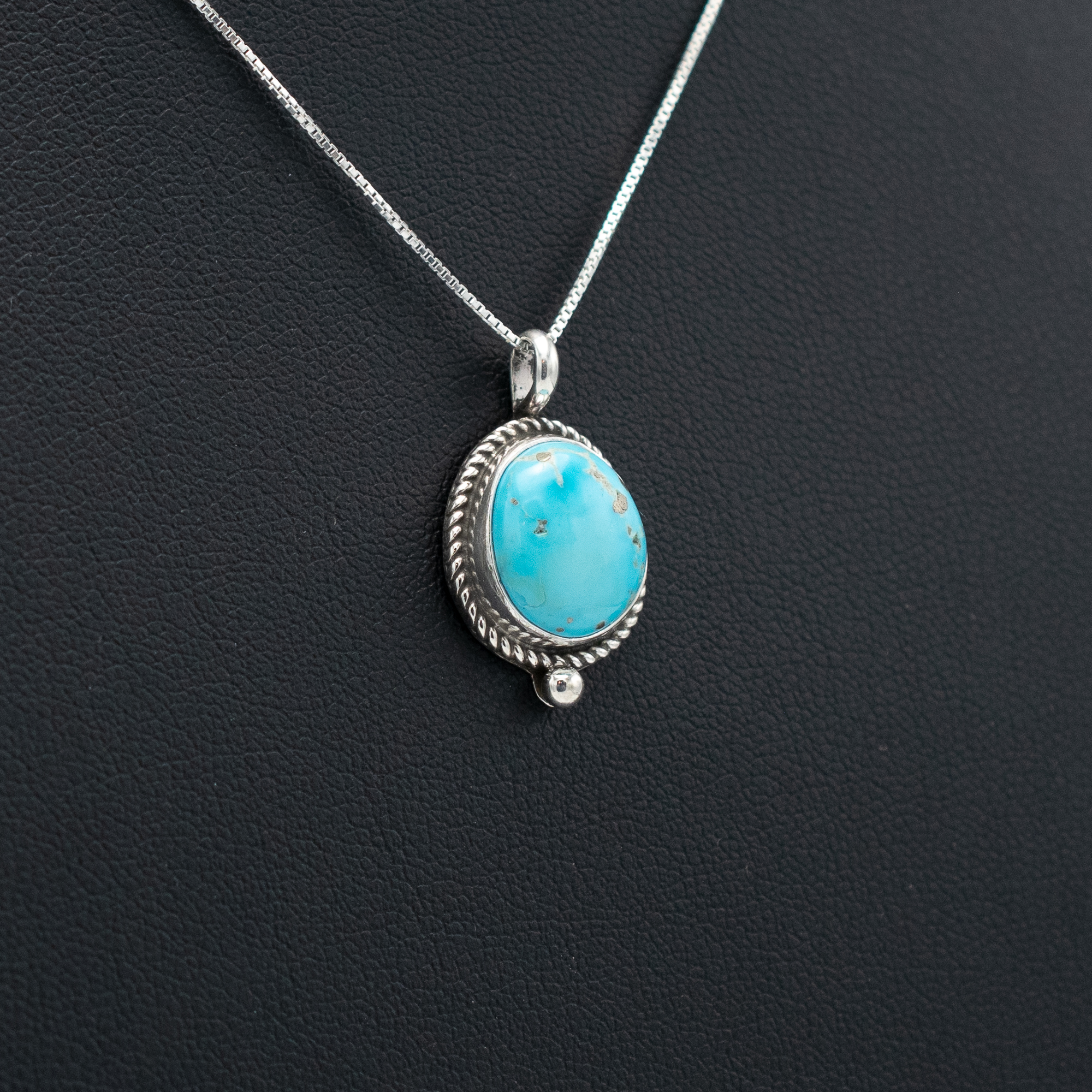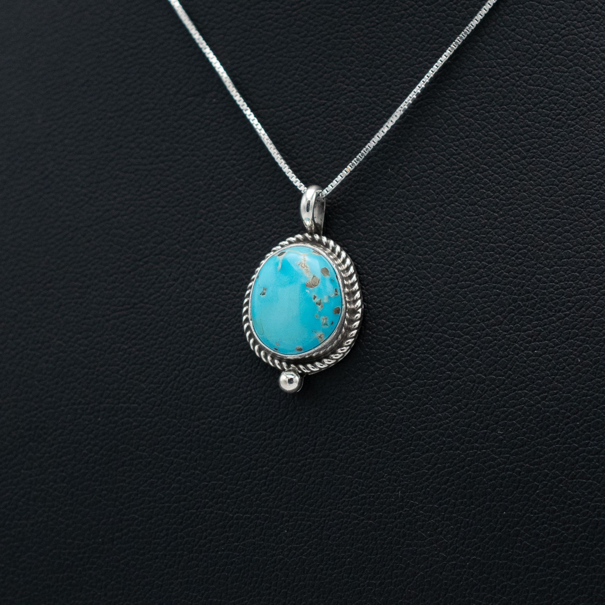 This Natural Blue Bird Turquoise Pendant by Navajo artist Ruth Ann Begay captures the serene beauty of the desert sky. The vibrant turquoise stone, framed in sterling silver with a twisted rope border and accented by a single silver drop, reflects Begay’s signature balance of simplicity and elegance. Each hand-set stone highlights the natural color and character of Blue Bird turquoise. A timeless piece that embodies traditional Navajo craftsmanship and enduring Southwestern style.