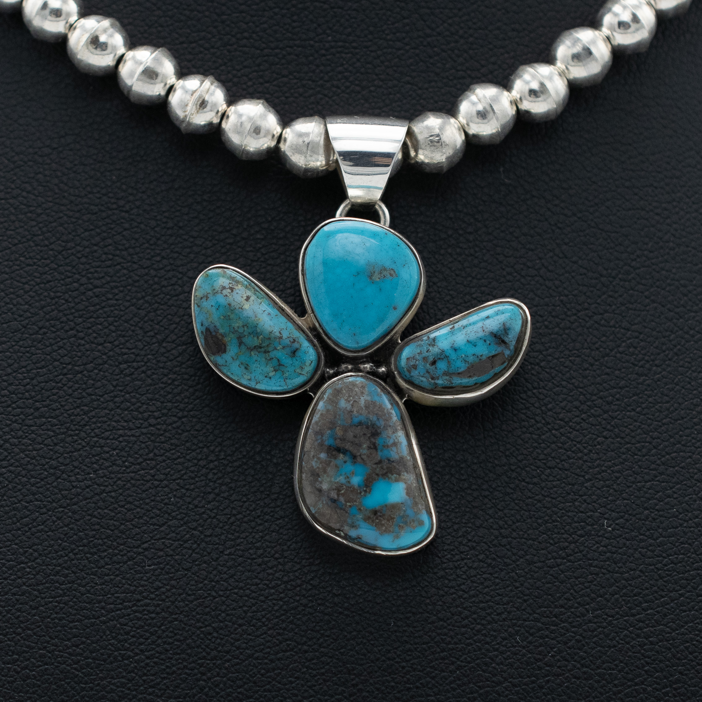 This Blue Diamond Turquoise Hugs Pendant by Navajo artist Bryant Martinez brings together unique turquoise stones in a striking embrace design. The organic shapes and rich hues of the stones are beautifully framed in sterling silver, creating a pendant that radiates warmth and elegance. A perfect statement piece for any collection.