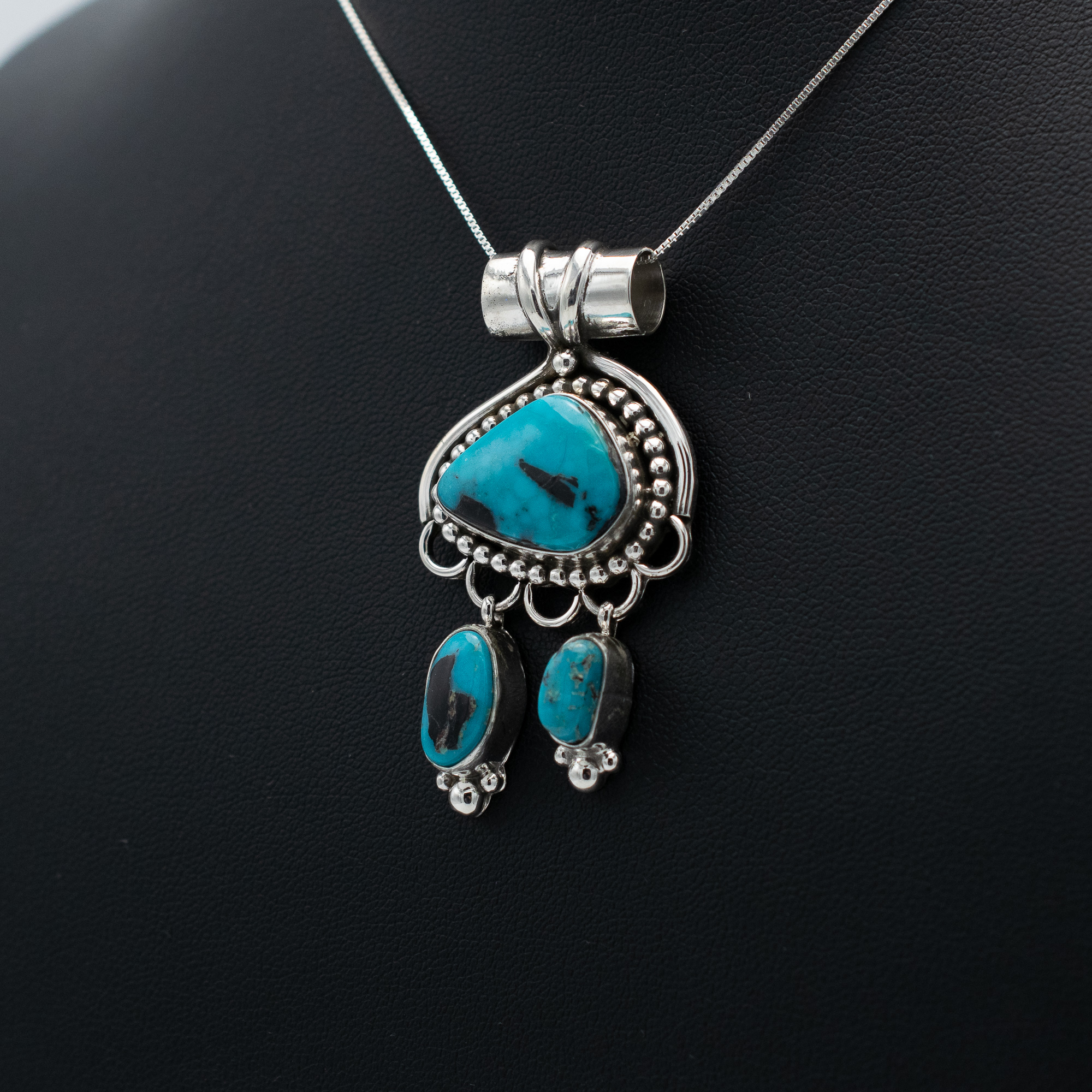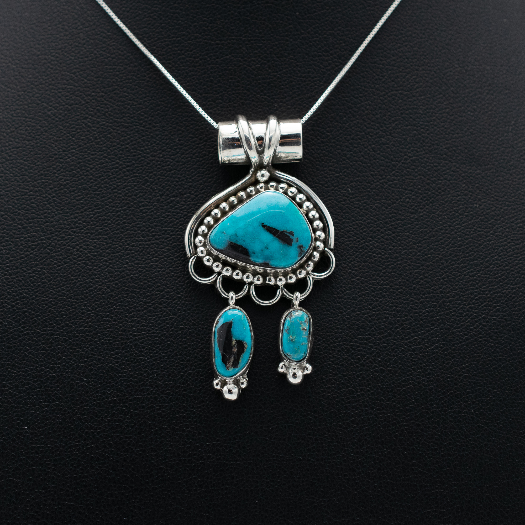 This Natural Blue Diamond Turquoise Pendant by Navajo artist Ruth Ann Begay features a striking arrangement of vibrant turquoise stones with dramatic black matrix. The asymmetrical top stone is framed by handcrafted sterling silver beading, while two dangles below add movement and elegance. Each turquoise cabochon is set in a smooth bezel and accented with silver drops for a balanced, contemporary look. Bold yet wearable, this pendant is a beautiful expression of traditional craftsmanship and natural beauty.
