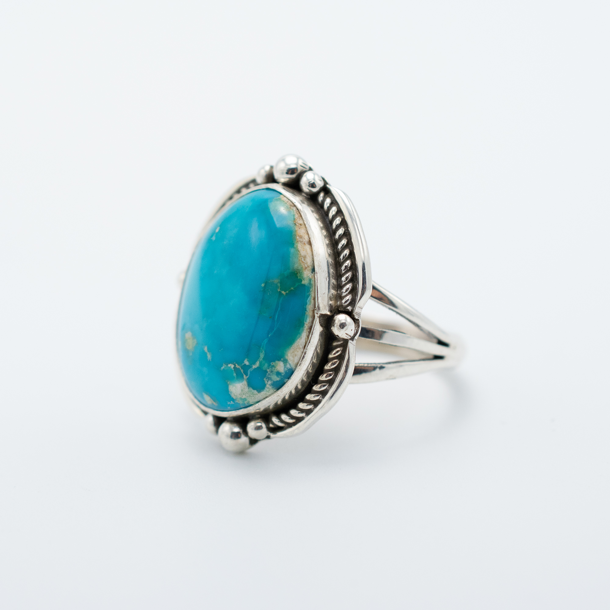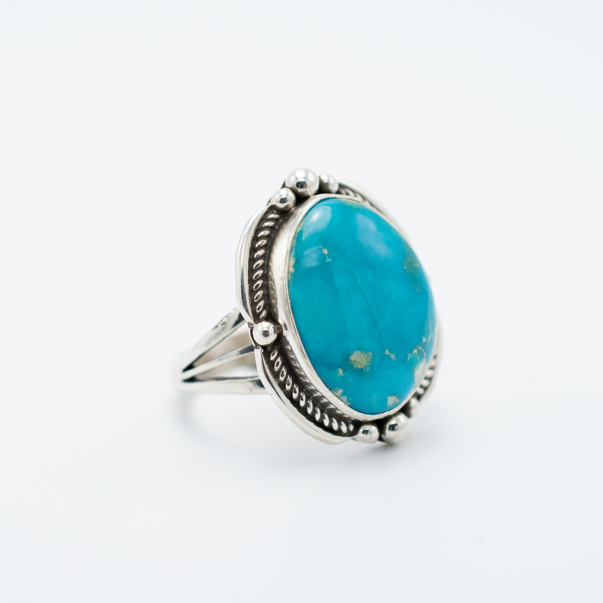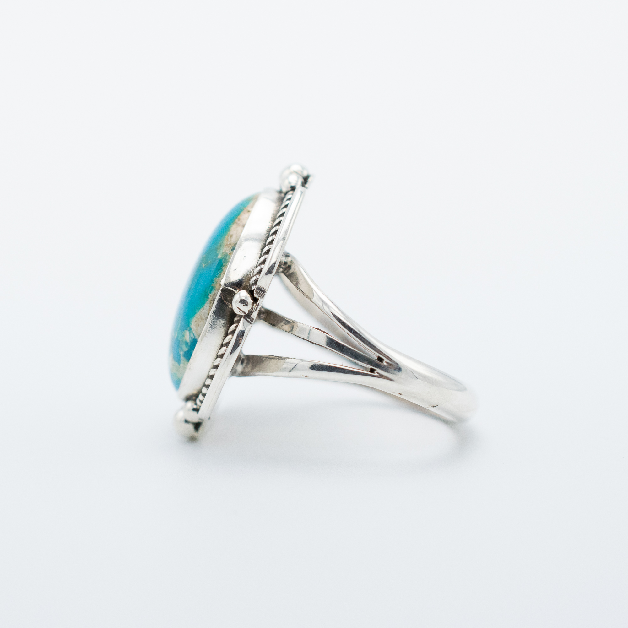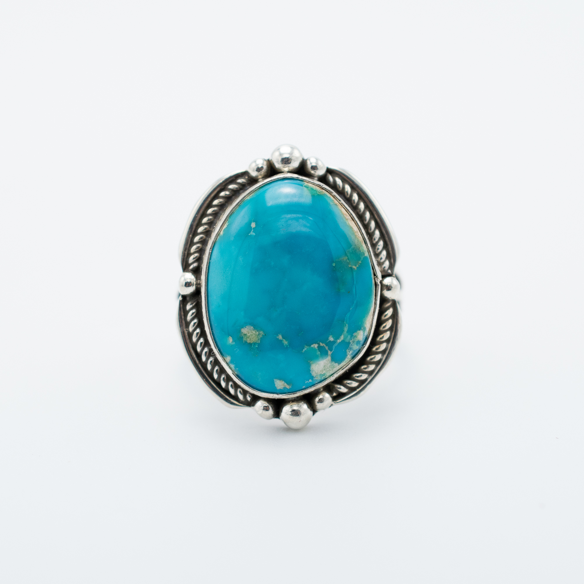 This Blue Gem Turquoise Ring by Navajo artist Ruth Ann Begay showcases a bold, natural stone in vivid sky blue with hints of golden matrix. Framed by sterling silver rope detail and hand-stamped accents, the setting adds a sense of vintage charm to the vibrant centerpiece. Handcrafted with care, this ring is a timeless expression of Southwestern artistry.