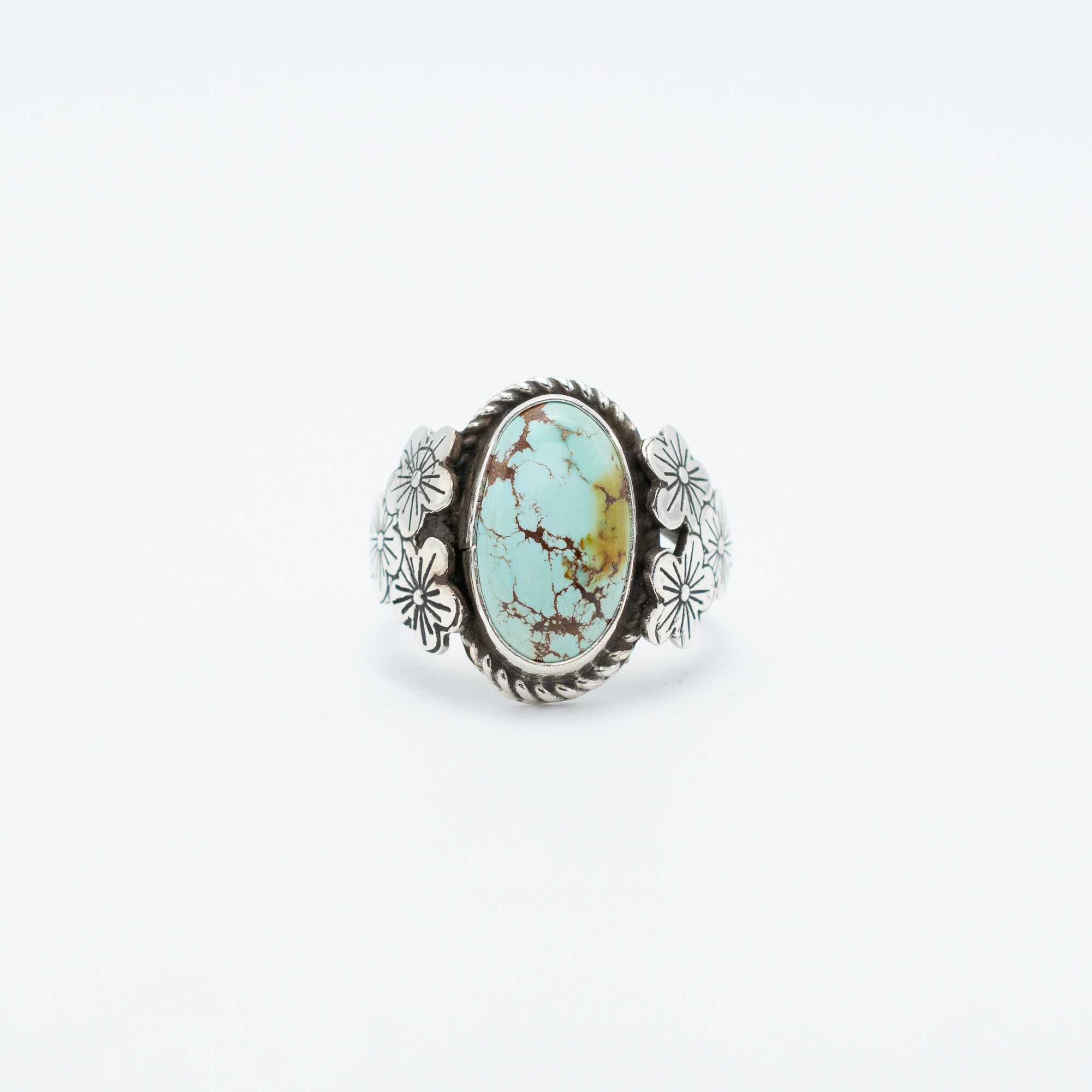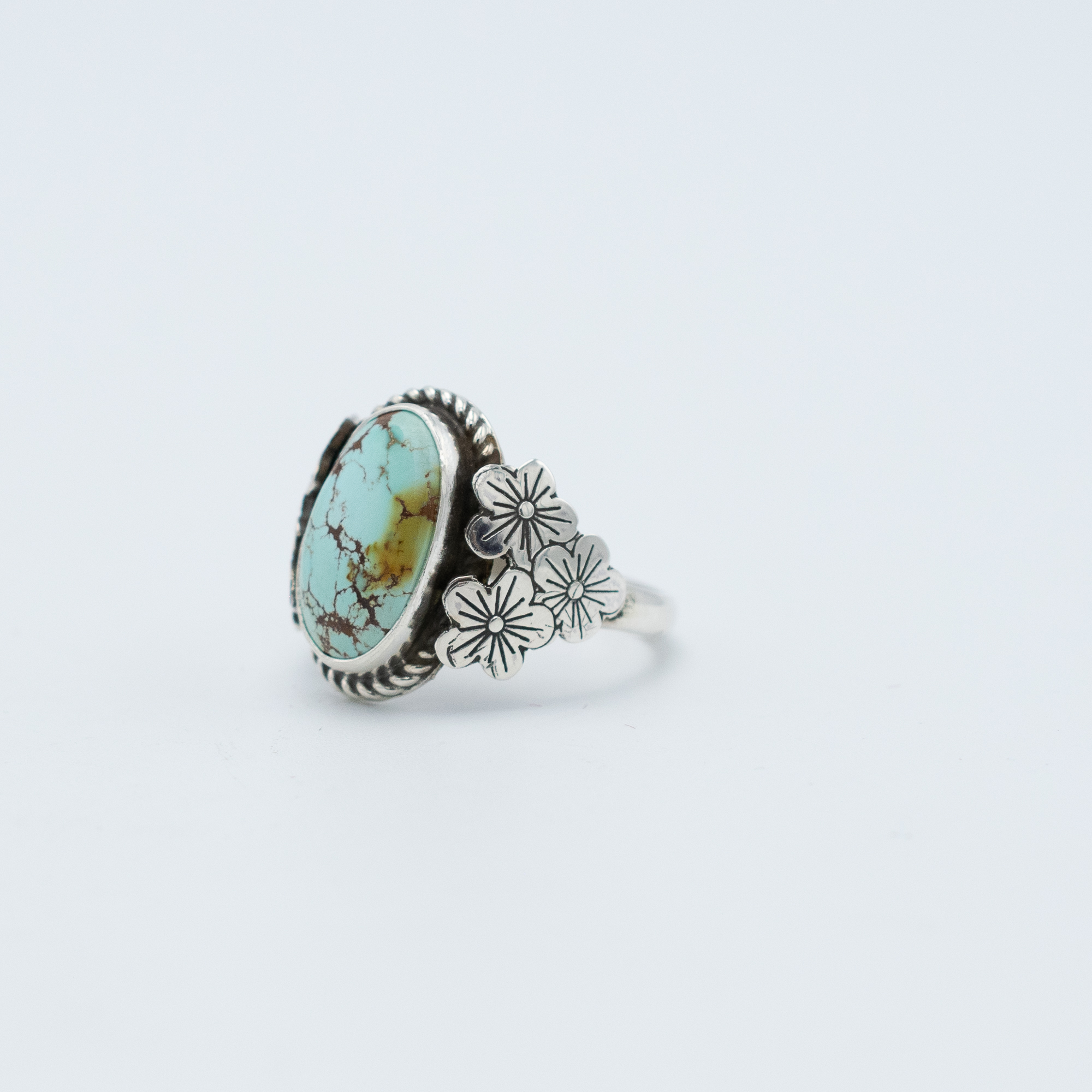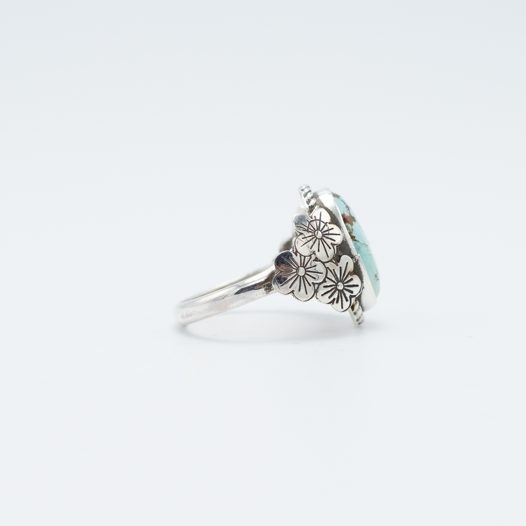 This Natural Blue Gem Turquoise Ring by Navajo artist Ruth Ann Begay highlights a striking pale blue stone with intricate brown webbing, characteristic of the historic Nevada mine. The turquoise is framed in a hand-twisted sterling silver bezel and accented with delicately stamped silver blossoms on each side. Blending a feminine floral motif with traditional Navajo craftsmanship, this ring is both bold and graceful, a true celebration of natural beauty and fine silversmithing.