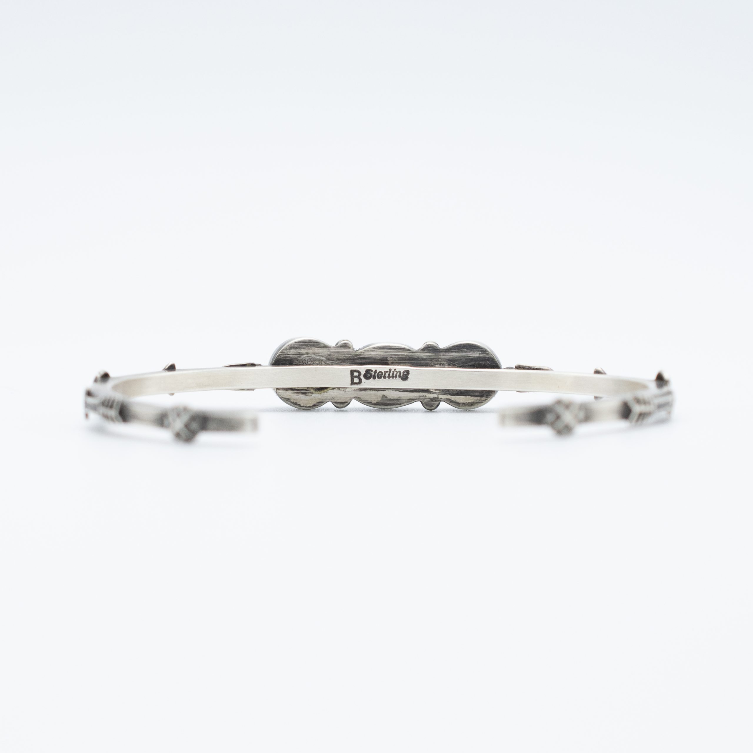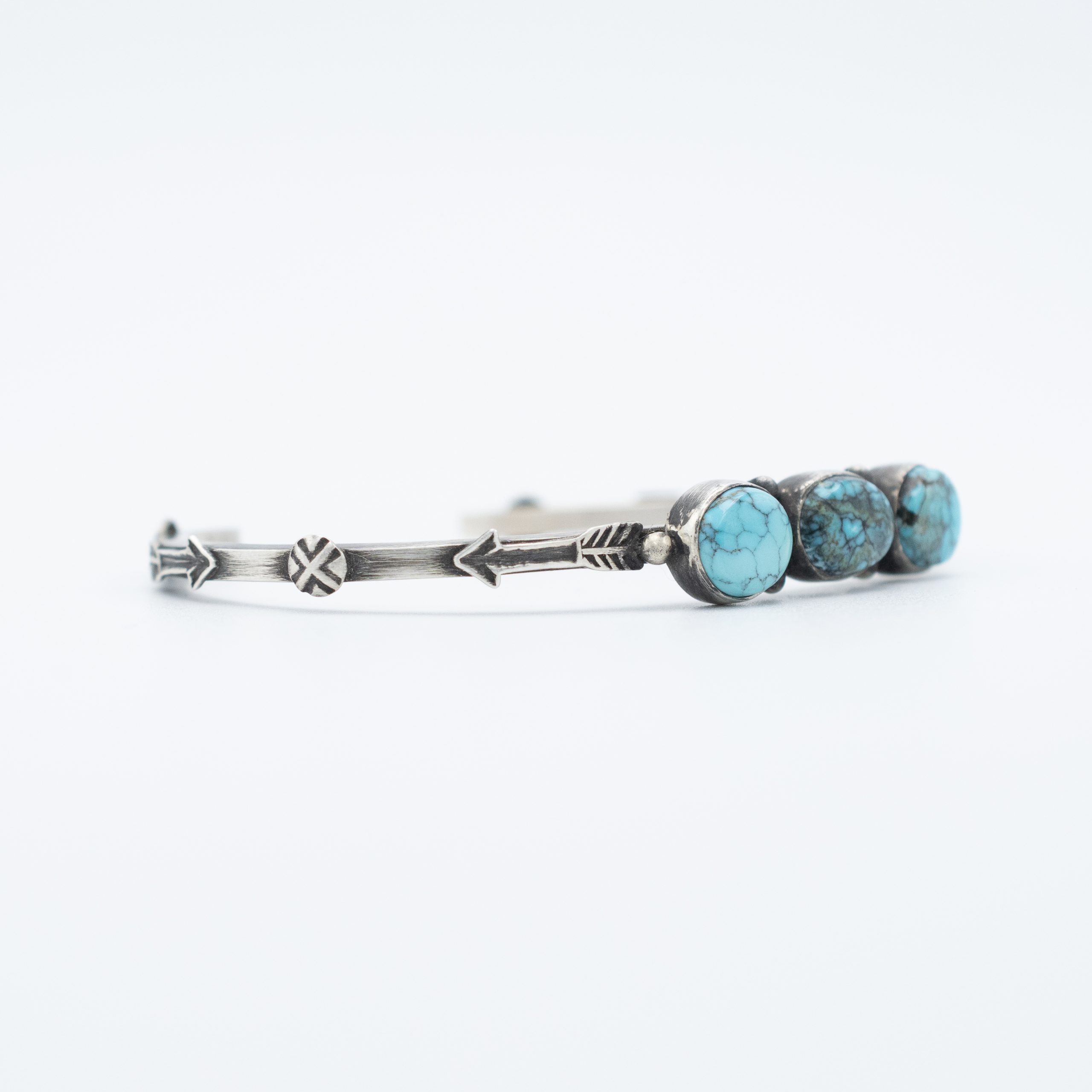 This elegant Blue Moon Turquoise Applique Bracelet by Navajo artist Bryant Martinez, features three beautifully set turquoise stones in varying shades of blue with natural matrix patterns. Each stone is framed in sterling silver, and the slender shank is adorned with hand-stamped arrow designs, adding a touch of intricate detail and a nod to traditional Native American artistry. The delicate size and balanced arrangement of the stones make this bracelet a perfect choice for layering or wearing solo as a refined, everyday piece that adds a hint of Southwestern charm to any outfit.