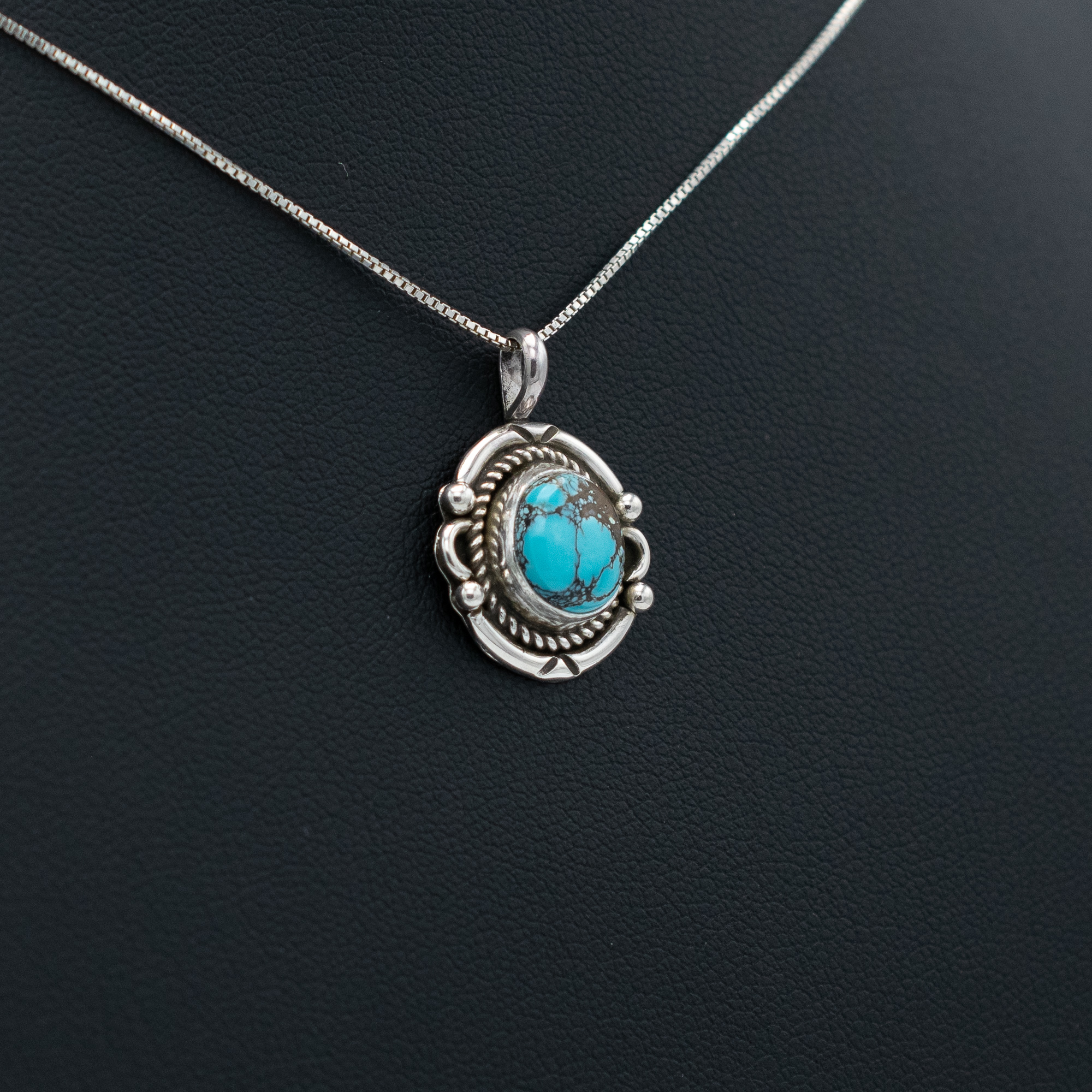 Framed in intricate sterling silver, this Natural Blue Moon Turquoise Pendant by Navajo artist Ruth Ann Begay showcases the beauty of the stone’s delicate webbed matrix. The soft blue hues, accented with rich veins, make each pendant a miniature work of nature’s artistry. The ornate silverwork adds a touch of elegance, creating a timeless piece that effortlessly blends traditional craftsmanship with contemporary charm.