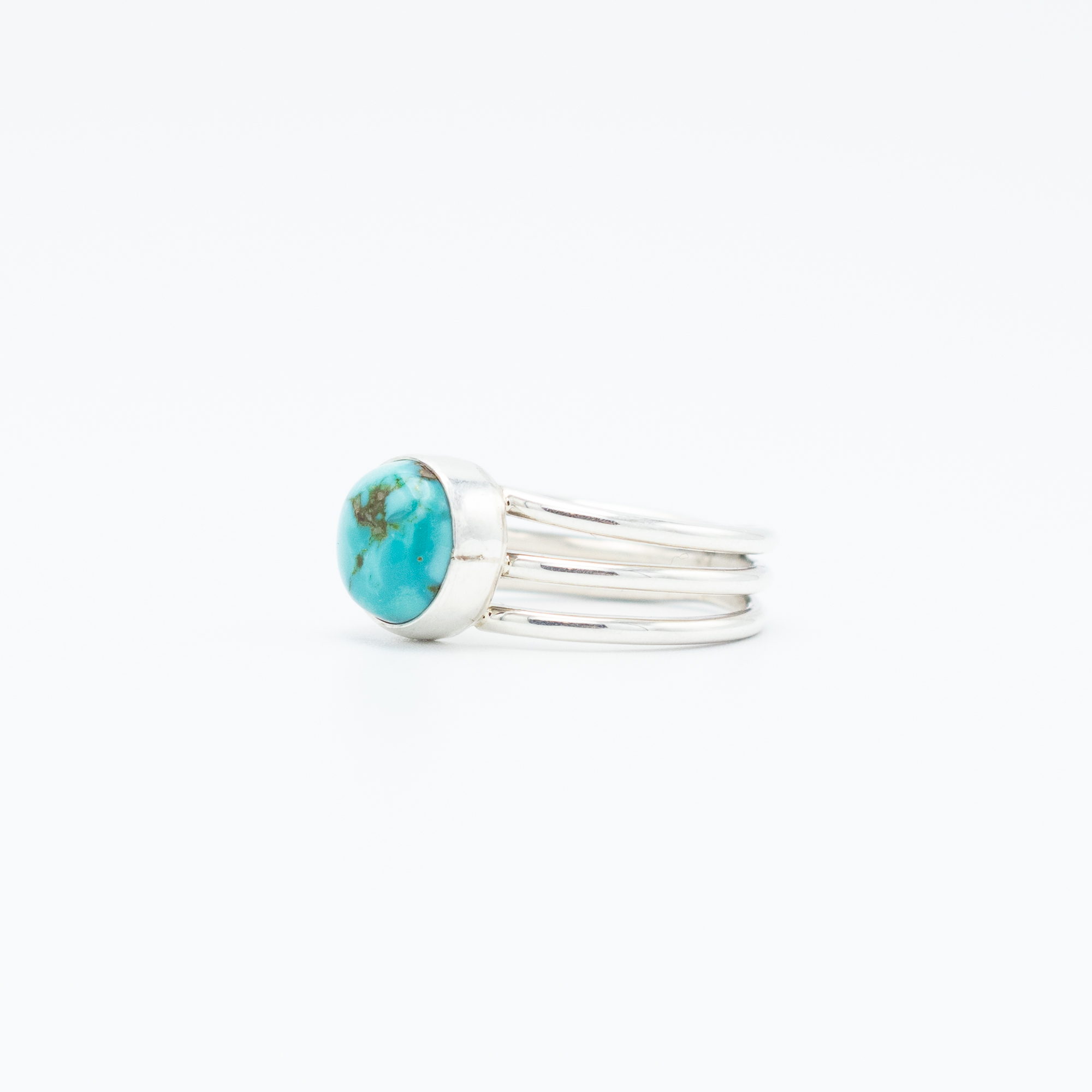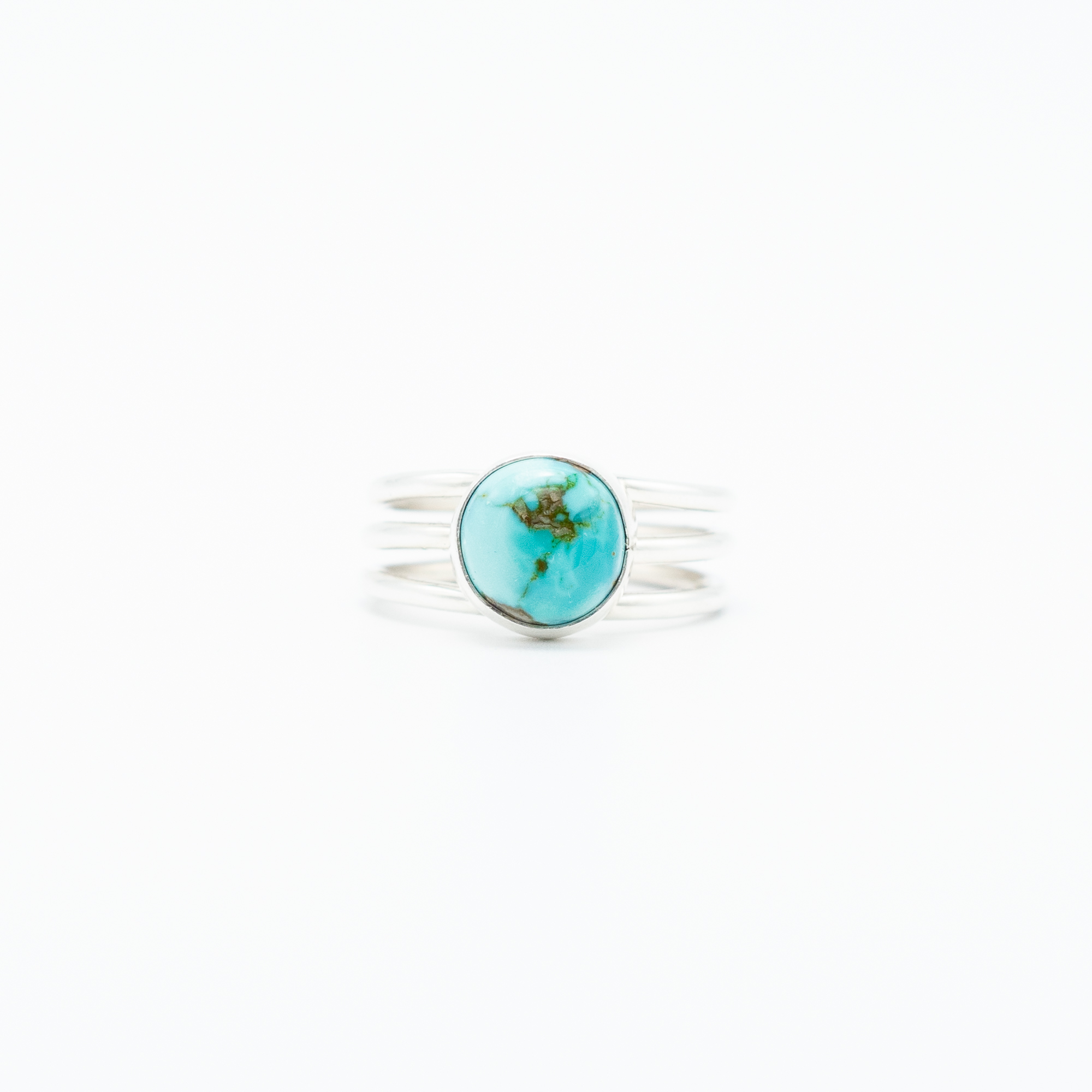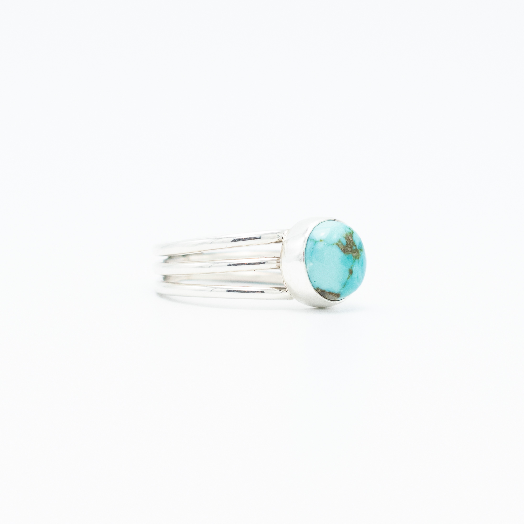 This ring by Navajo artist Bryant Martinez showcases a stunning natural Blue Moon turquoise stone, set in a sleek sterling silver band. The stone’s sky-blue hue with intricate matrix patterns is accentuated by the ring’s delicate four-band shank, offering a contemporary yet timeless aesthetic. Handmade with precision and care, this ring is a perfect blend of traditional Native American craftsmanship and modern style.