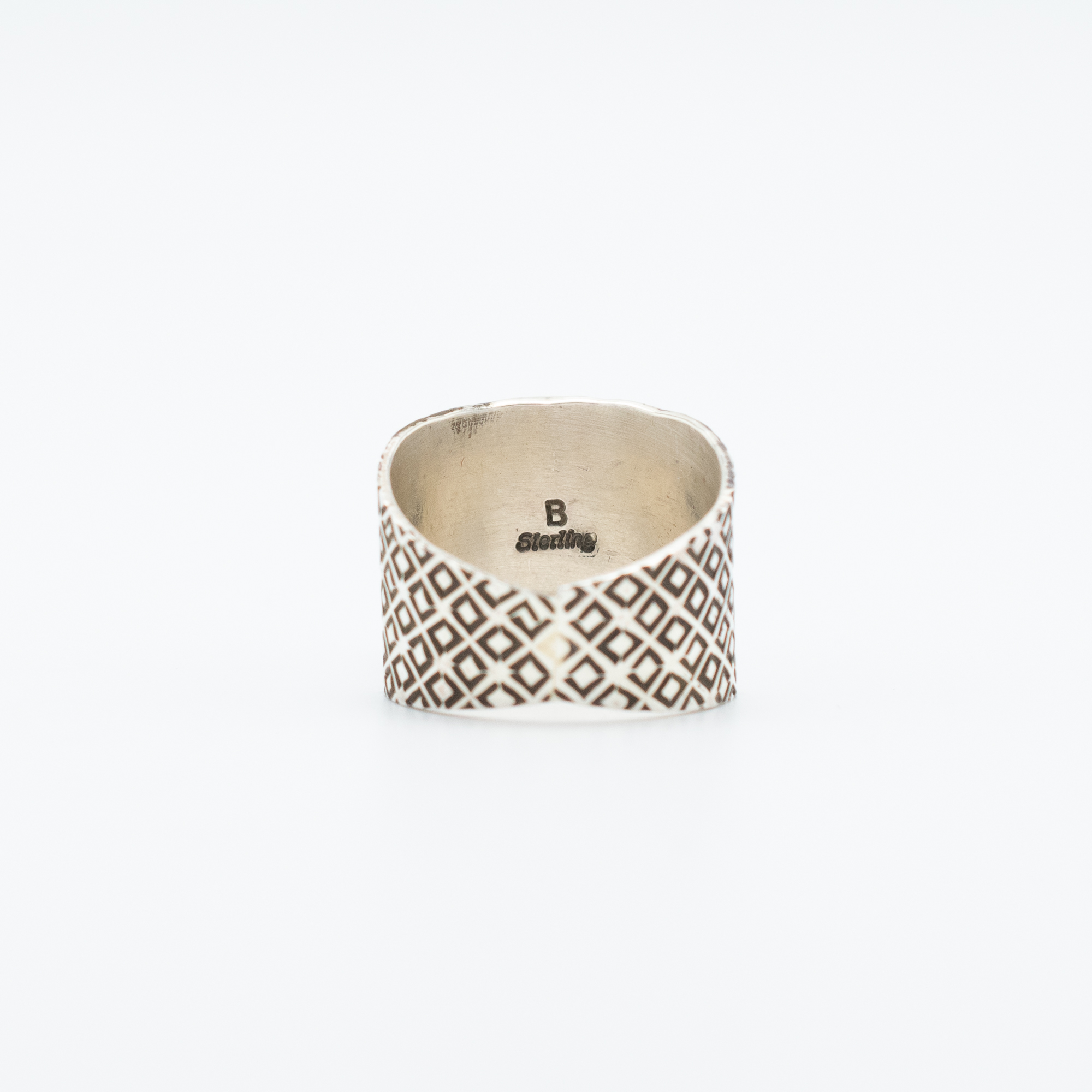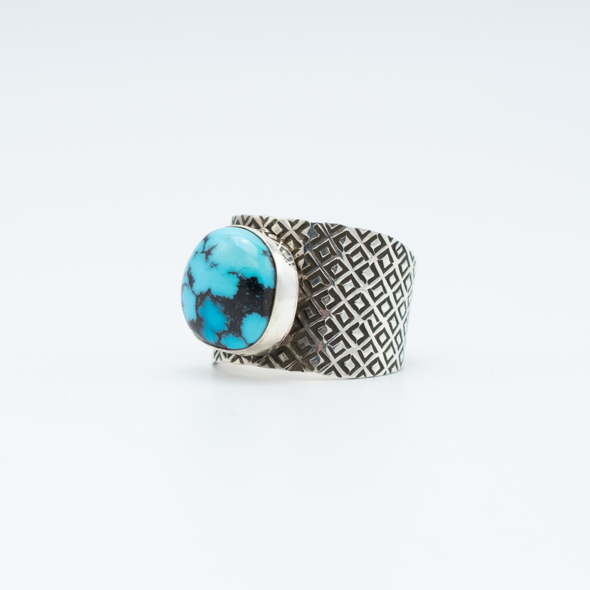 This Natural Blue Moon Turquoise Ring by Navajo artist Bryant Martinez features a captivating sky blue stone with bold dark matrix. Set on a wide sterling silver band with intricate geometric stamp work, this ring offers a striking blend of modern and traditional design. A true standout piece for any turquoise lover.
