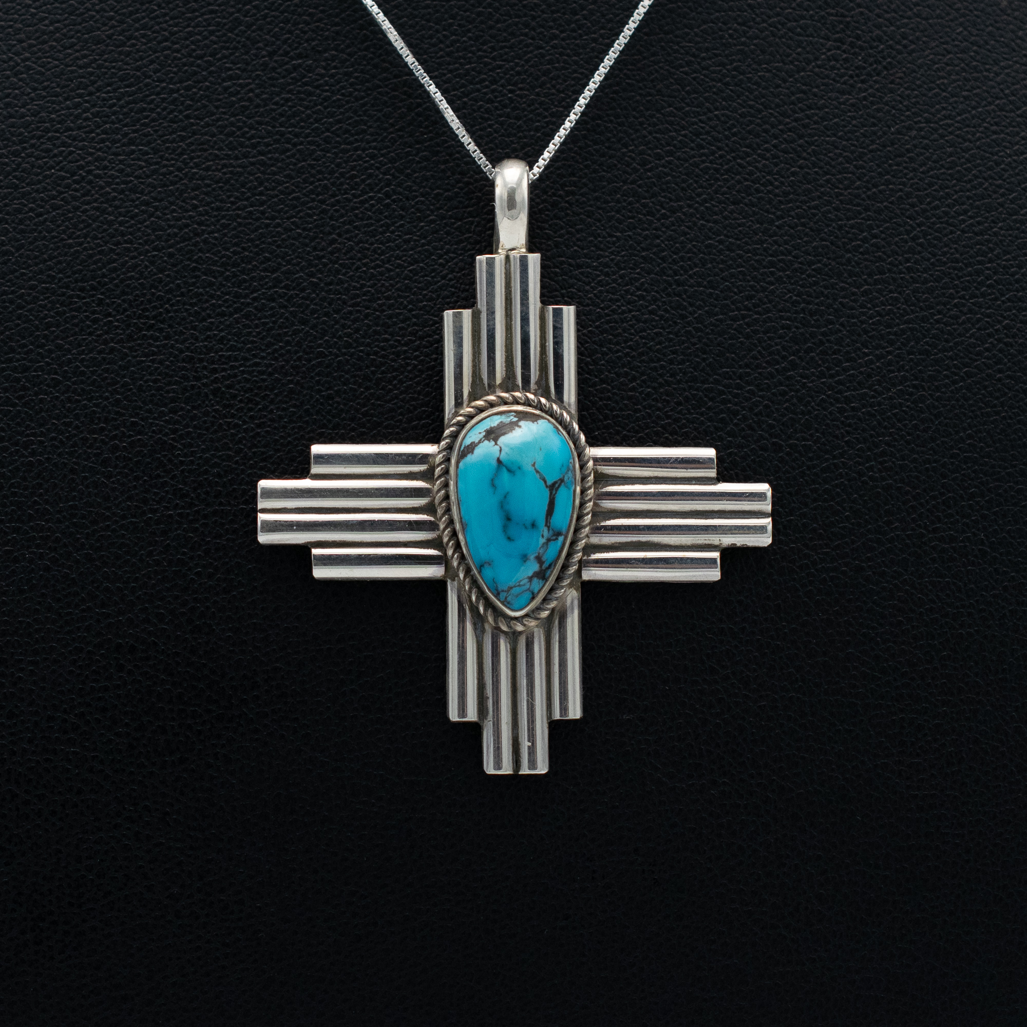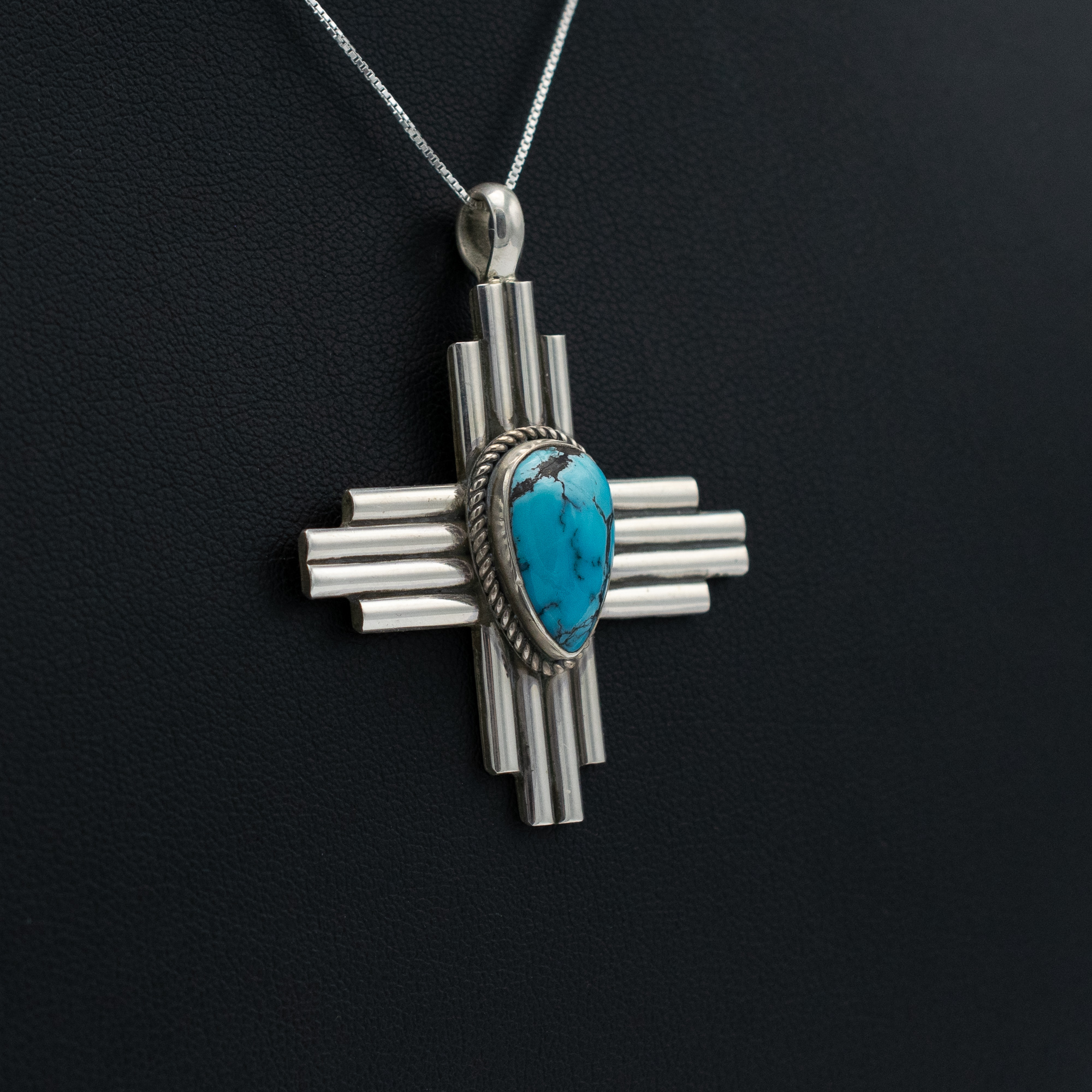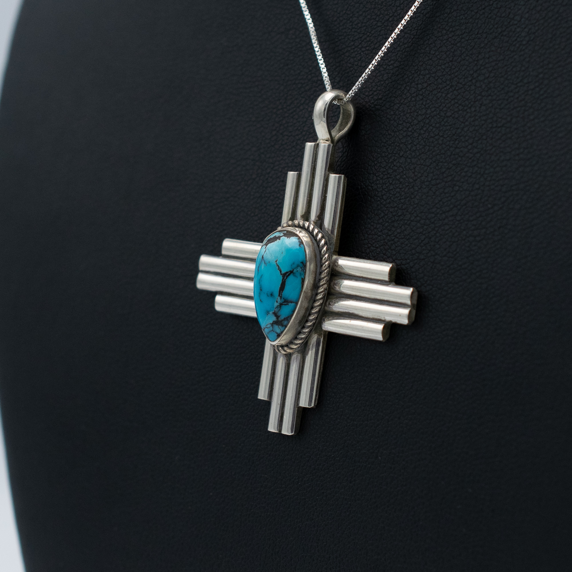 This Natural Blue Moon Turquoise Zia Pendant by Navajo artist Bryant Martinez beautifully blends New Mexico symbolism with exceptional silversmithing. The sterling silver Zia design is crafted with clean, linear detailing that radiates outward like the sun. At the center sits a vivid Blue Moon turquoise stone, known for its bright blue color and bold matrix lines. Framed with classic twist wire, the stone brings a vibrant focal point to the strong geometric form. A meaningful and eye-catching piece that honors tradition while showcasing the natural beauty of Blue Moon turquoise.
