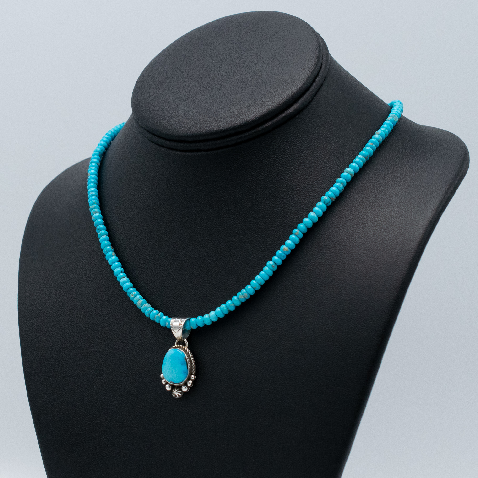 This necklace features a Natural Blue Ridge Turquoise Pendant handcrafted by Navajo artist Ruth Ann Begay, paired beautifully with Stabilized Kingman Turquoise Beads strung by Kathleen Sanchez of San Felipe Pueblo. The pendant showcases a smooth Blue Ridge turquoise stone framed in sterling silver with twist wire, stamped details, and delicate silver accents for a timeless look. The bright Kingman beads echo the pendant’s vivid blue tones, creating a cohesive, eye-catching strand. A stunning collaboration between two talented artists, blending traditional craftsmanship with vibrant Southwestern color.