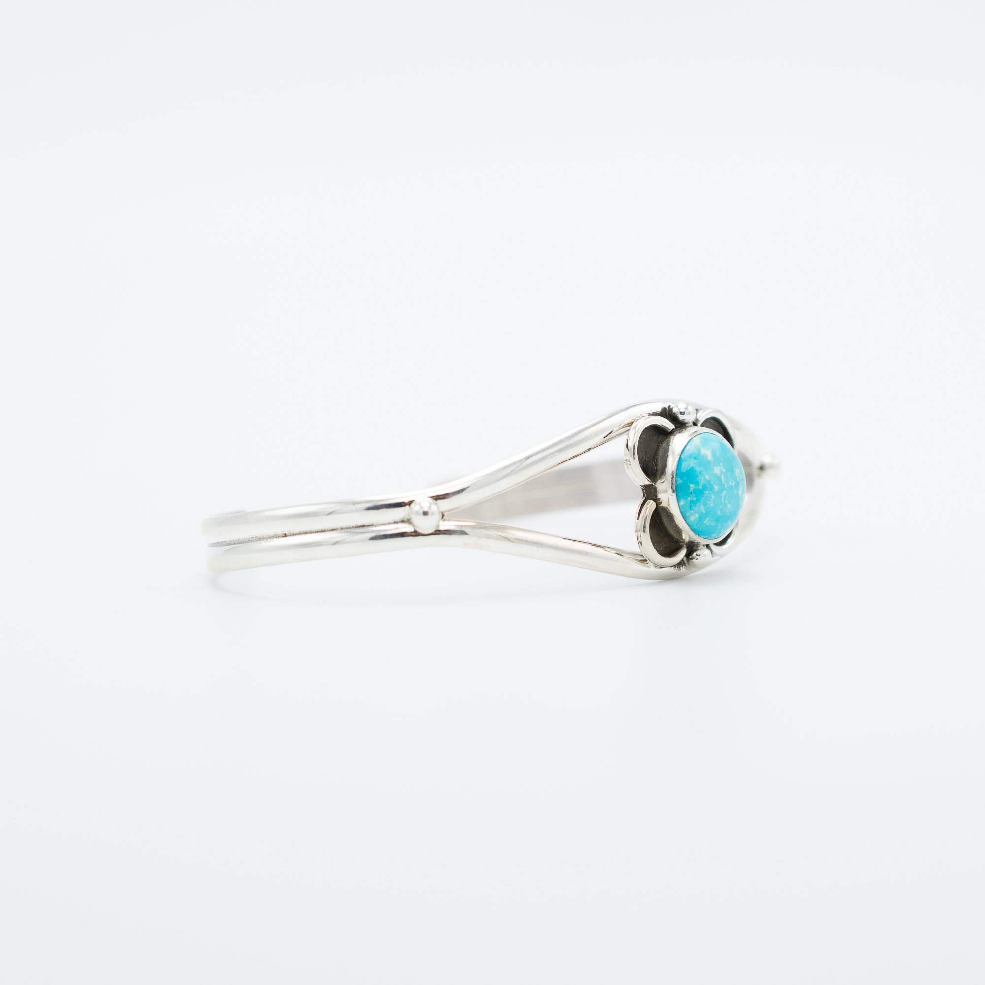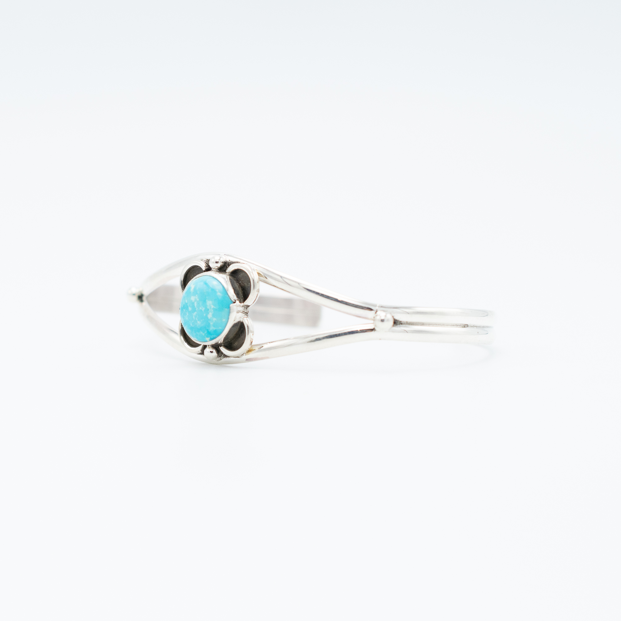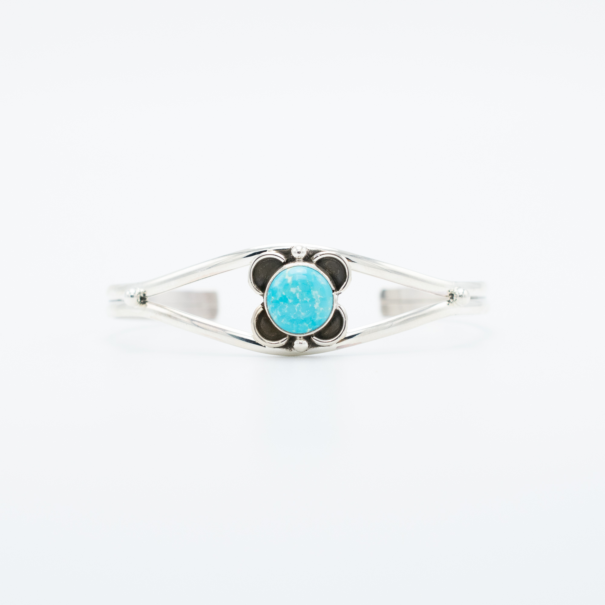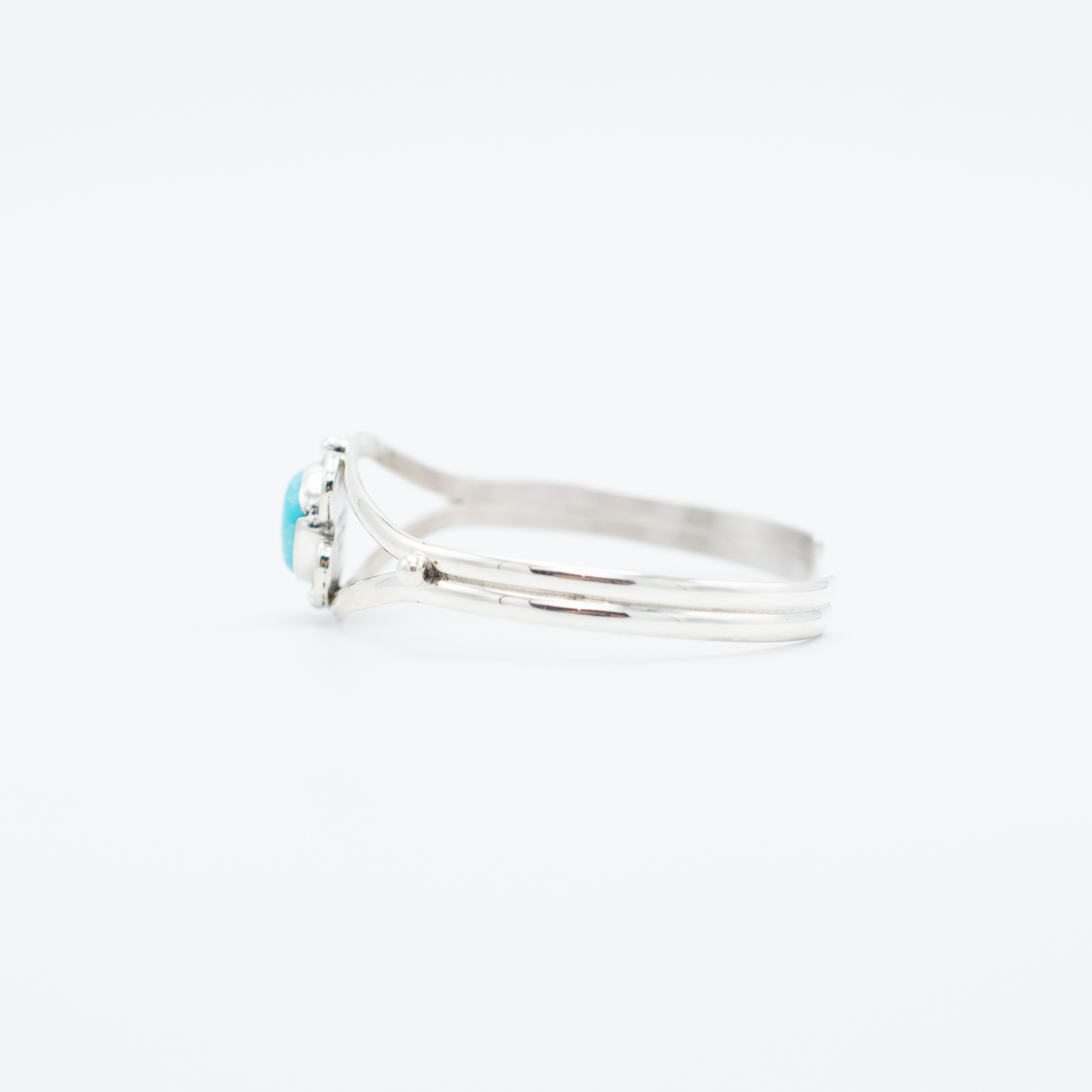 This Blue Ridge Turquoise Butterfly Bracelet by Navajo artist Ruth Ann Begay showcases a vibrant round turquoise stone framed by a graceful butterfly motif. The split sterling silver band adds an airy elegance, drawing the eye to the stone’s natural sky-blue hues. Handcrafted with skill and care, this piece blends traditional artistry with a whimsical design, making it a versatile addition to any collection.