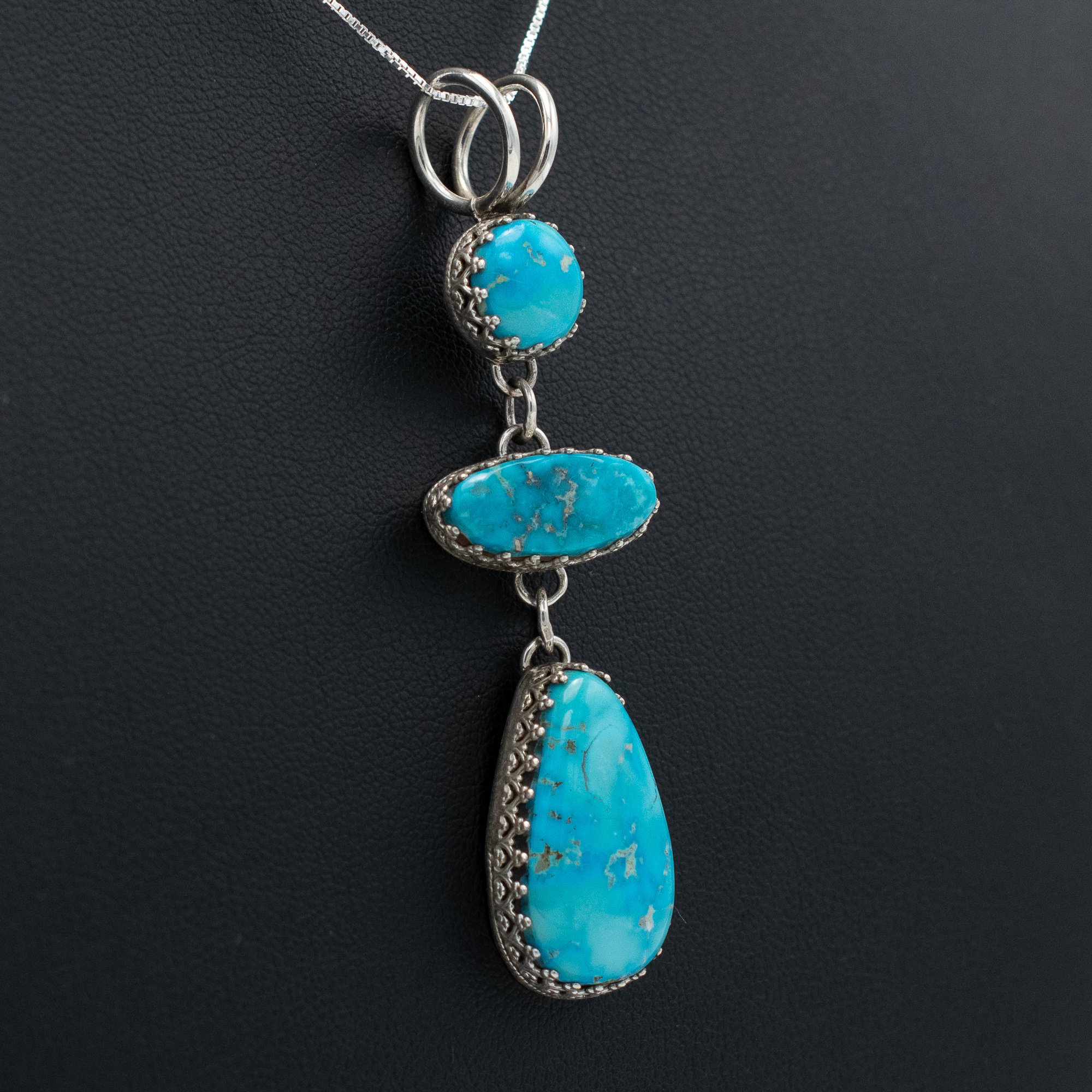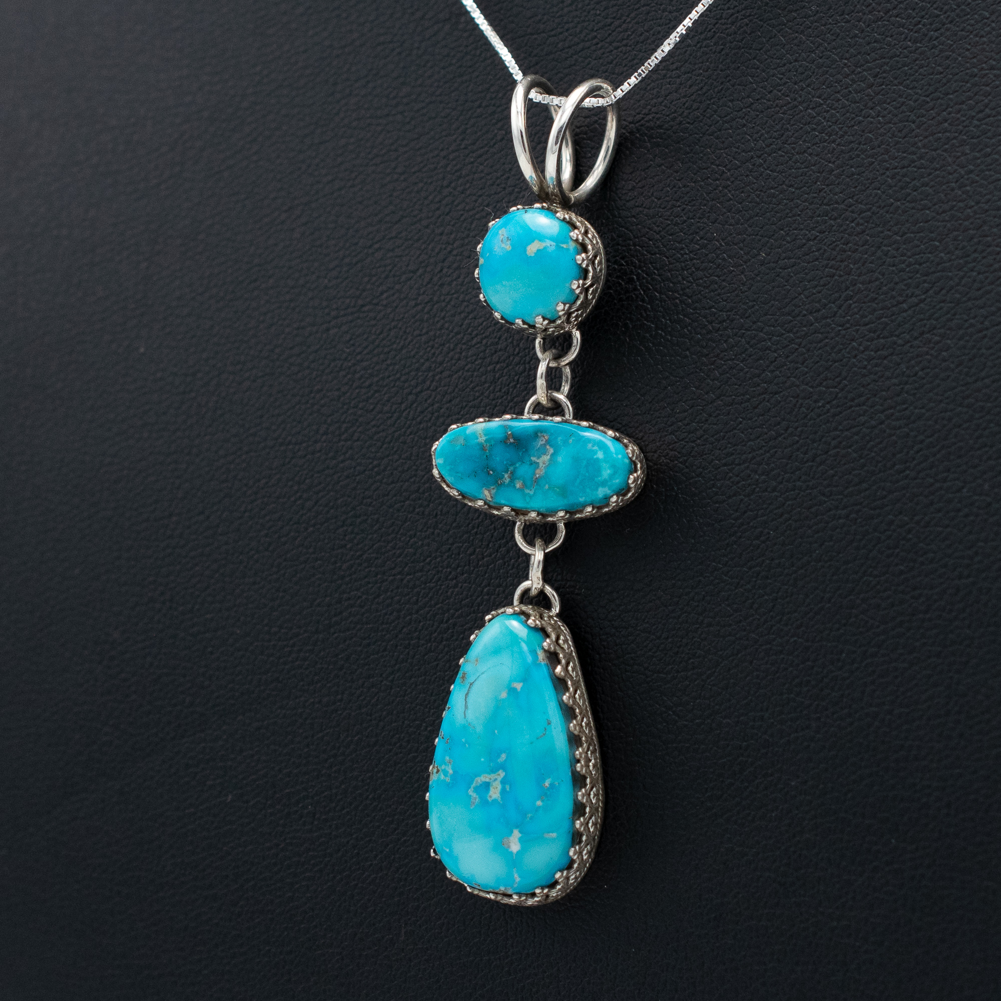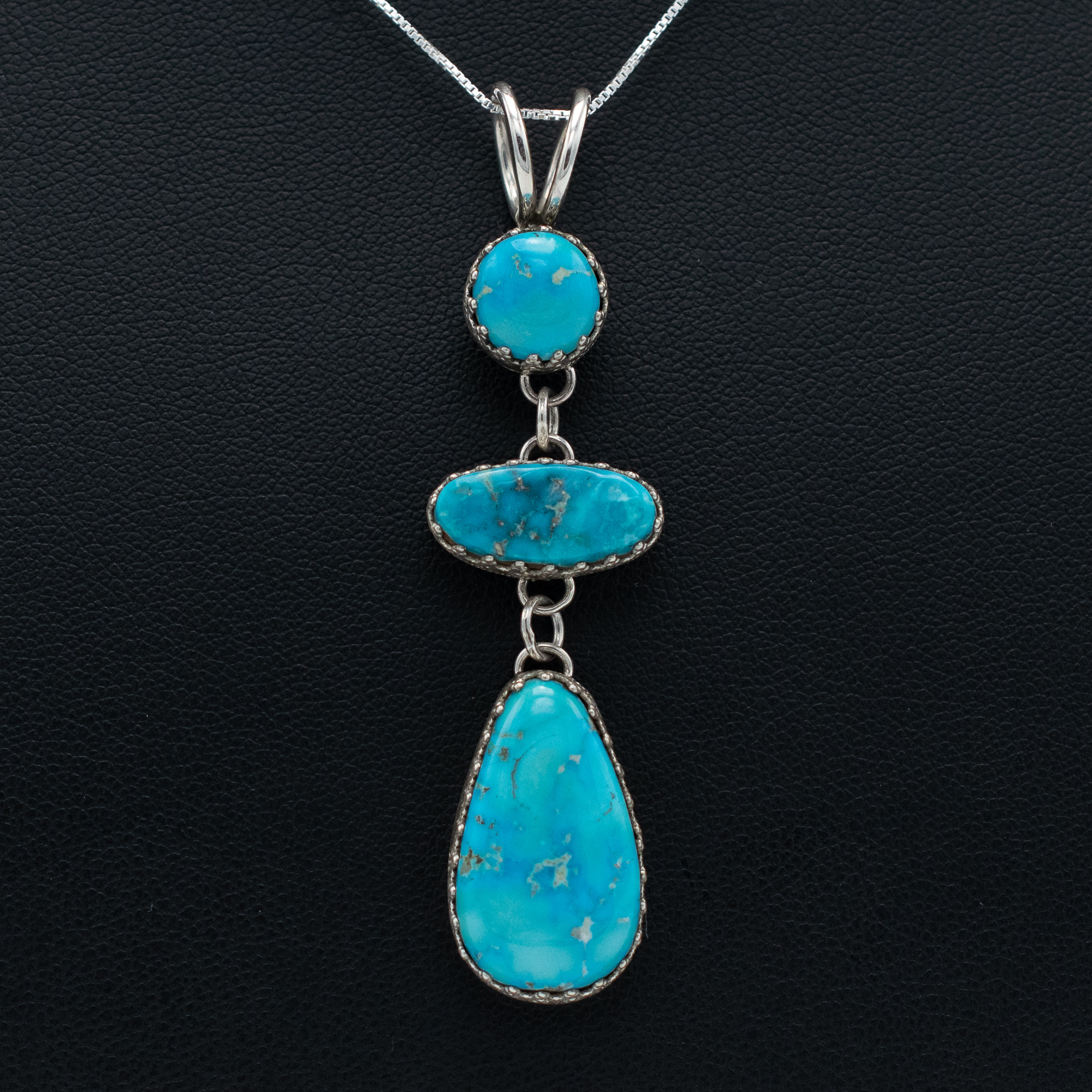 This Blue Ridge Turquoise Jewelry Set by Navajo artist Ruth Ann Begay features a matching pendant, bracelet, and teardrop earrings, each showcasing the sky-blue tones and soft marbling that make Blue Ridge turquoise so beloved. Set in sterling silver with traditional Navajo techniques, each piece highlights the natural elegance of the stones with simple bezels and delicate silver detailing. This coordinated set offers a timeless Southwestern charm, perfect for everyday wear or special occasions.