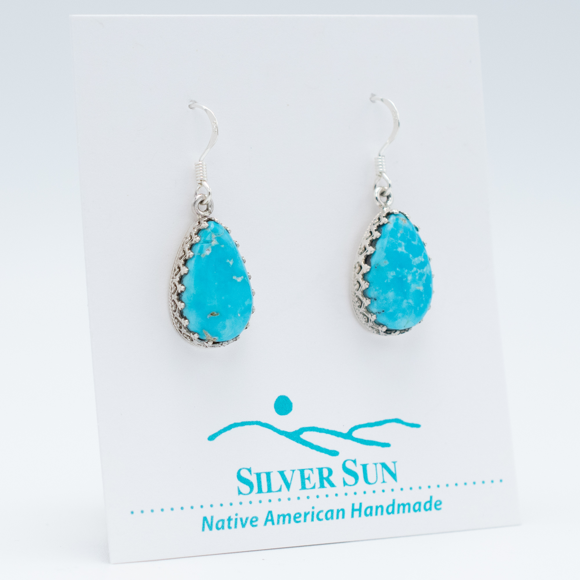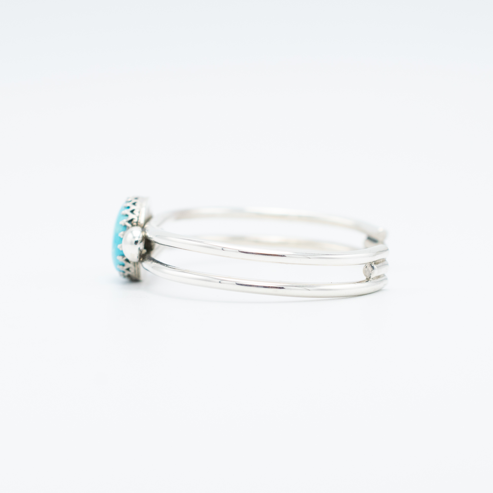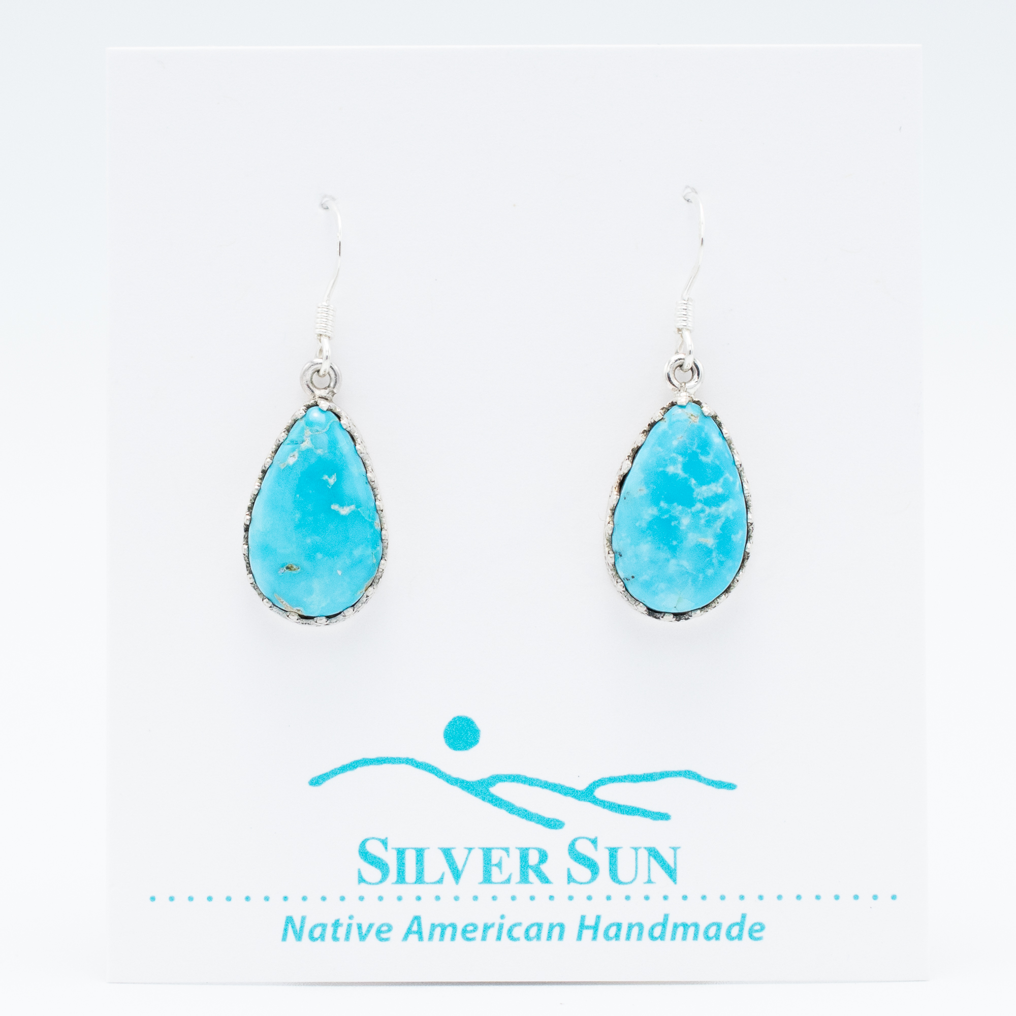 This Blue Ridge Turquoise Jewelry Set by Navajo artist Ruth Ann Begay features a matching pendant, bracelet, and teardrop earrings, each showcasing the sky-blue tones and soft marbling that make Blue Ridge turquoise so beloved. Set in sterling silver with traditional Navajo techniques, each piece highlights the natural elegance of the stones with simple bezels and delicate silver detailing. This coordinated set offers a timeless Southwestern charm, perfect for everyday wear or special occasions.