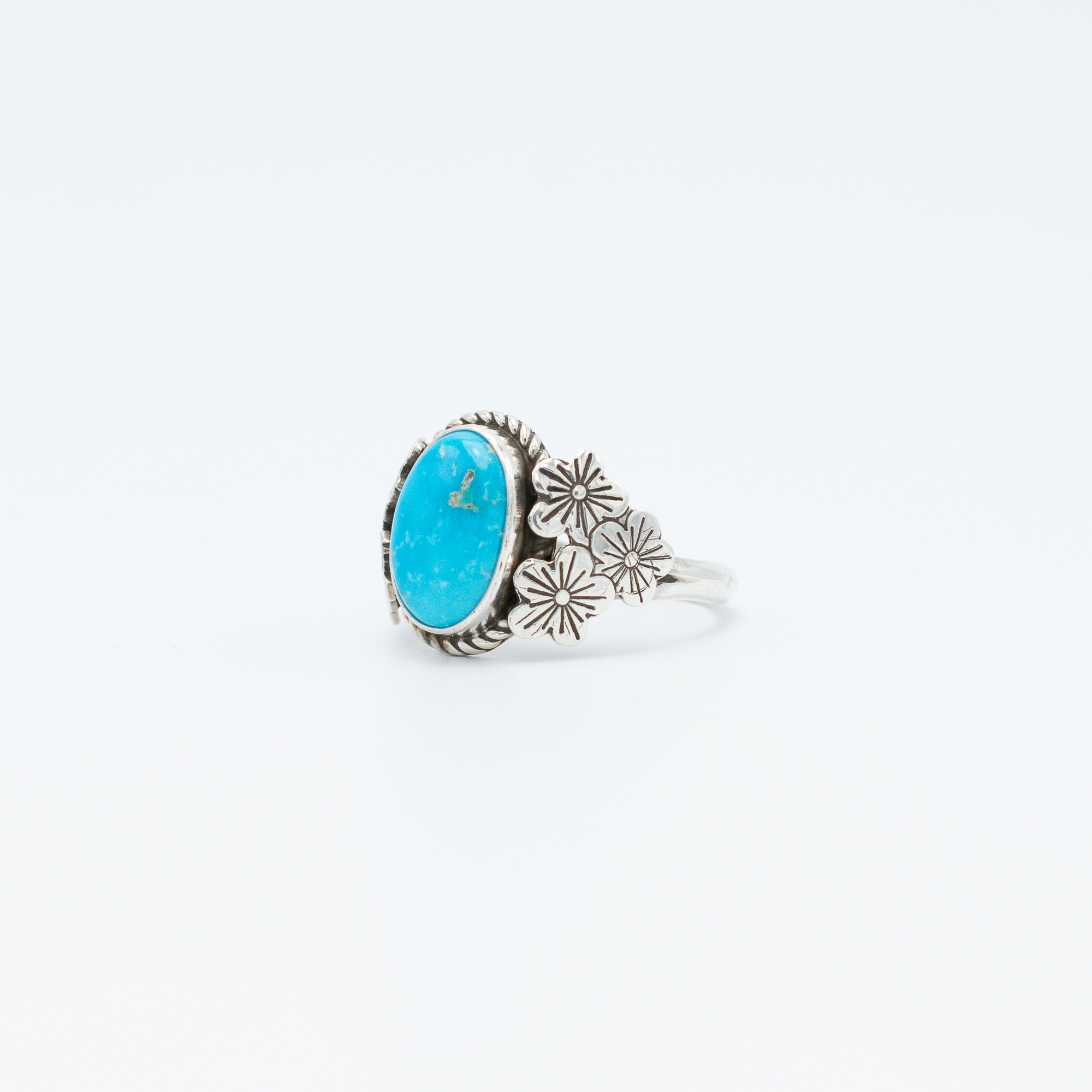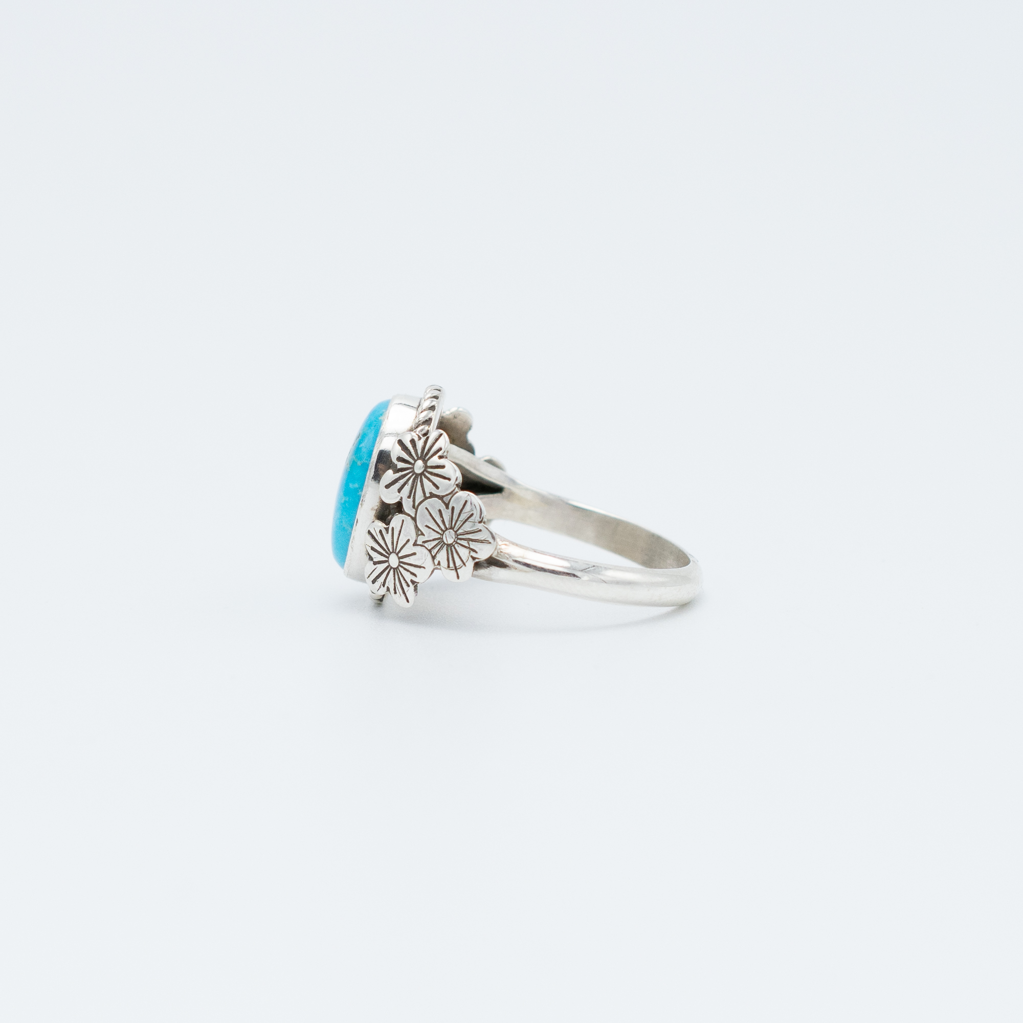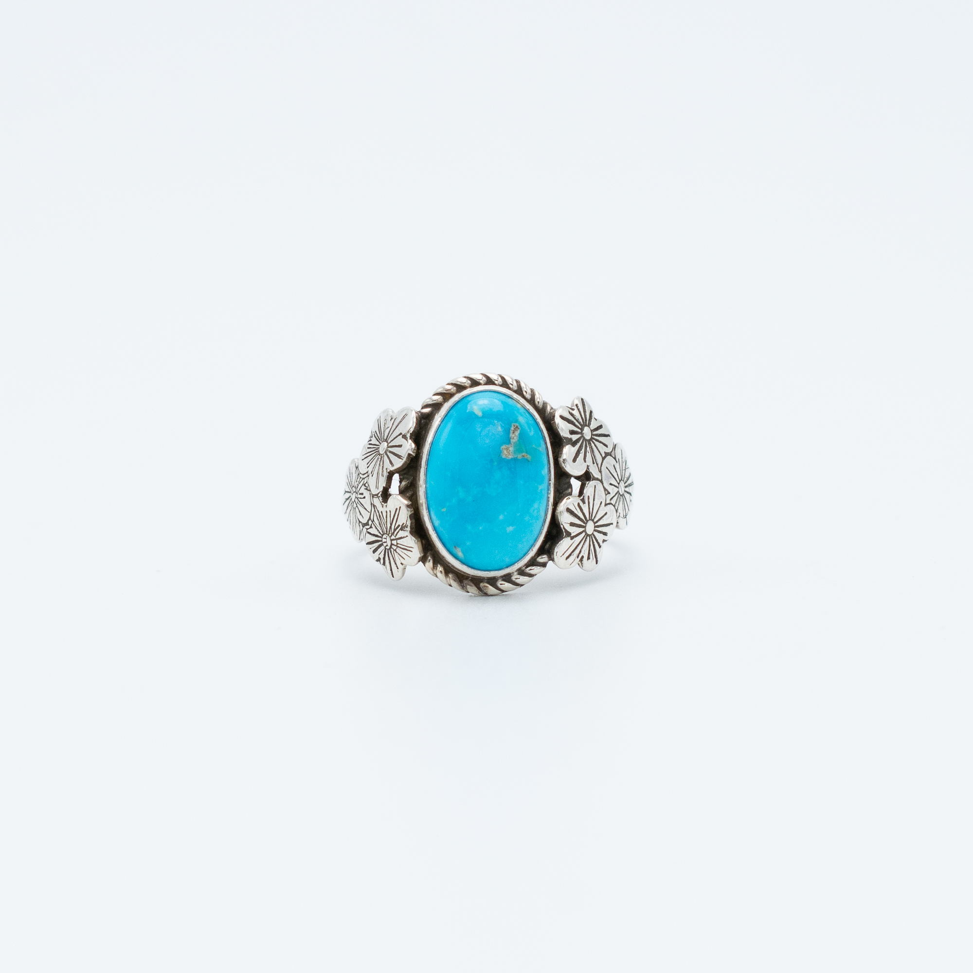 This Blue Ridge Turquoise Stamped Flowers Ring by Ruth Ann Begay, a stunning creation that celebrates the beauty of nature. Crafted with Natural Blue Ridge turquoise, this captivating stone is surrounded by intricate silver stamped with three delicate flowers. Embrace elegance and sophistication with this unique piece of jewelry.