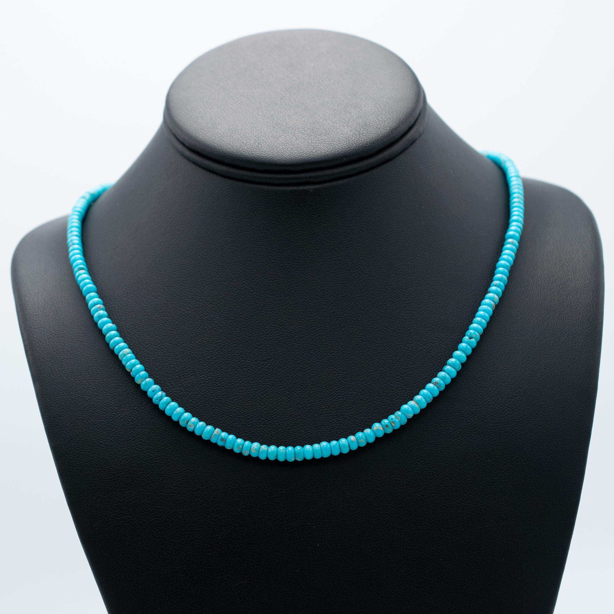 This Stabilized Campitos Turquoise Bead Necklace by Kathleen Sanchez of San Felipe Pueblo is a timeless piece of elegance. Featuring smooth, sky-blue turquoise beads with subtle variations, this necklace offers a classic and refined look. The uniform bead size and delicate polish make it perfect for layering or wearing on its own for a simple yet striking statement. Handcrafted with care, it embodies the beauty of natural turquoise and traditional artistry.
