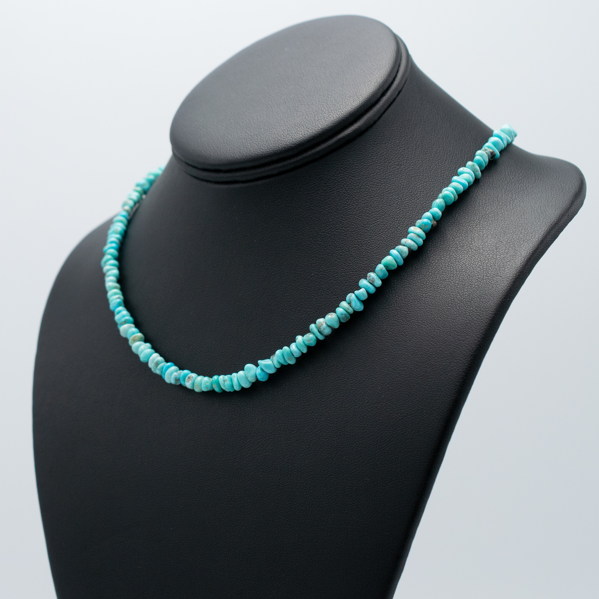 This Cananea Turquoise Bead Necklace by Kathleen Sanchez (San Felipe Pueblo) features a strand of hand-strung, vibrant turquoise disc beads showcasing the distinctive pale blue-green hue and natural matrix of Cananea turquoise. Subtle shifts in color and texture give the necklace a dynamic, organic character. Whether worn alone or layered with silver or shell, this piece brings a refreshing, earthy elegance to your jewelry collection. Handcrafted with care and cultural reverence, it’s a timeless celebration of Southwestern beauty.