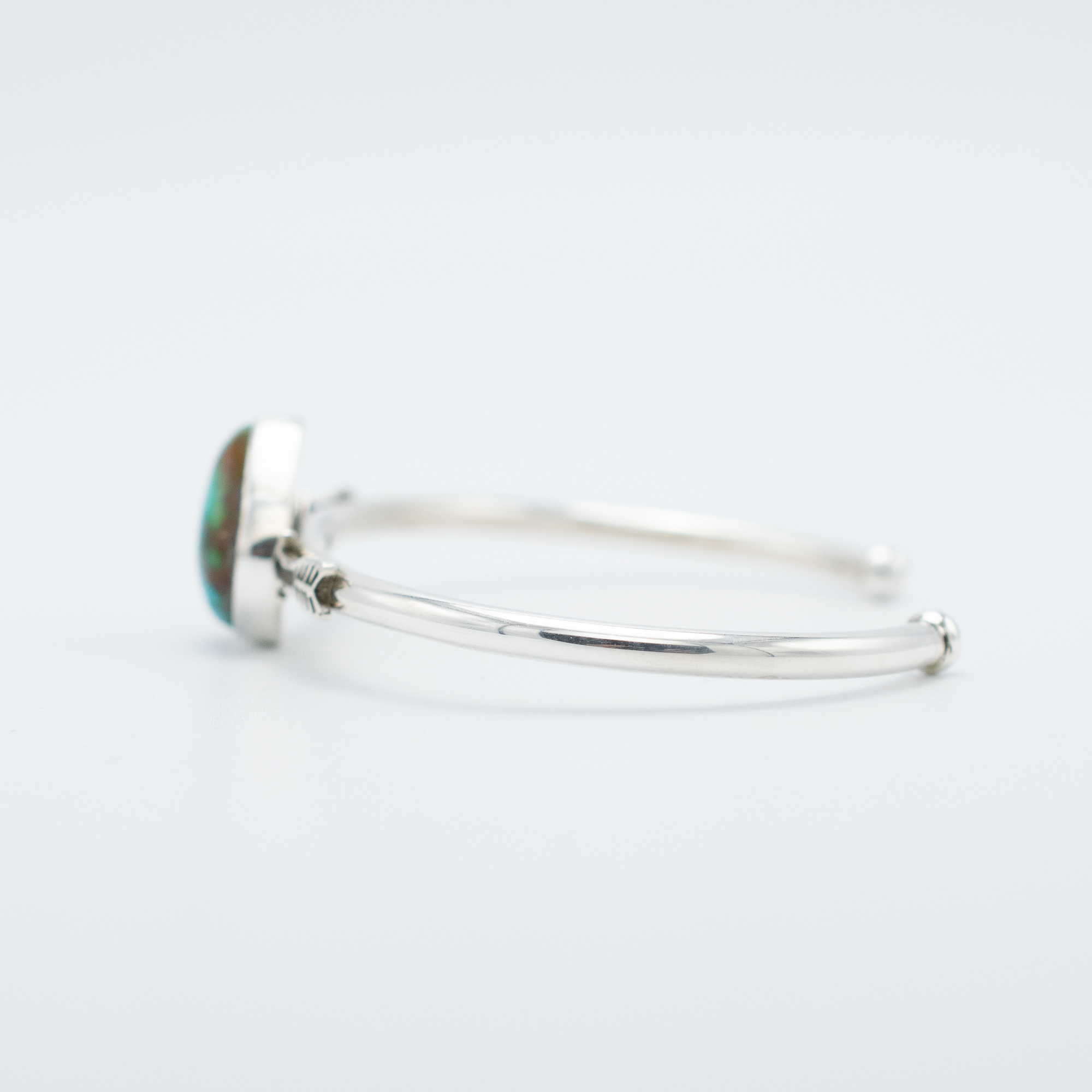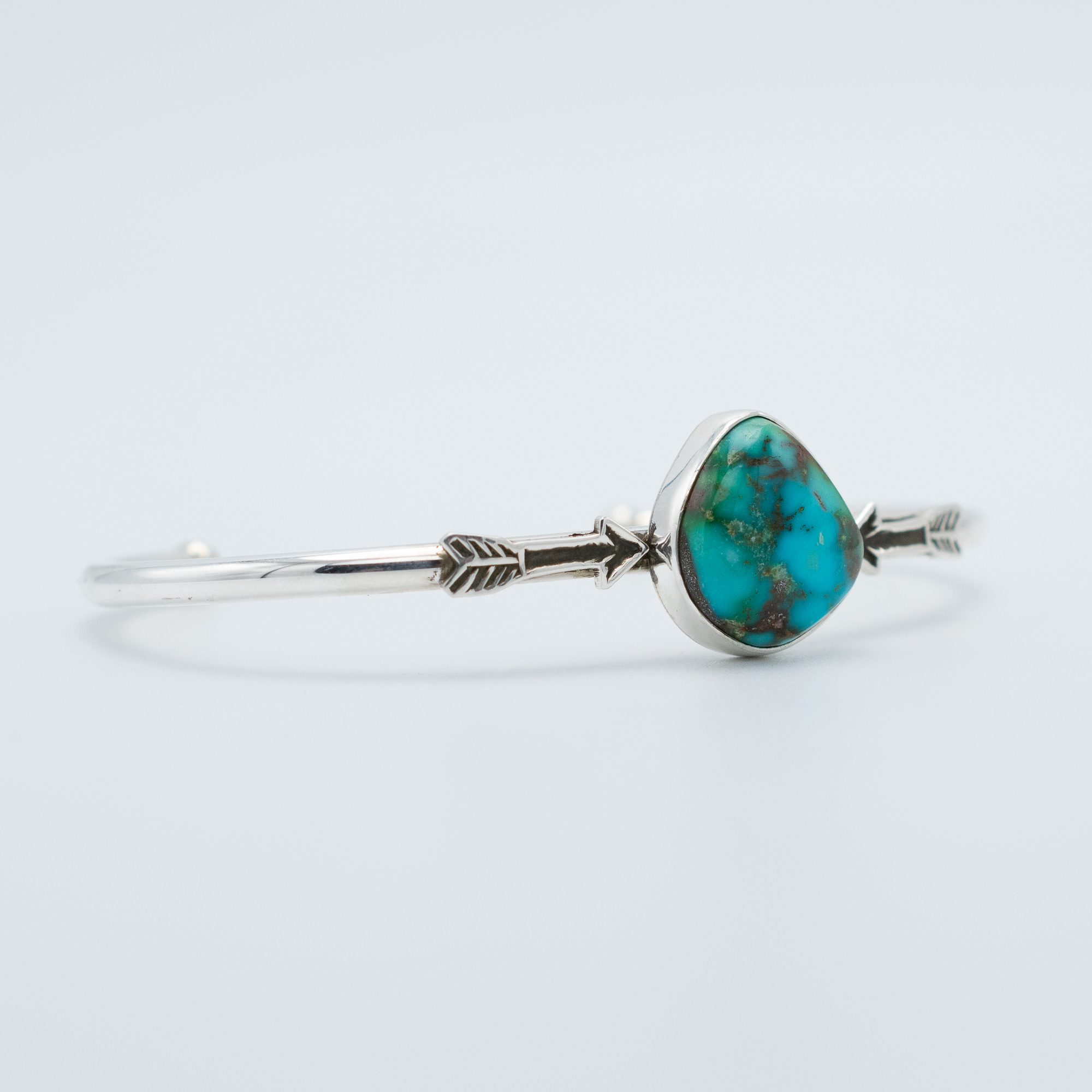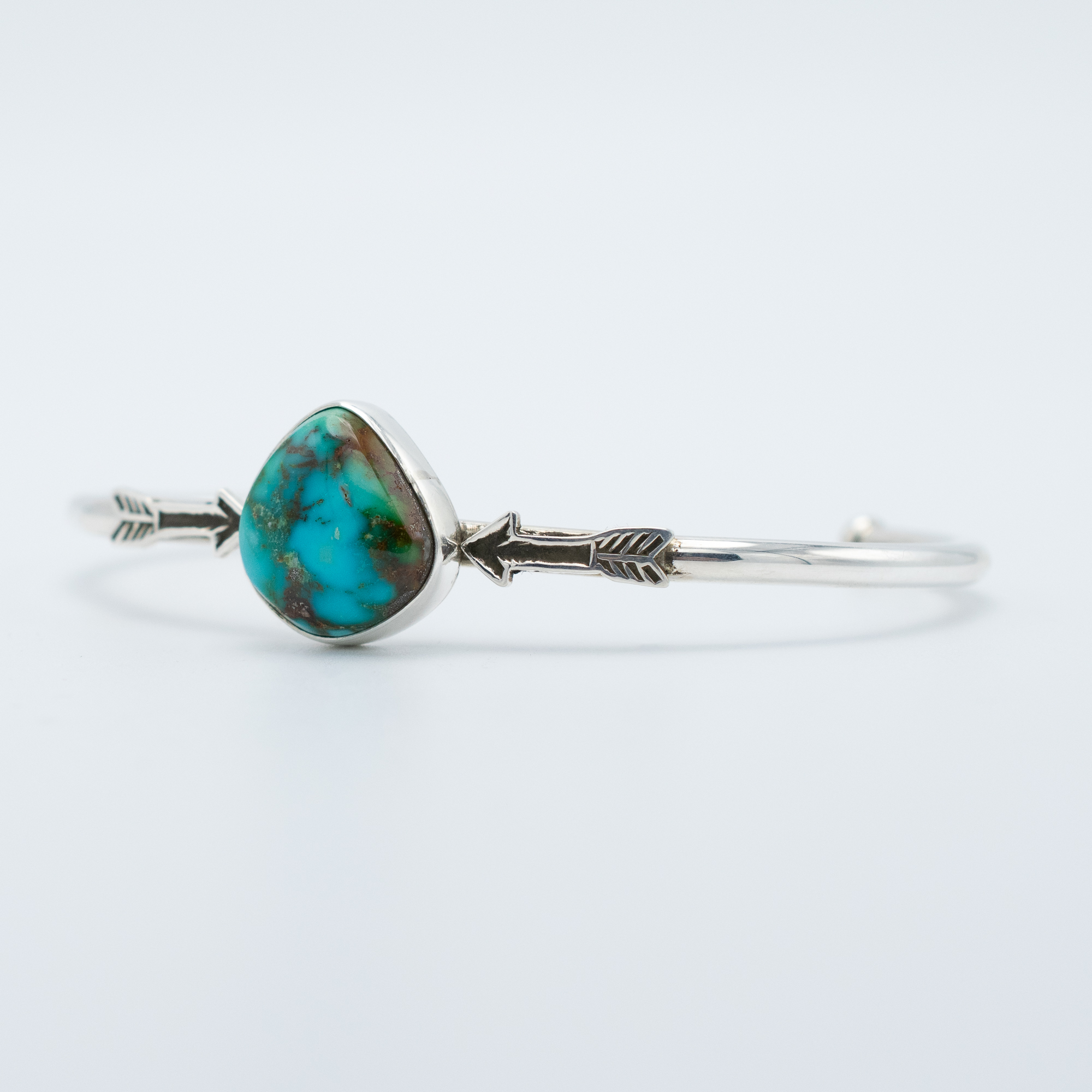 This Natural Candelaria Turquoise Bracelet by Navajo artist Bryant Martinez features a vivid stone full of rich blue tones and warm, earthy matrix—classic traits of highly sought-after Candelaria turquoise. The stone is set in a clean sterling silver bezel and framed on each side by finely crafted arrow designs, adding movement and symbolic strength to the piece. Elegant, lightweight, and full of character, this bracelet brings together exceptional Southwestern turquoise and thoughtful Navajo silversmithing for an eye-catching everyday accessory.