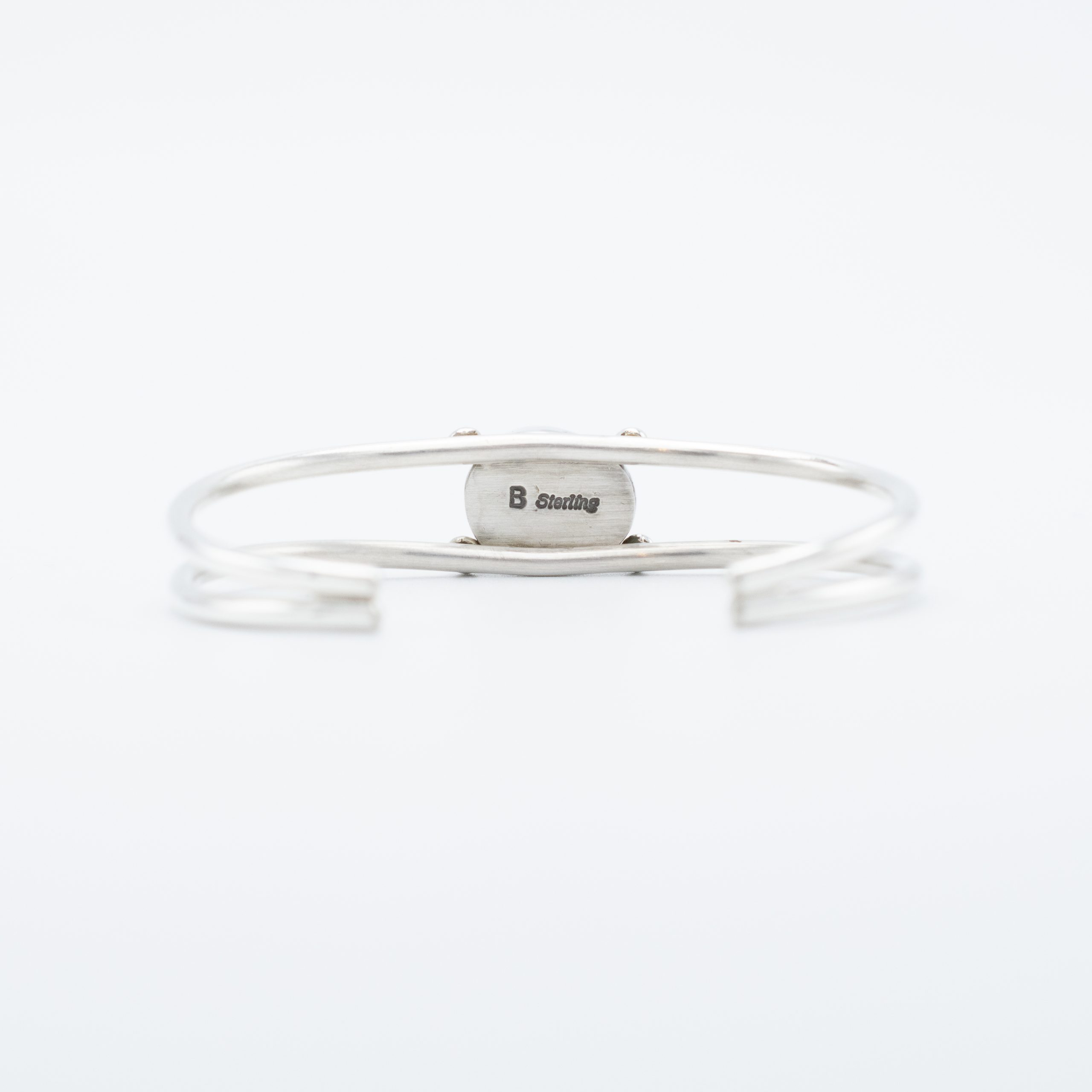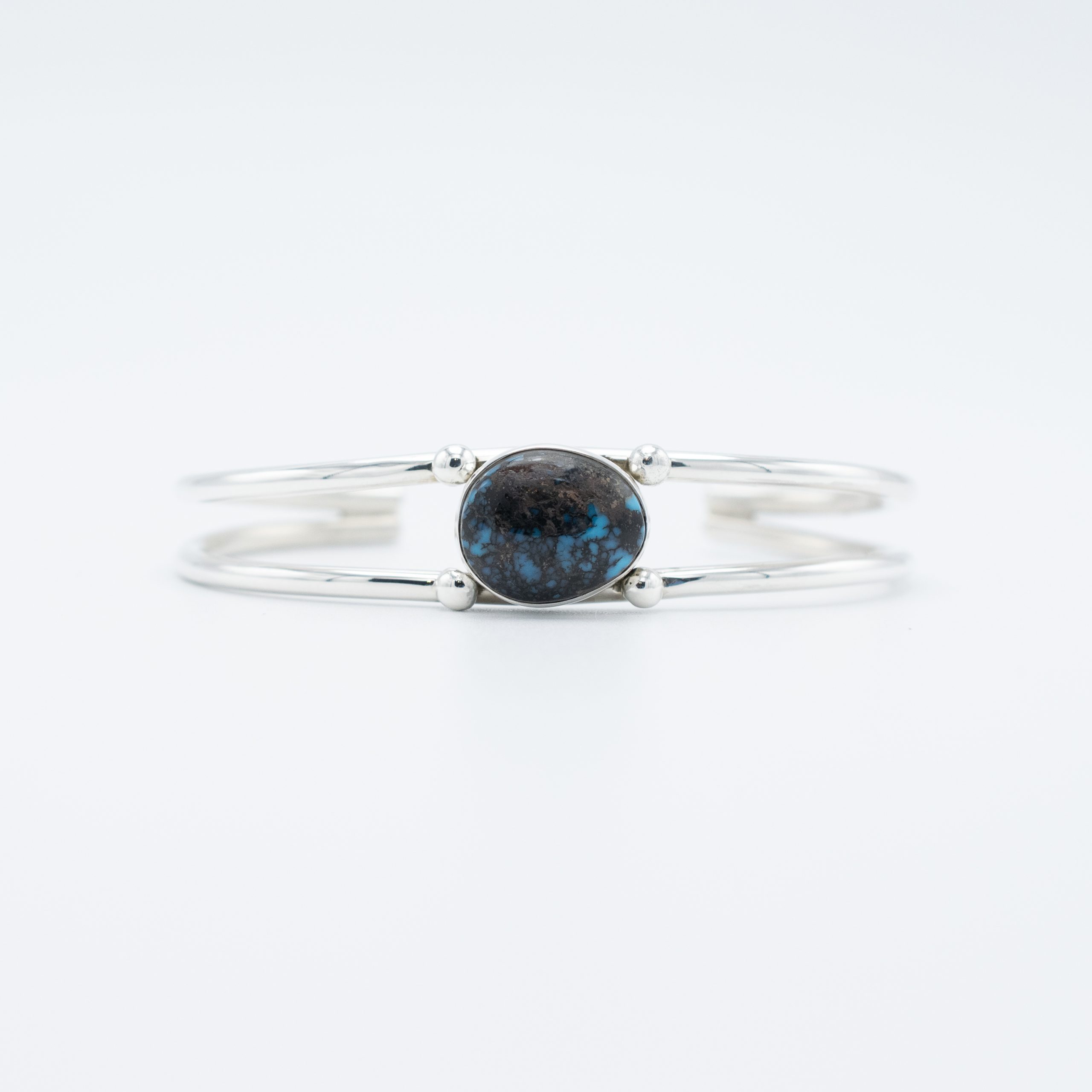 This High Grade Candelaria Turquoise Bracelet by Navajo artist Bryant Martinez beautifully captures the rich, deep tones of Candelaria turquoise. The double-band design elegantly frames the stone, highlighting its striking blue and black matrix patterns. This piece combines simplicity with sophistication, making it an excellent addition to any jewelry collection.