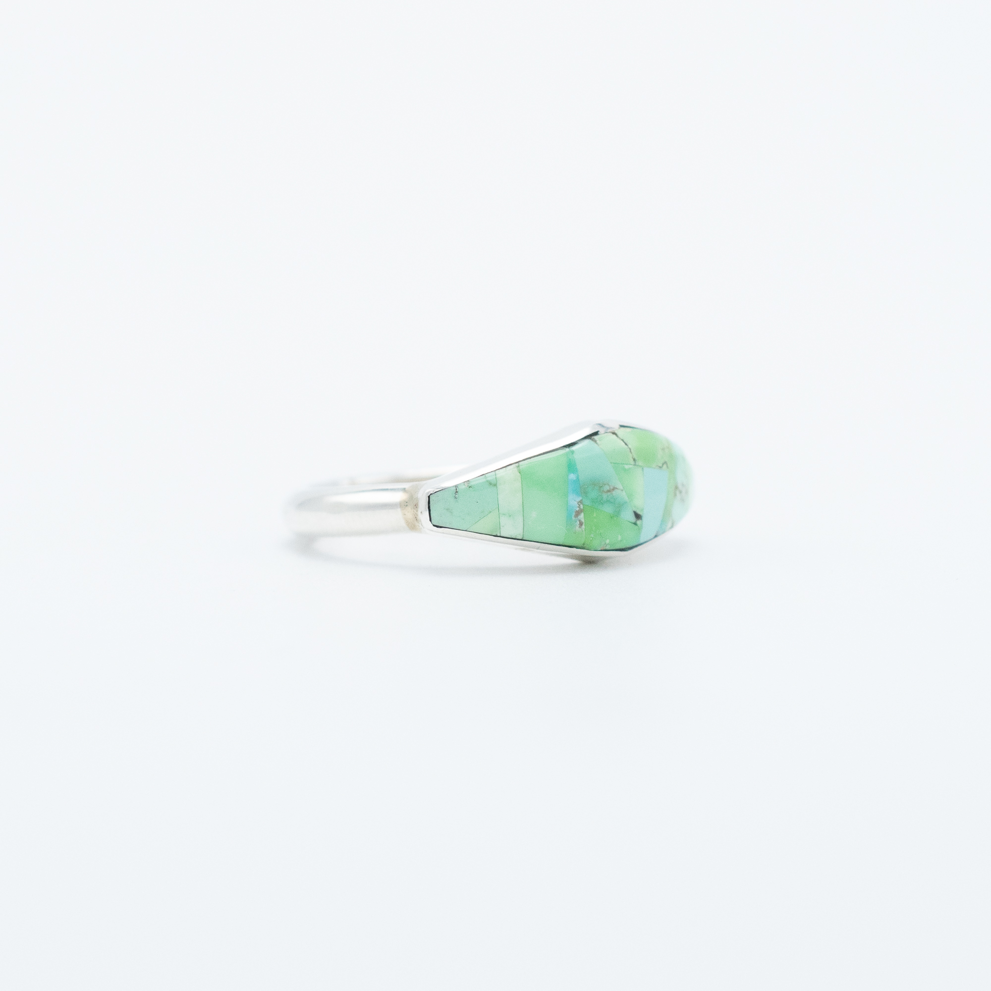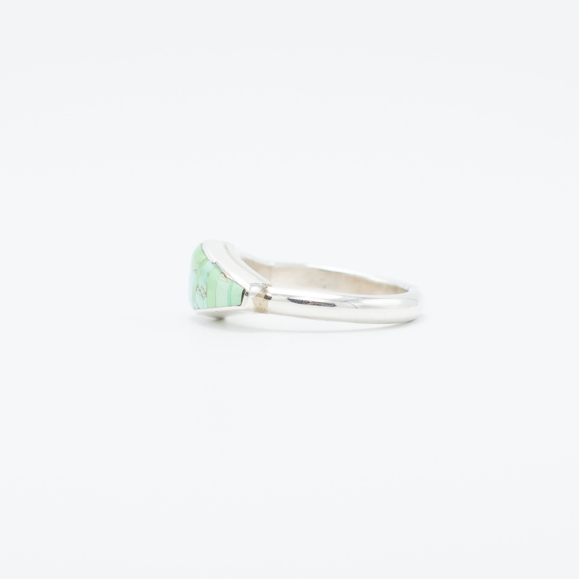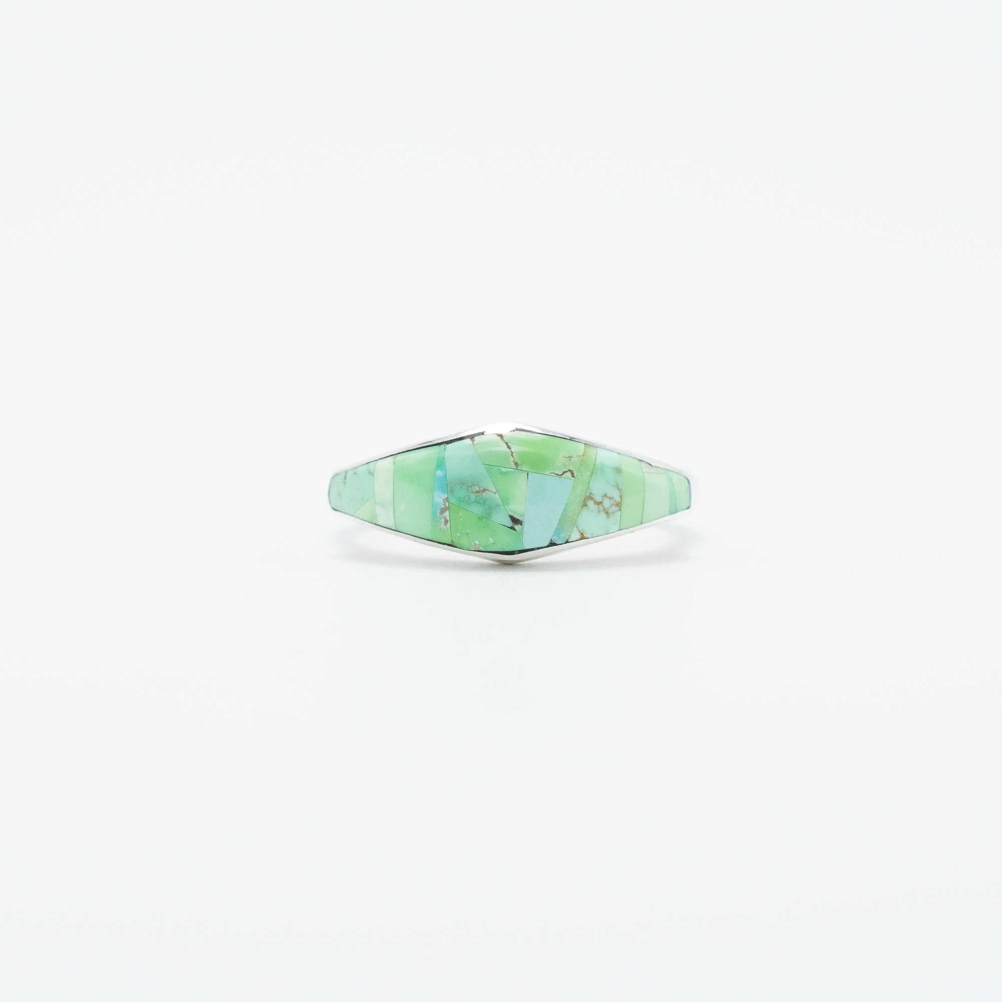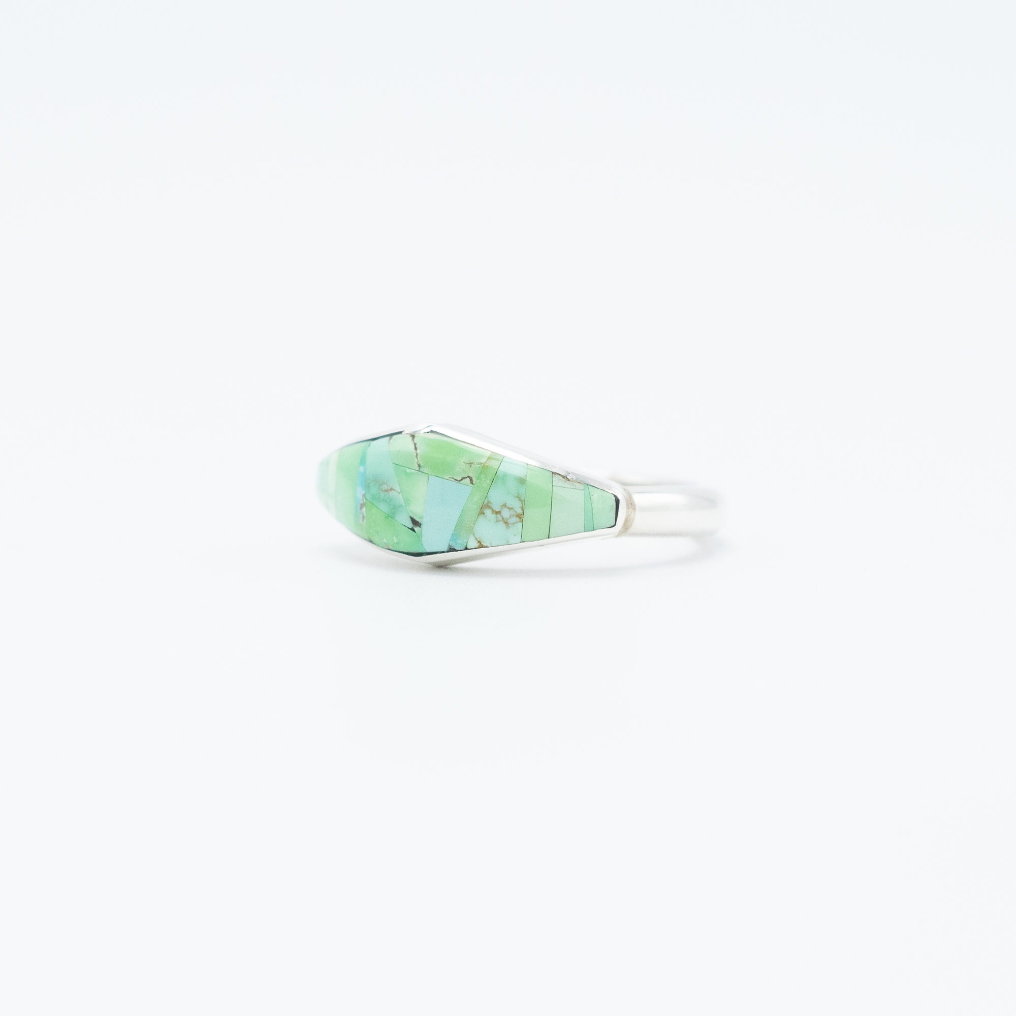 This Natural Carico Lake Turquoise Inlay Ring showcases the stone’s signature blend of soft greens and blues, highlighted by delicate golden matrix patterns. The inlay work creates a smooth, streamlined surface that flows seamlessly into the sterling silver band for a refined, modern look. A versatile piece that adds a pop of color and artistry to any collection.