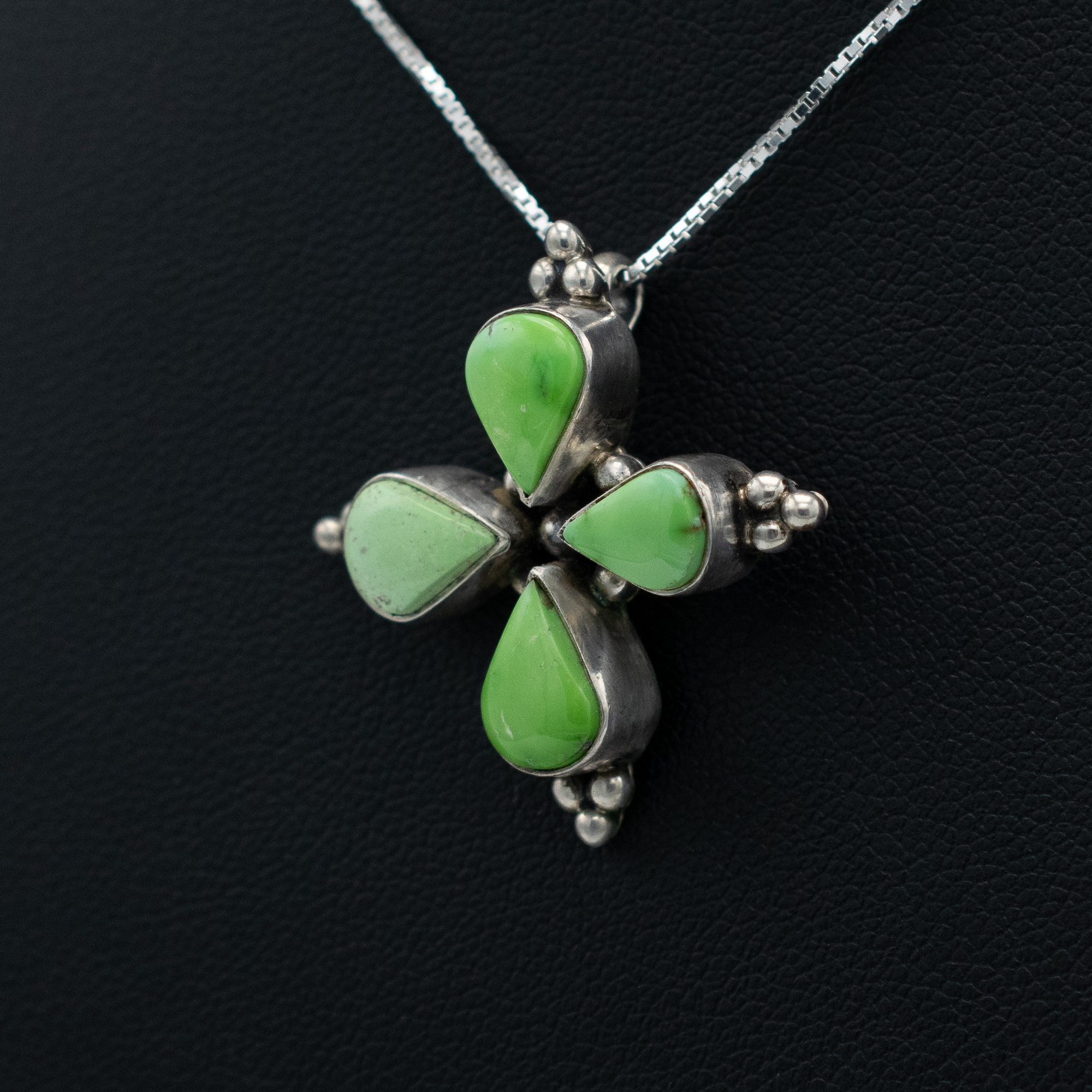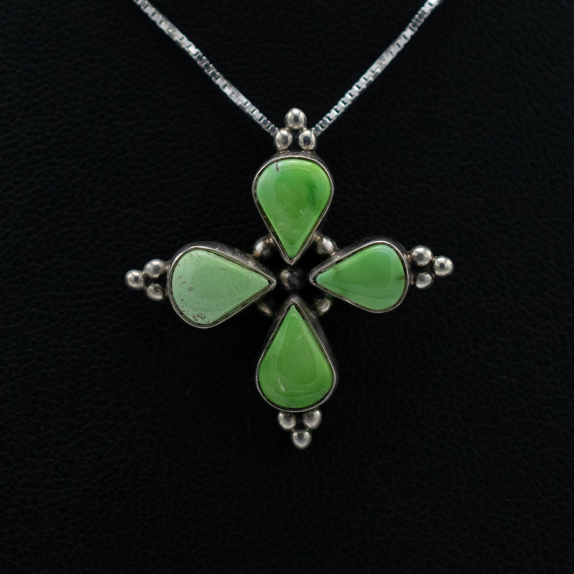 This Natural Carico Lake Turquoise Pendant by renowned artist Georgia Ann Curley from Laguna Acoma Pueblo features striking triangular turquoise stones set in a distinctive Greek cross design. The vibrant green hues of the Carico Lake turquoise are beautifully showcased within the intricate silverwork. Handcrafted with care and precision, this pendant combines unique artistry with timeless elegance, making it a standout piece for any jewelry collection.