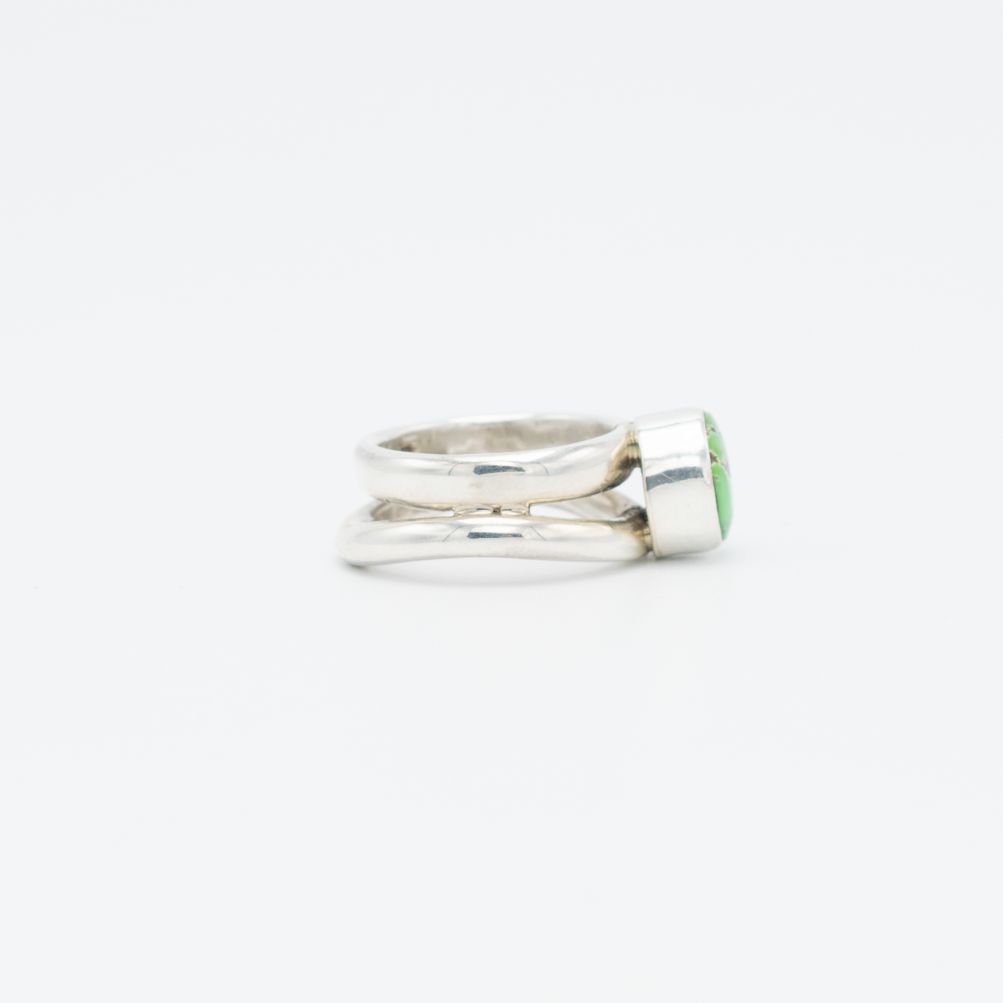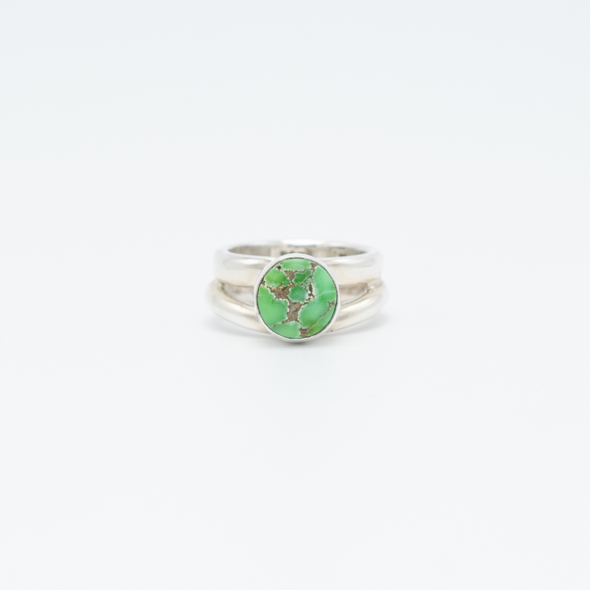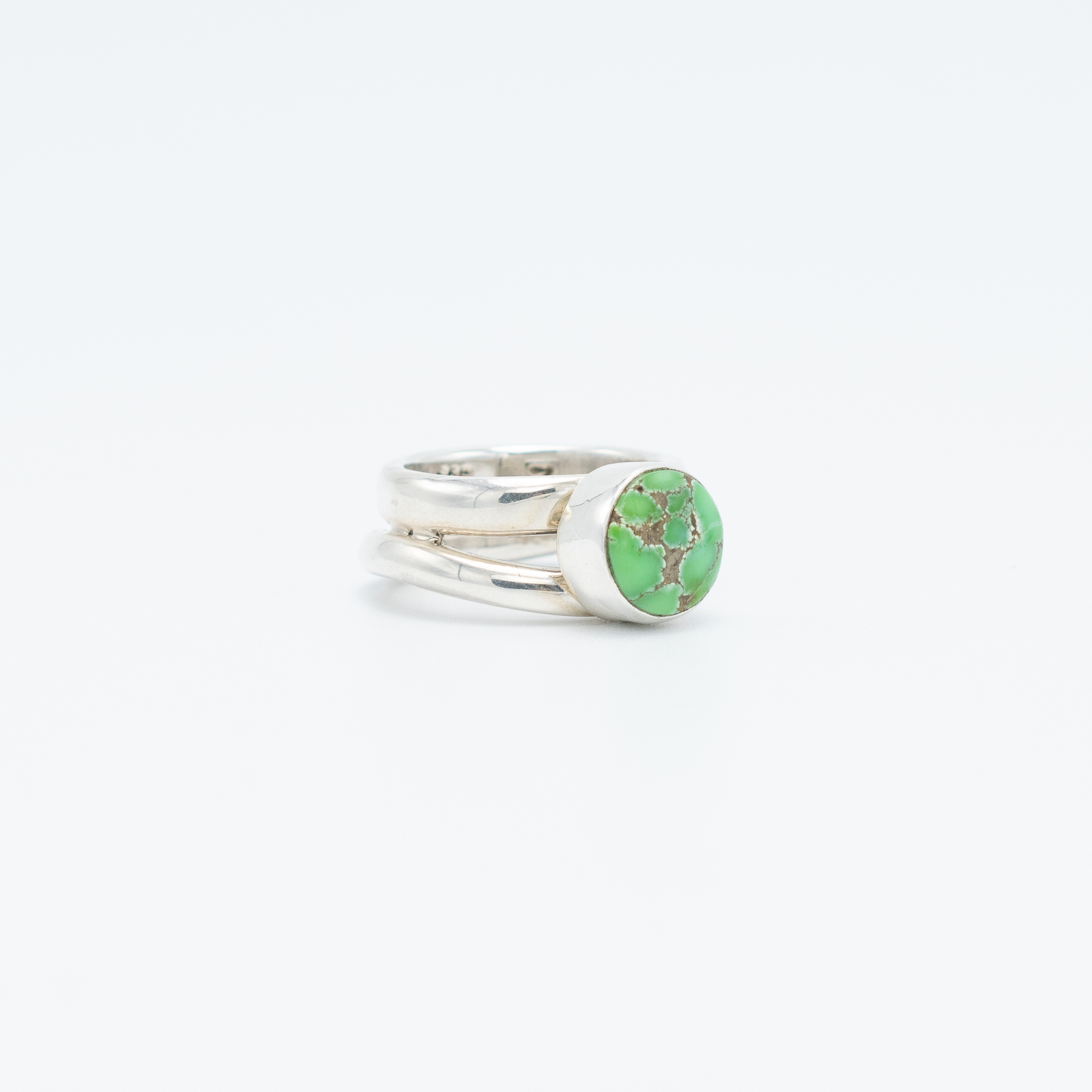 Admire the vibrant beauty of the Carico Lake Turquoise Ring by Juan Willie, Navajo. This stunning piece features a leaf green turquoise stone with a light brown matrix, creating a harmonious and earthy palette. The stone is set on an ergonomic silver band, designed for both comfort and style. Perfect for those who appreciate the natural elegance of this rare Carico Lake turquoise.