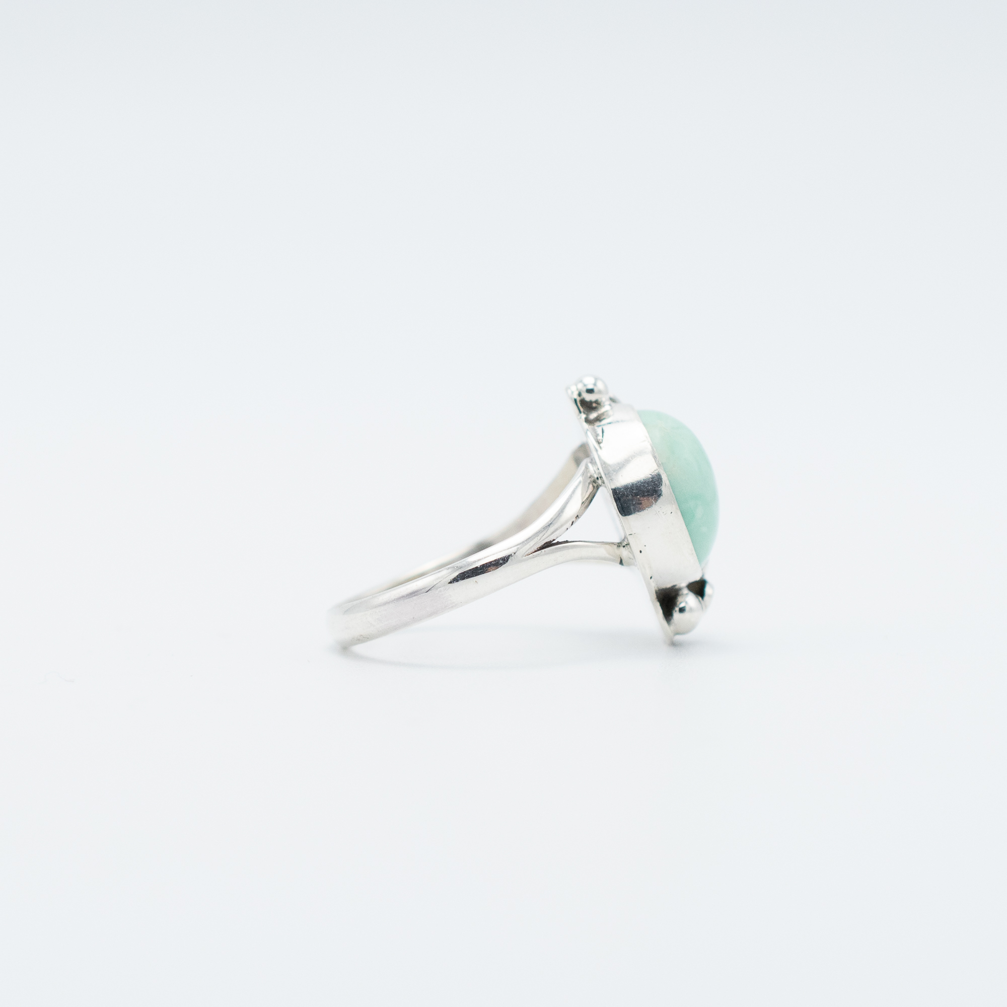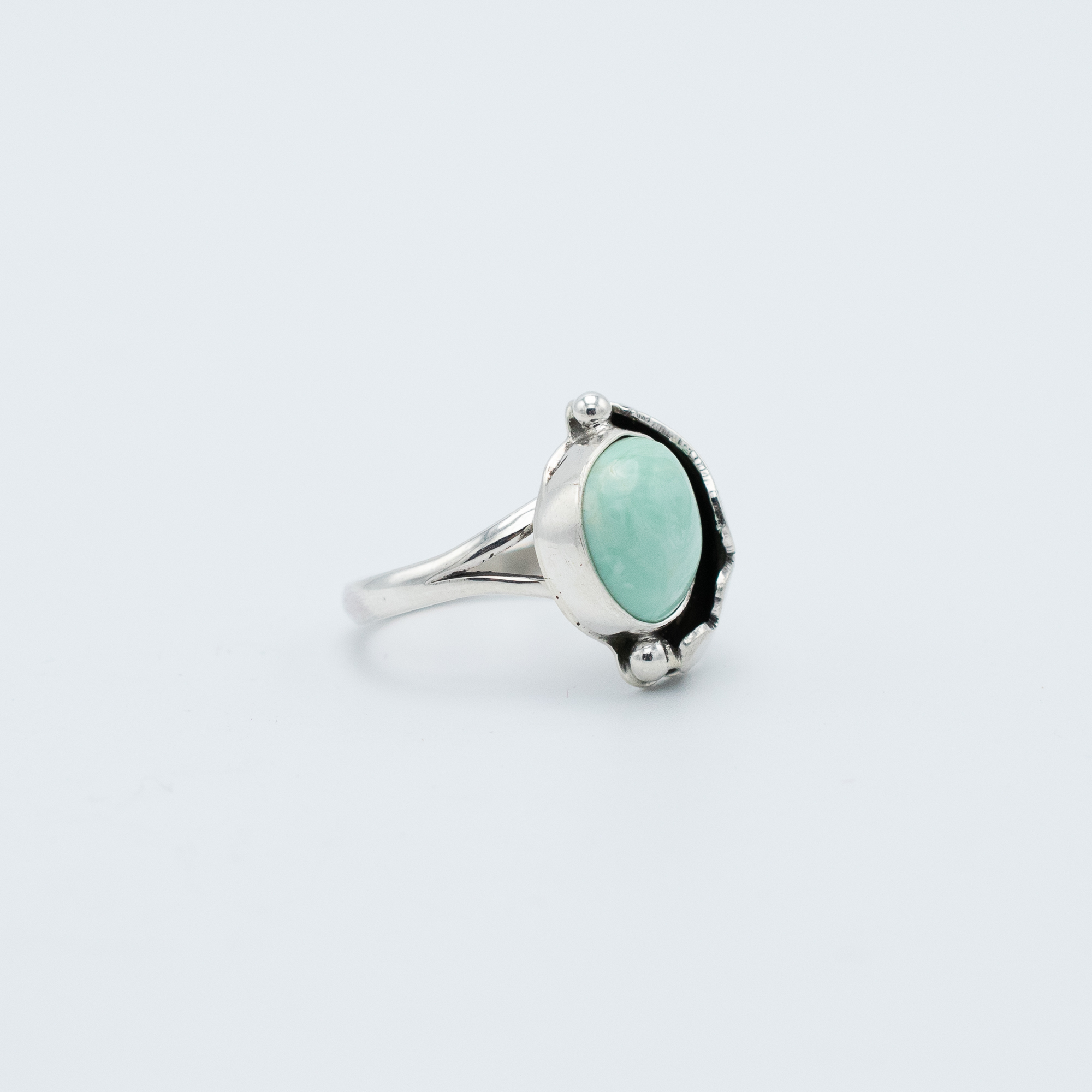 This Natural Carico Lake Turquoise Ring by Navajo artist Ruth Ann Begay features a soft mint-green stone with gentle matrix swirls, set in a smooth sterling silver bezel. The stone is framed by a graceful silver swirl design accented with polished beads, giving the piece a sense of motion and balance. Elegant and contemporary with a hint of classic Navajo influence, this ring captures the tranquil beauty of the Carico Lake turquoise mine.