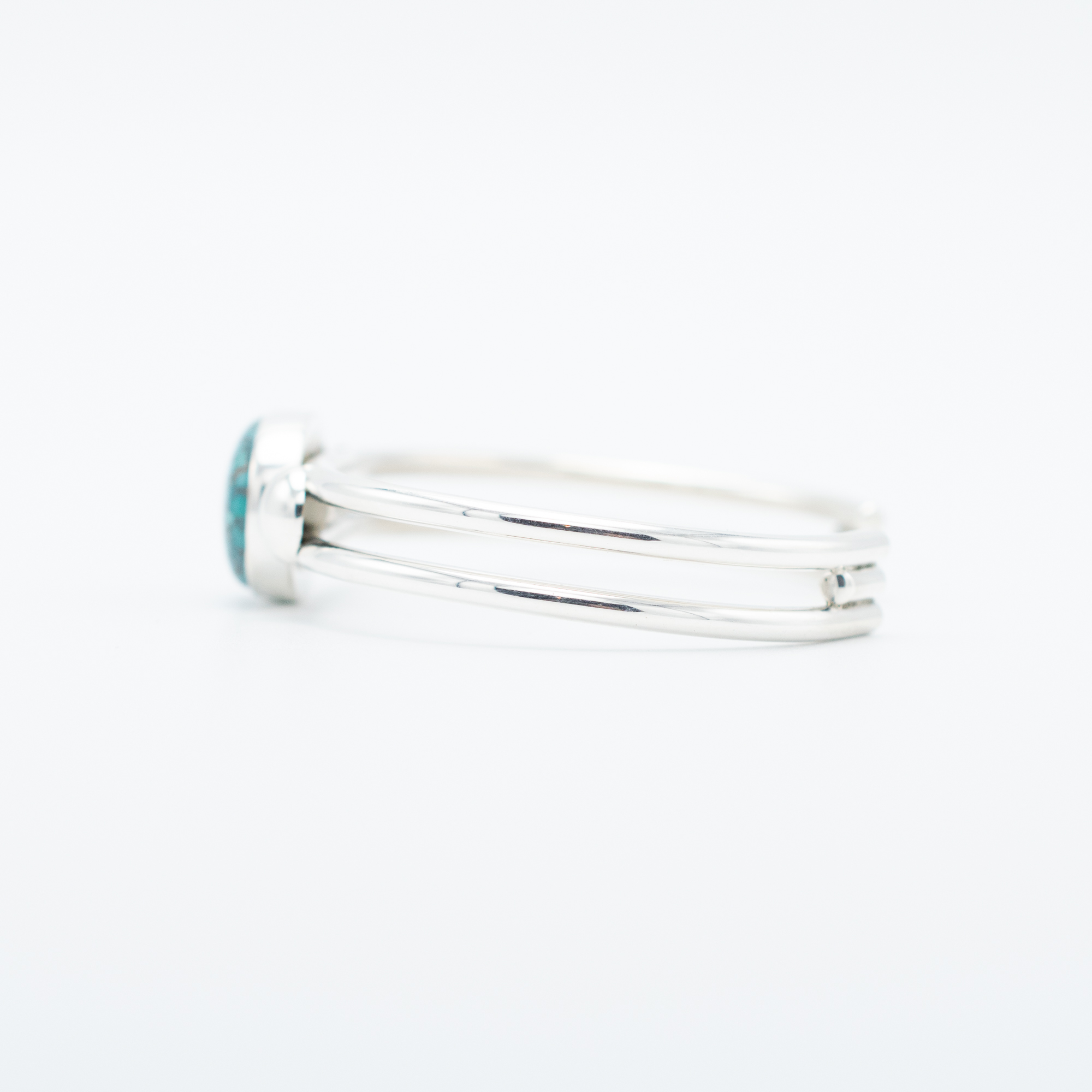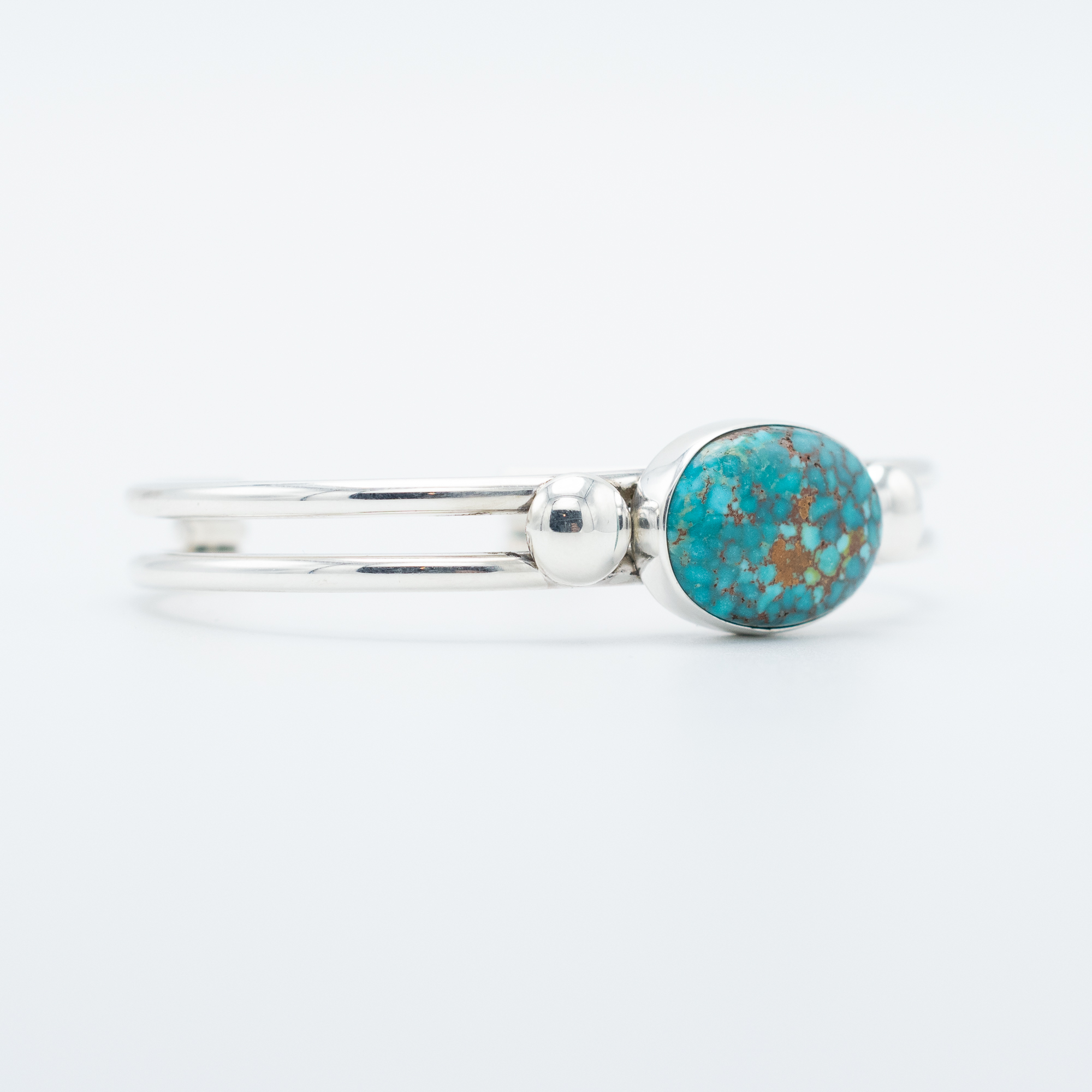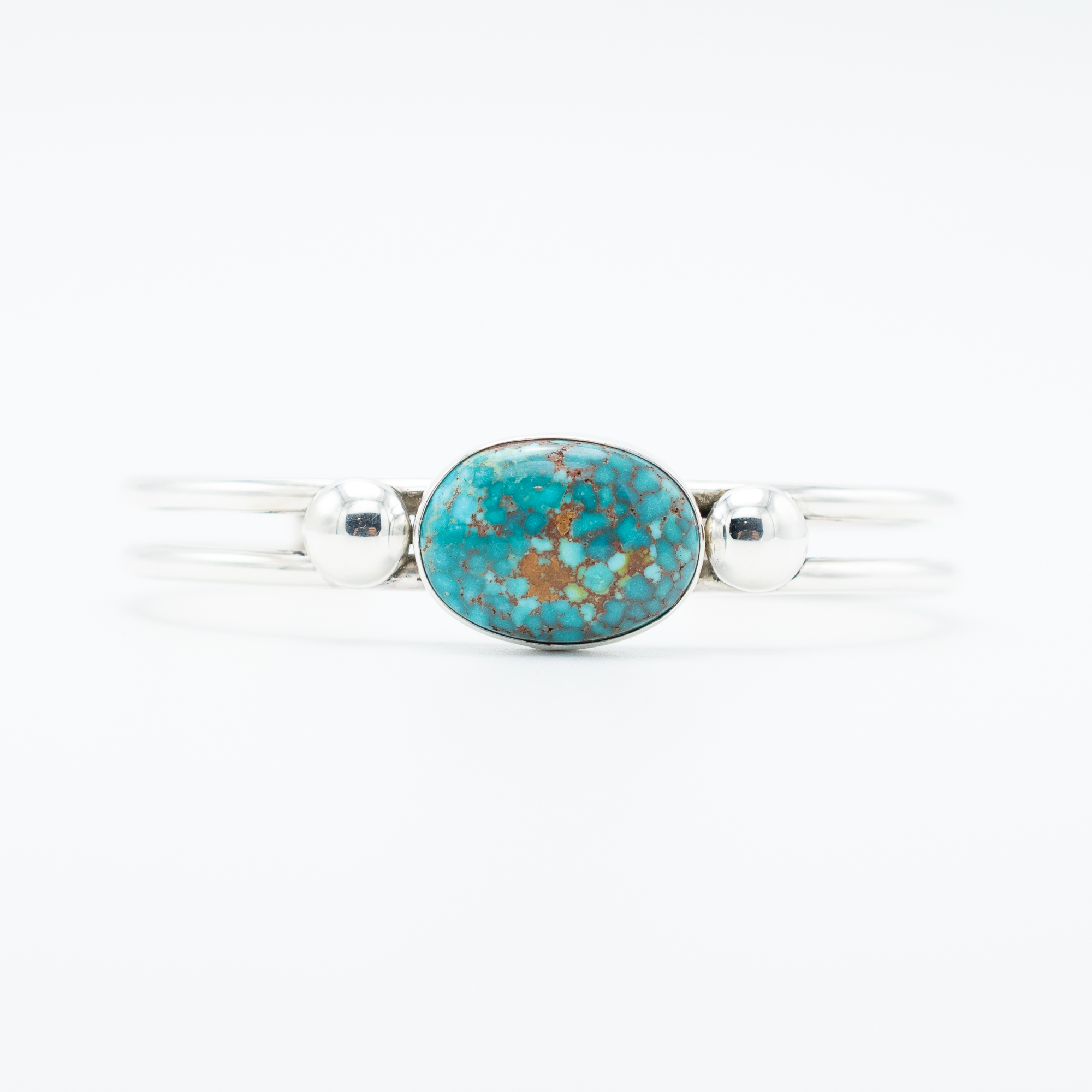 This beautifully handcrafted bracelet by Navajo artist Bryant Martinez features a stunning Catalina turquoise stone, rich with natural matrix and set in a sleek sterling silver bezel. The double-band design is accented with silver spheres, adding a balanced touch of elegance and tradition. A timeless piece that blends classic craftsmanship with contemporary appeal, perfect for any jewelry collection.
