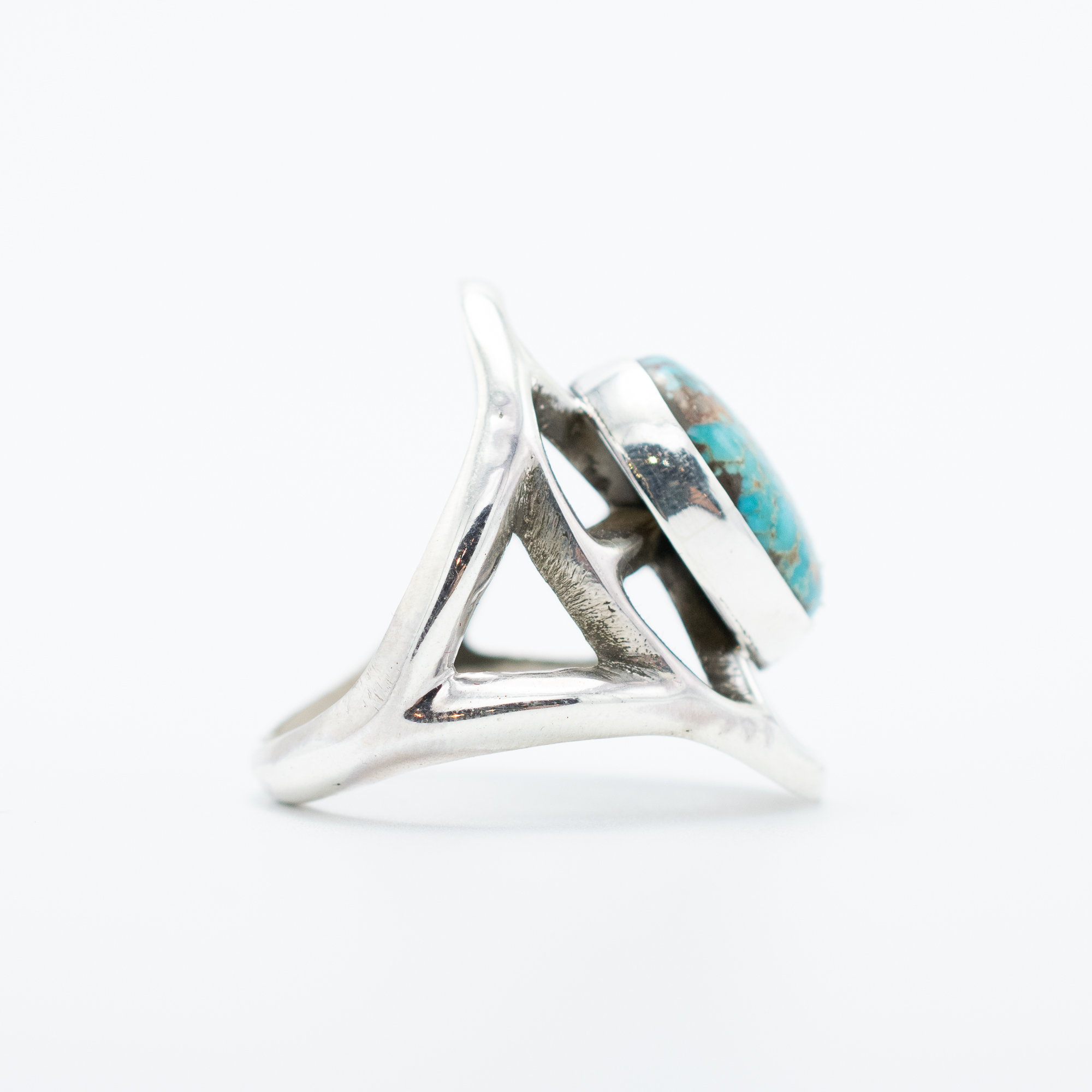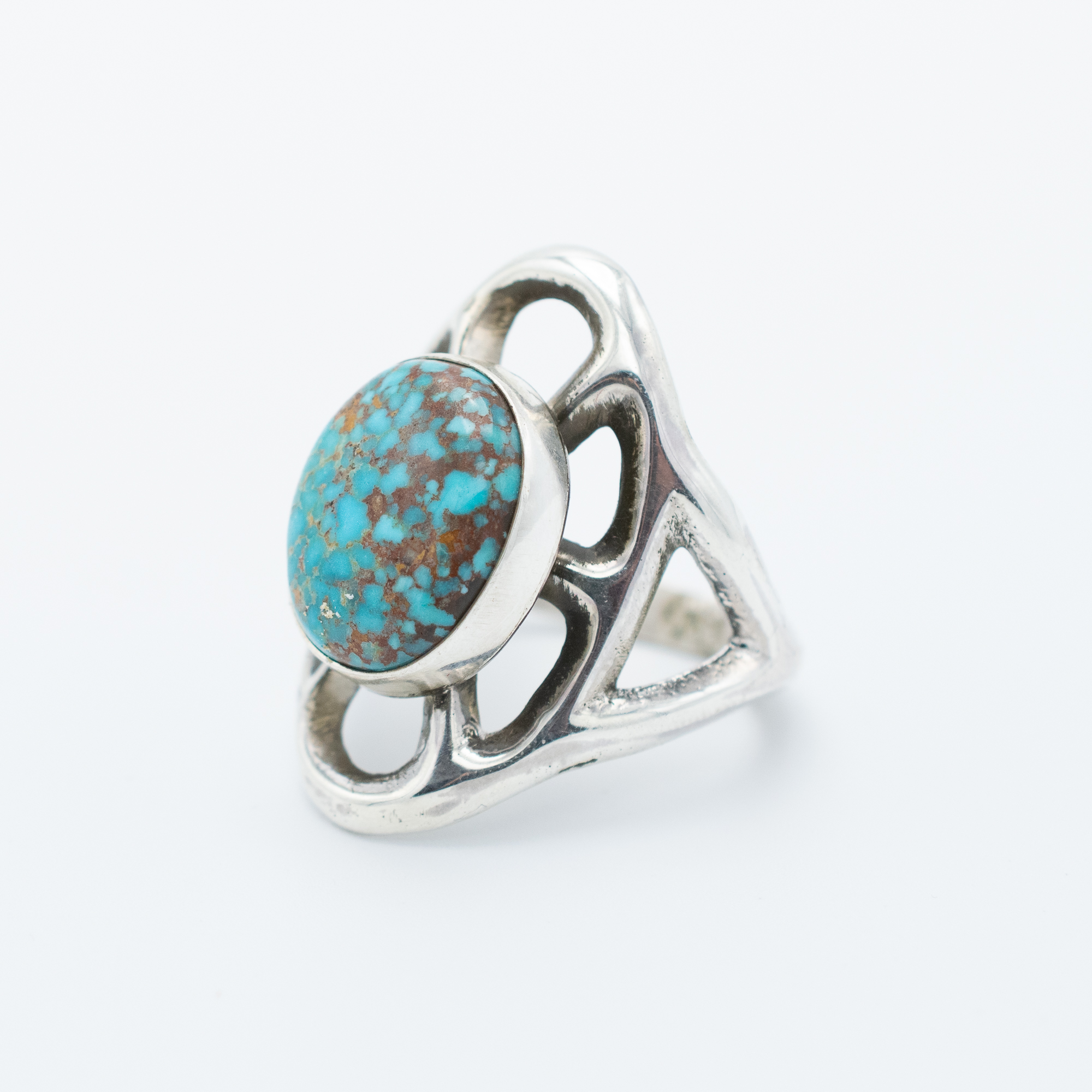 This bold statement ring by Navajo (Diné) artist Henry Morgan features a richly patterned Catalina turquoise stone with vivid blue tones and a warm, earthy brown matrix. The stone is set in a smooth bezel and framed by an intricate sterling silver sandcast design, showcasing flowing, organic shapes and openwork. The sandcasting technique adds a handcrafted, sculptural quality that gives the ring a strong visual presence. A fusion of natural beauty and traditional craftsmanship, this piece celebrates the artistry of Navajo silversmithing.