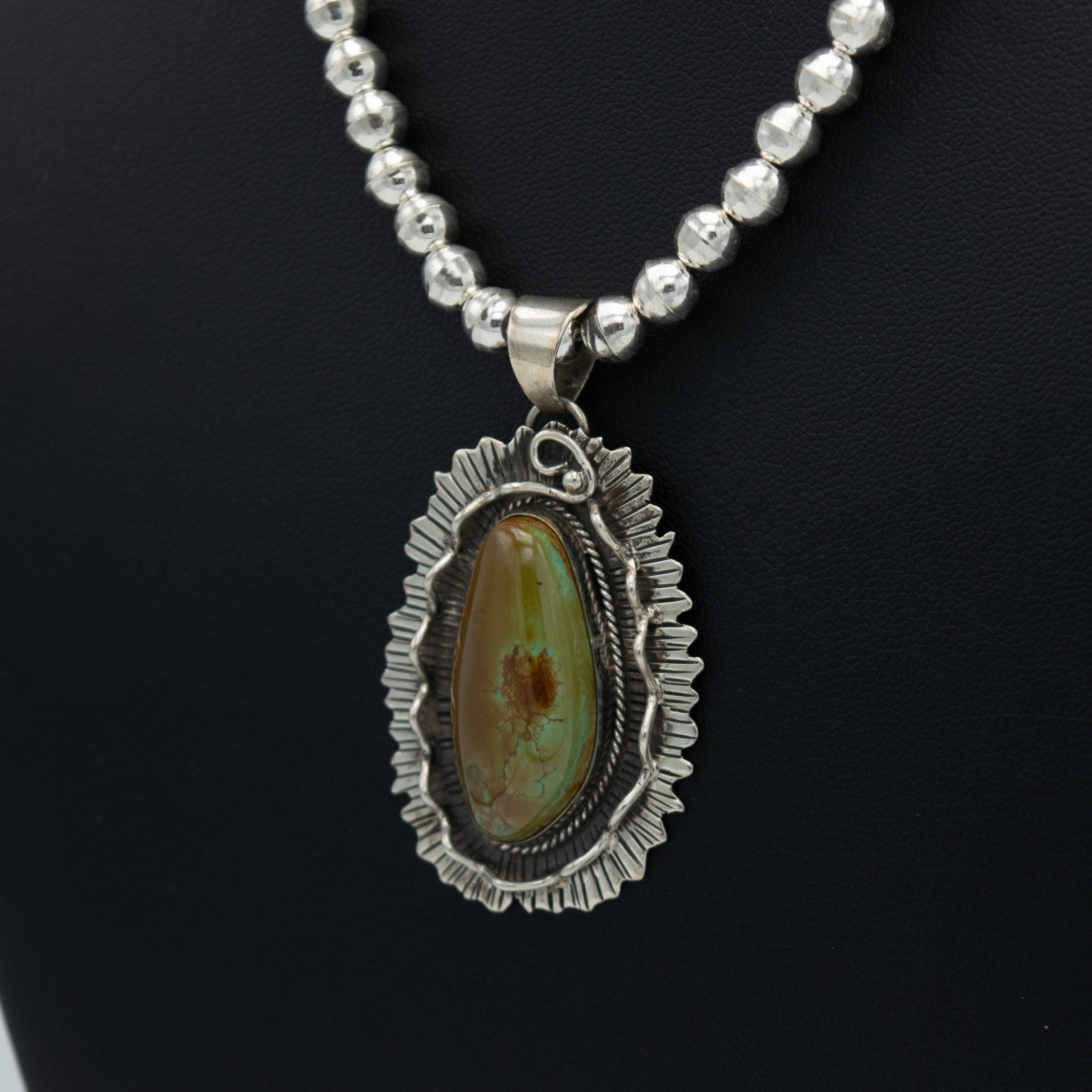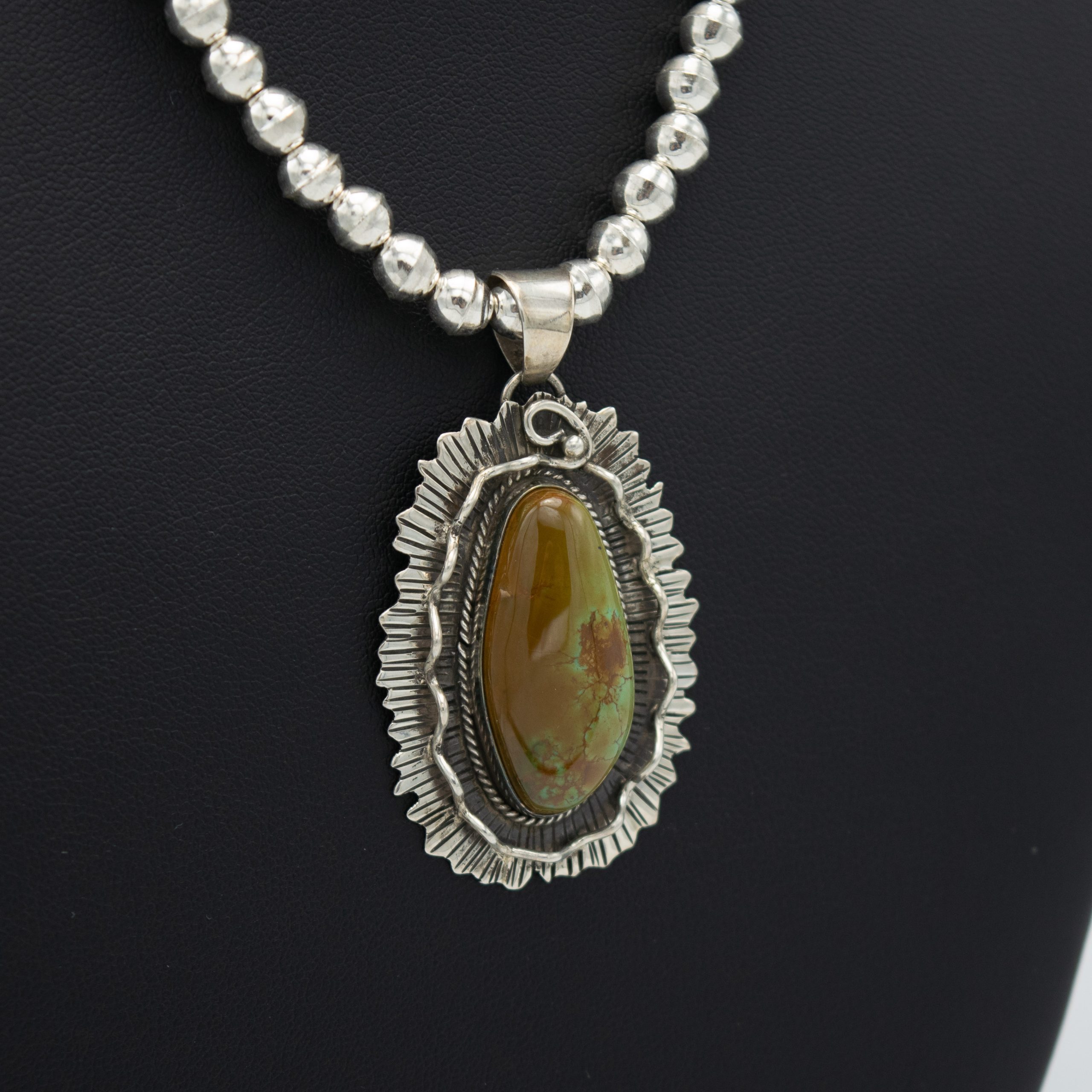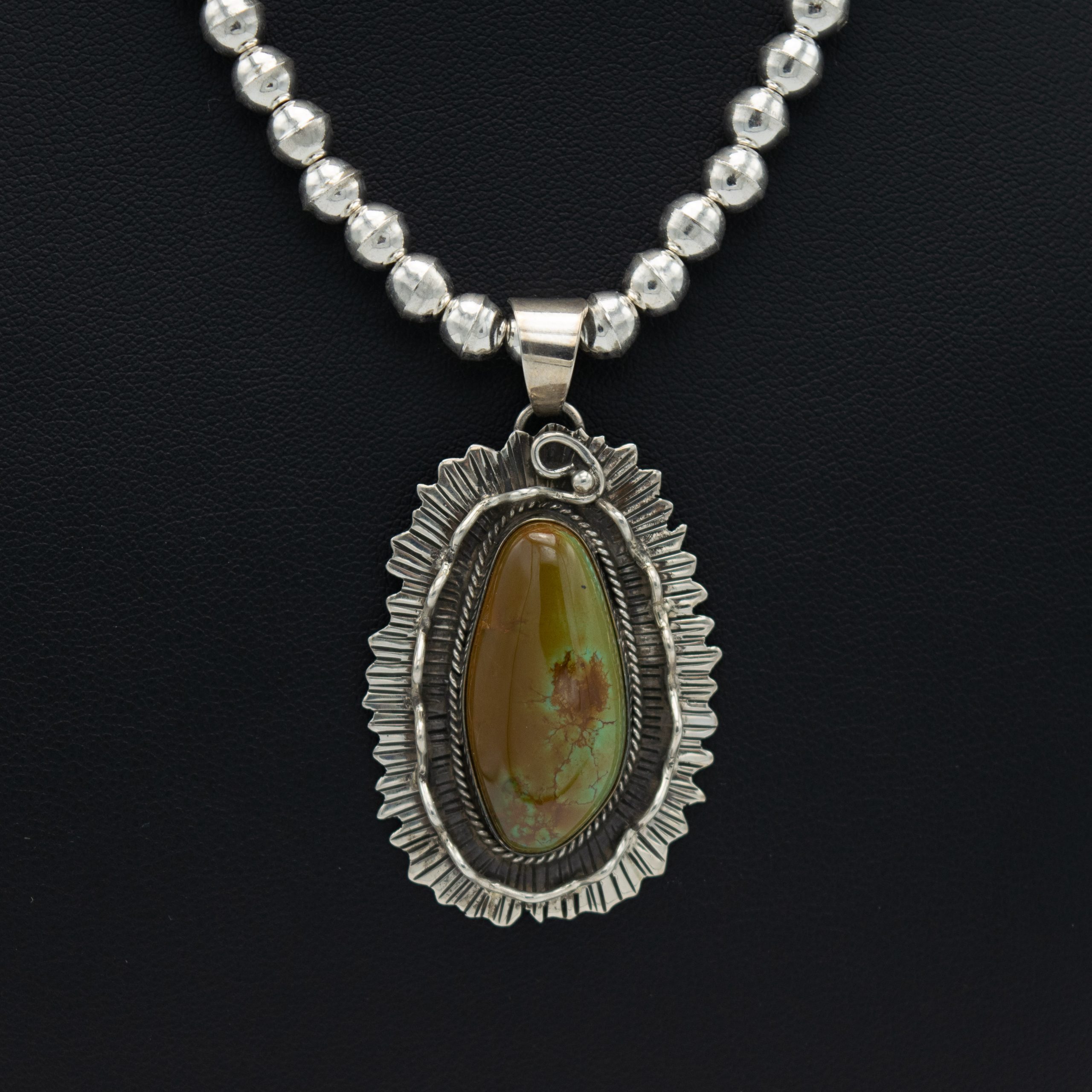 Make a bold statement with the Cerrillos Turquoise Avanyu Pendant by Ruth Ann Begay, Navajo. This striking piece features Cerrillos turquoise, renowned for its vibrant blue-green hue and rich history, adorned with an intricately crafted Avanyu design, symbolizing water and protection in Pueblo mythology.
