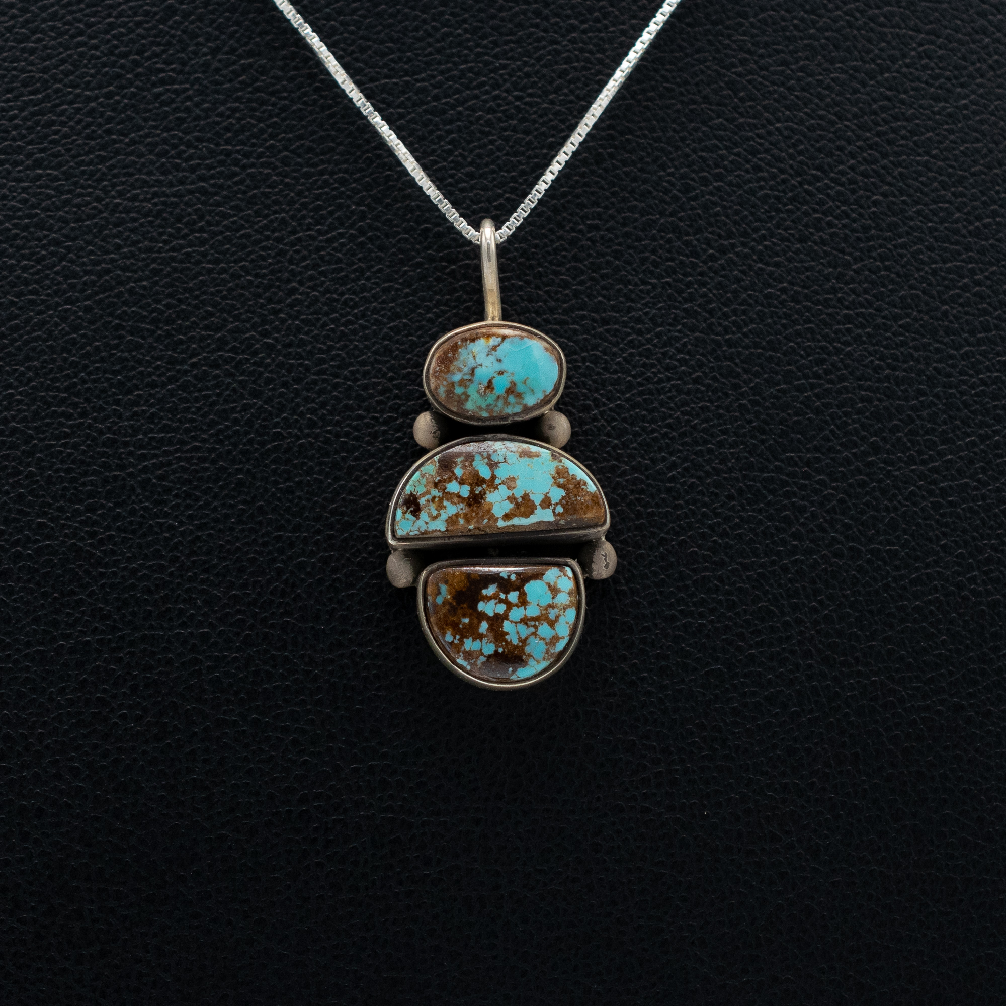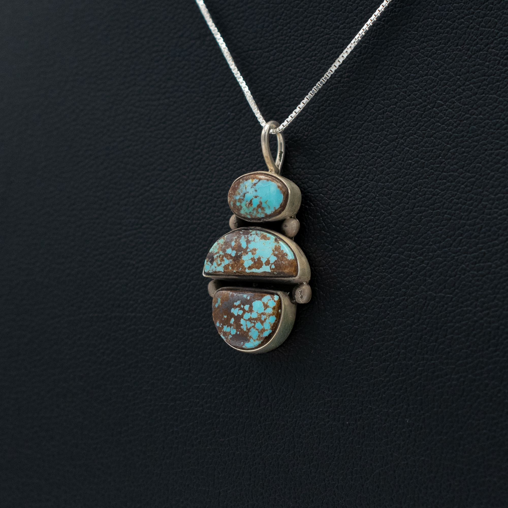 This Cerrillos Turquoise Pendant by Navajo artist Bryant Martinez showcases a striking trio of Cerrillos turquoise stones with deep brown matrix, set in sterling silver. The carefully arranged stones highlight the natural beauty of the Cerrillos mine’s unique color variations. Handcrafted with traditional Navajo silversmithing techniques, this pendant is a one-of-a-kind statement piece that reflects the rich heritage of Southwest jewelry.