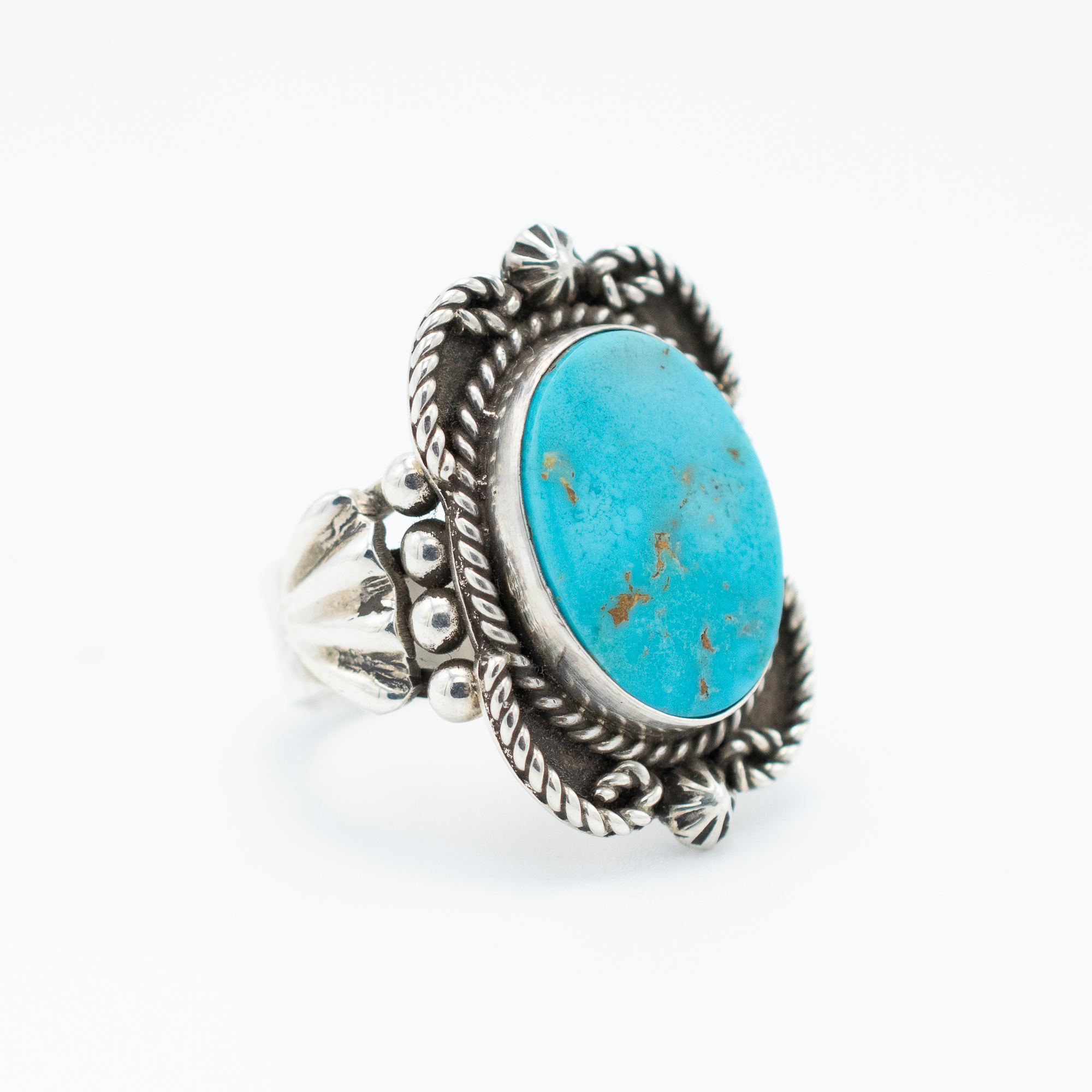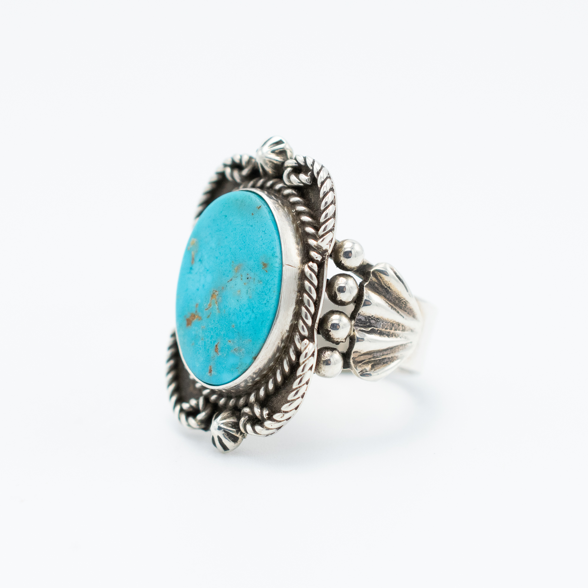 This Natural Cortez Turquoise Ring by Navajo artist Etta Endito features a striking blue stone with delicate golden matrix, framed in a handcrafted sterling silver setting. A twisted wire border, scalloped edges, and silver drop accents add classic Southwestern elegance. Bold yet timeless, this piece brings tradition and artistry to your everyday style.