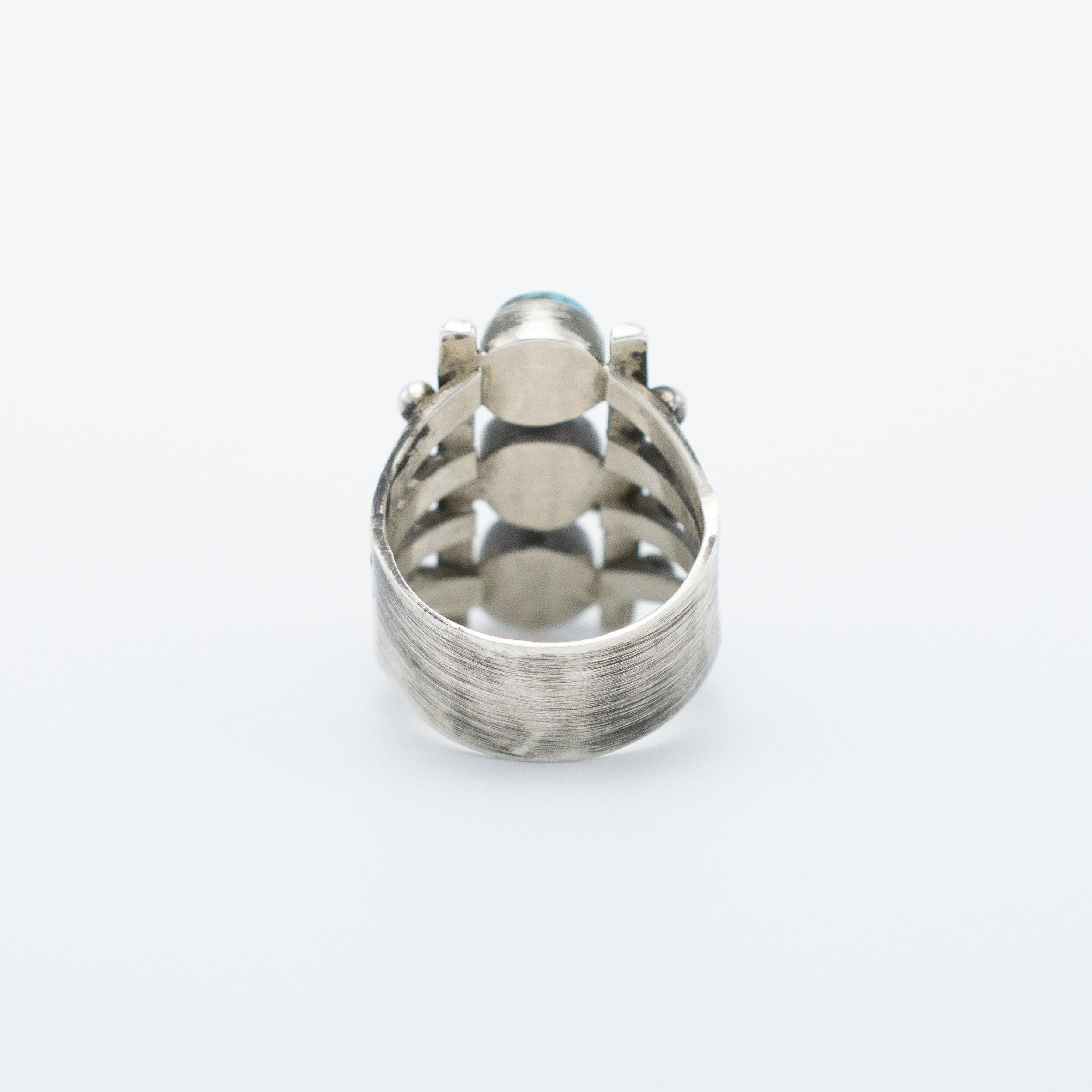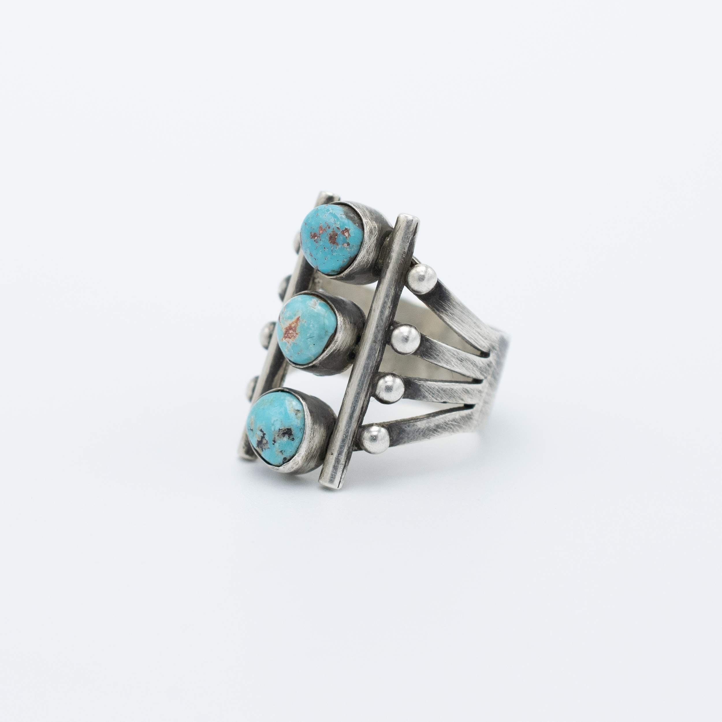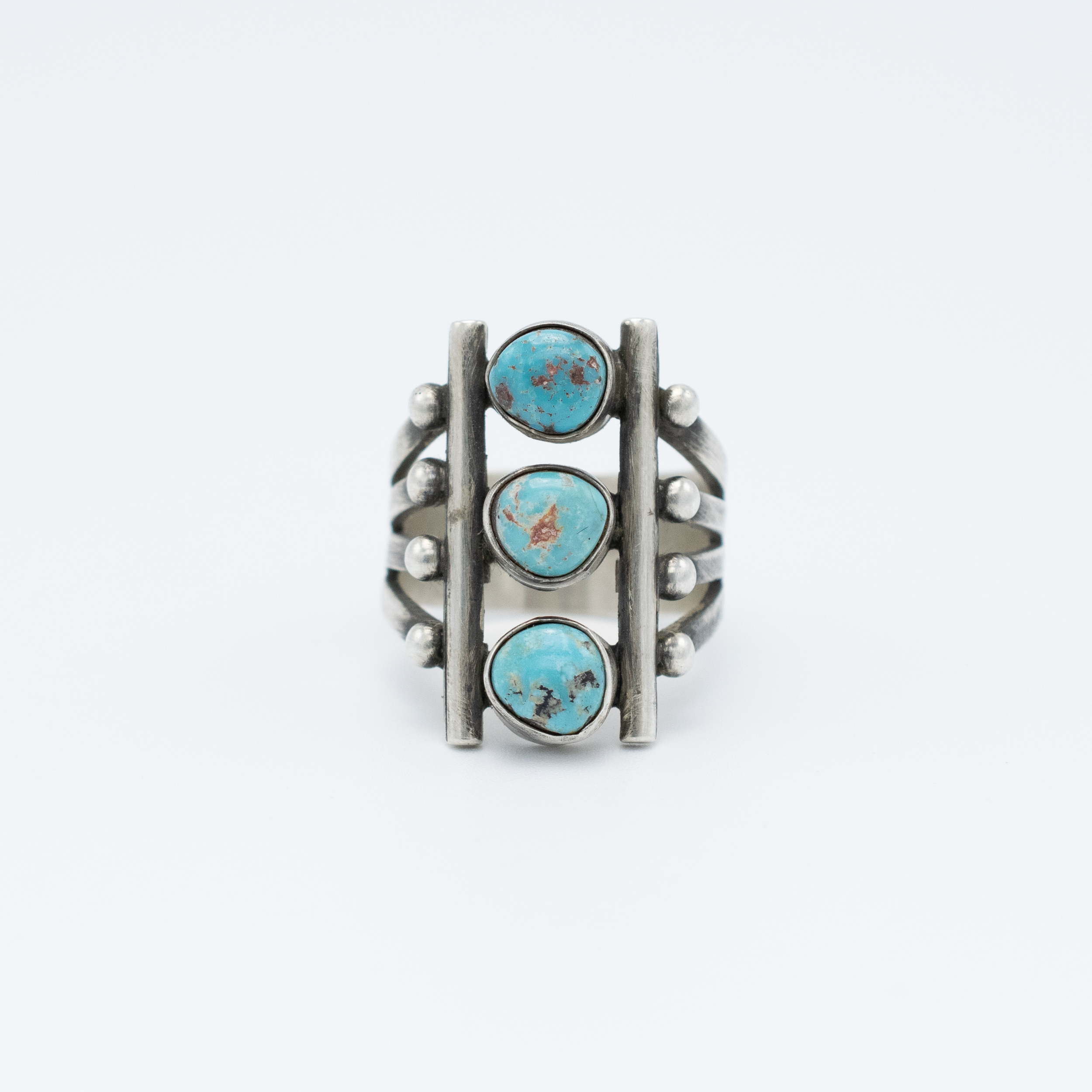 This striking Cripple Creek Turquoise Ring by Navajo artist Bryant Martinez showcases three round turquoise stones, each beautifully set in sterling silver. The unique matrix of the Cripple Creek turquoise adds depth and character to this bold, multi-stone design. Handcrafted with attention to detail, the vertical arrangement of the stones, along with the split shank, creates a contemporary yet timeless aesthetic. Perfect for those who appreciate traditional craftsmanship with a modern twist, this ring is a versatile addition to any collection.