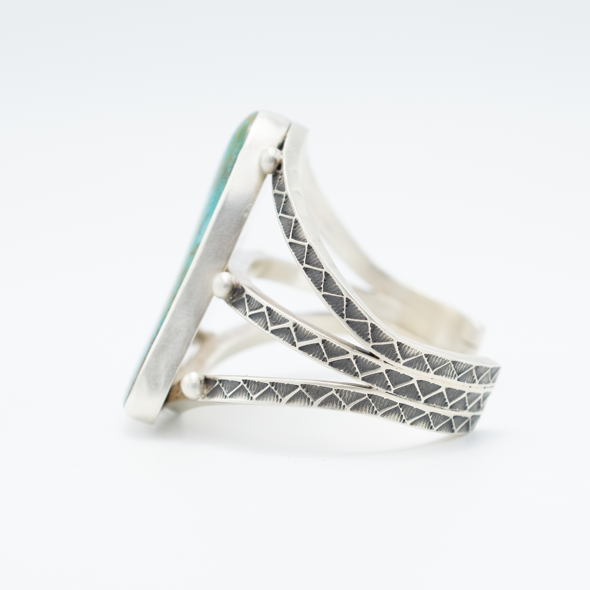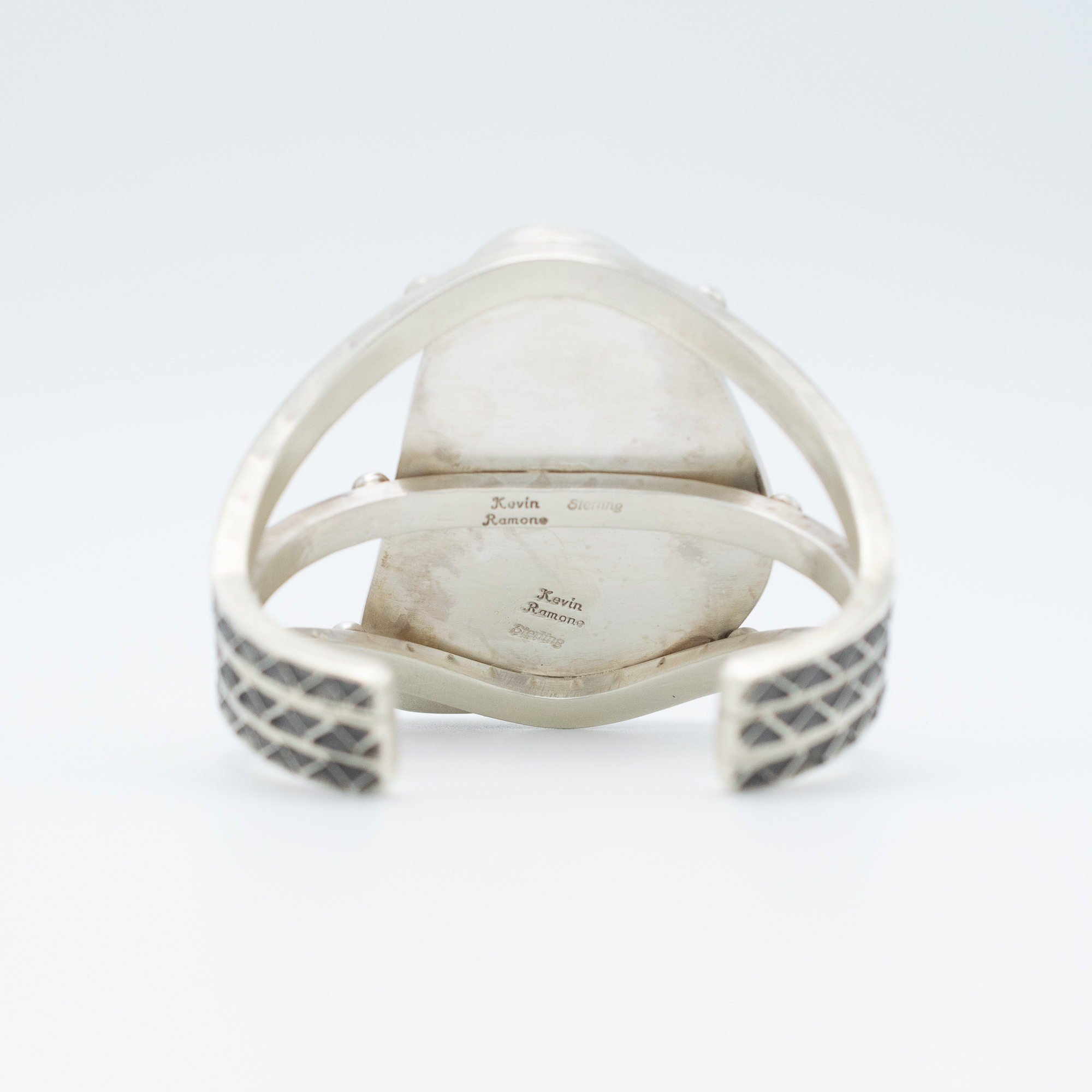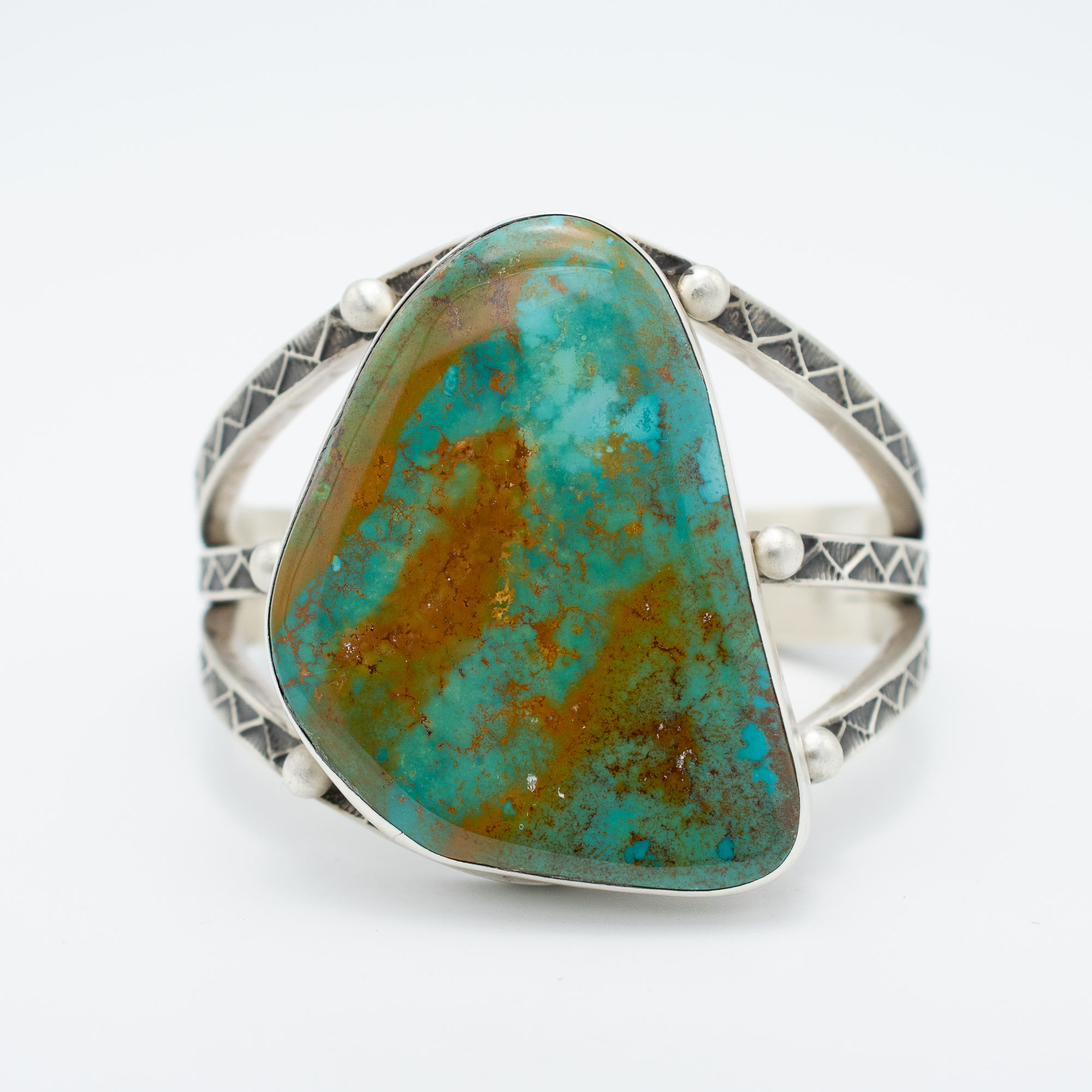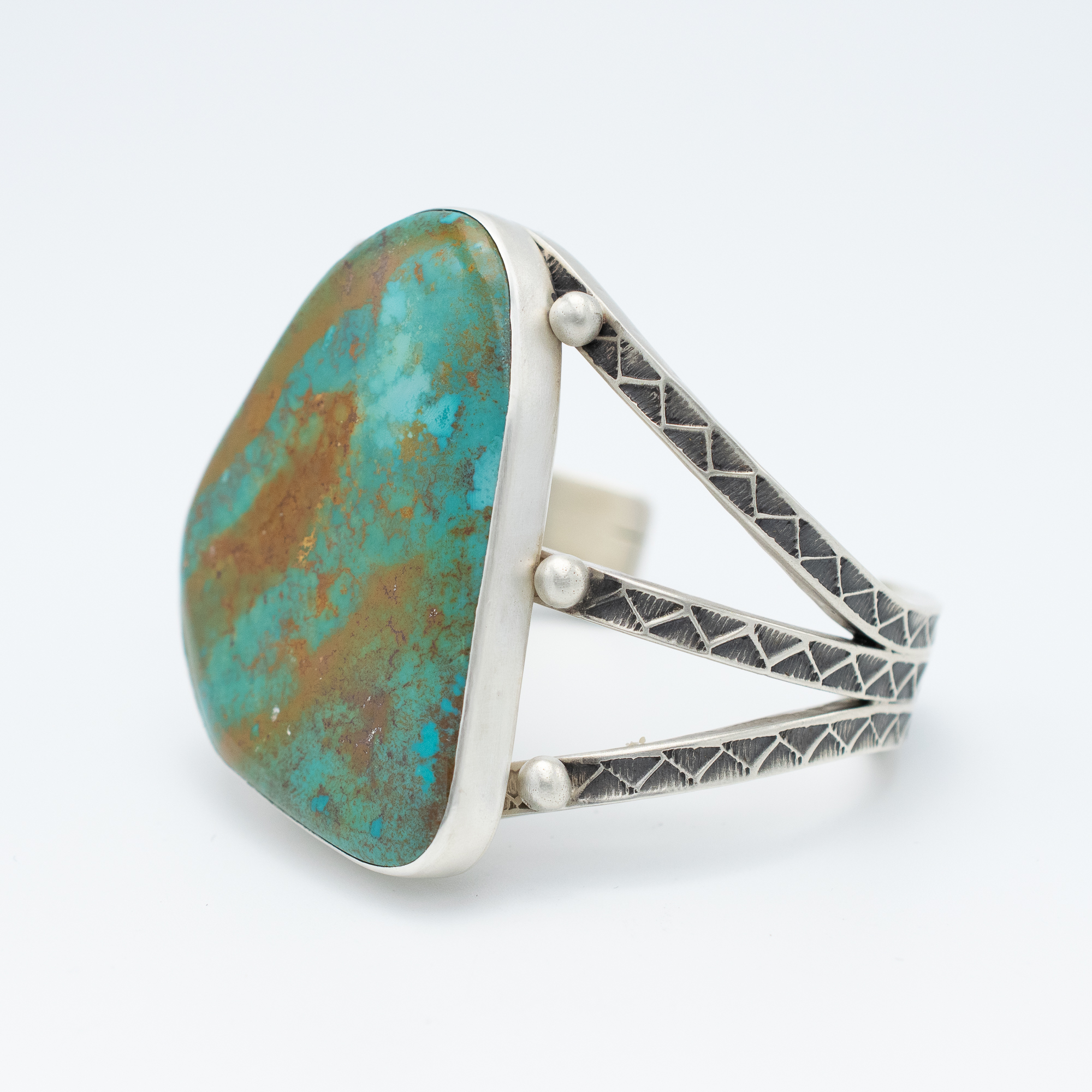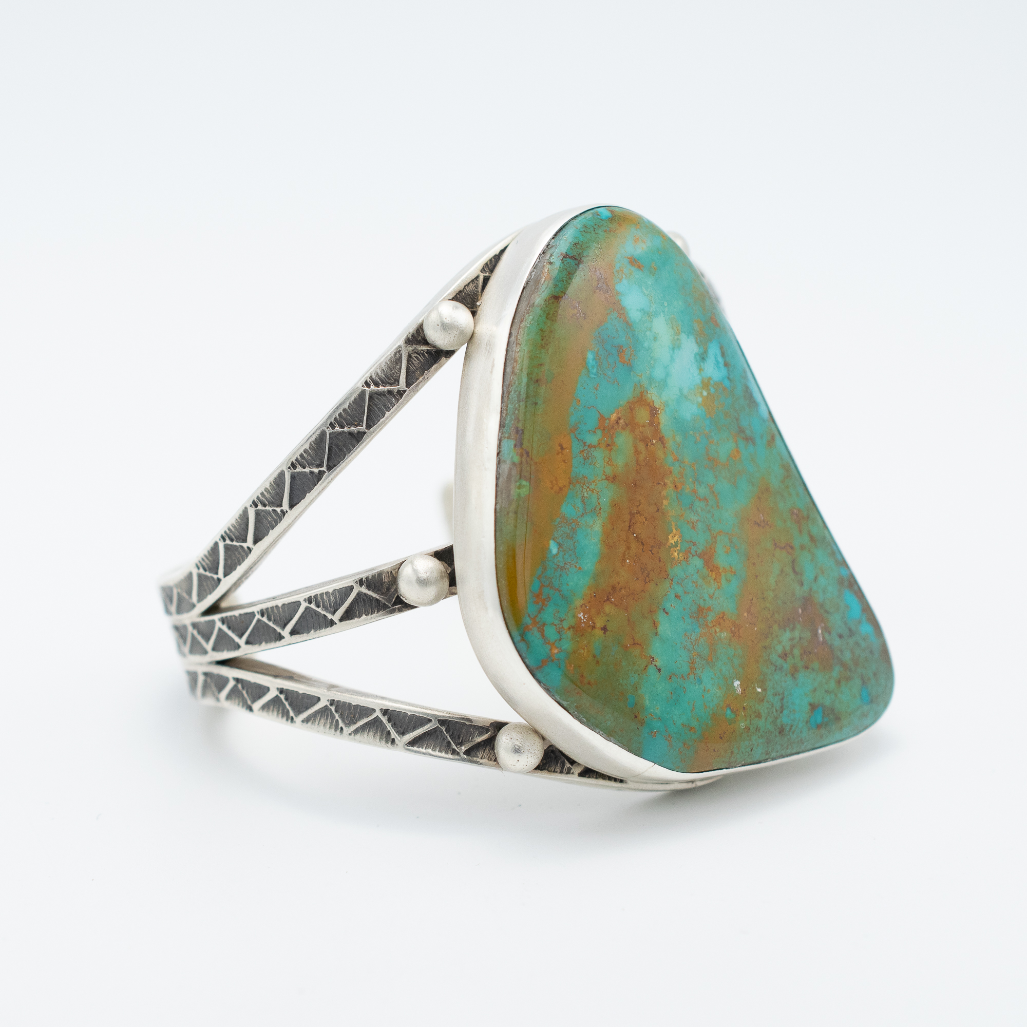 This striking bracelet by Navajo artist Kevin Ramone features a remarkable natural Crow Springs turquoise stone, rich with earthy matrix and oceanic hues. The freeform cabochon is set in a clean bezel and framed by a split band of hand-stamped sterling silver, adding texture and depth to the piece. A bold expression of desert beauty, this one-of-a-kind cuff is perfect for anyone drawn to unique stones and timeless craftsmanship.