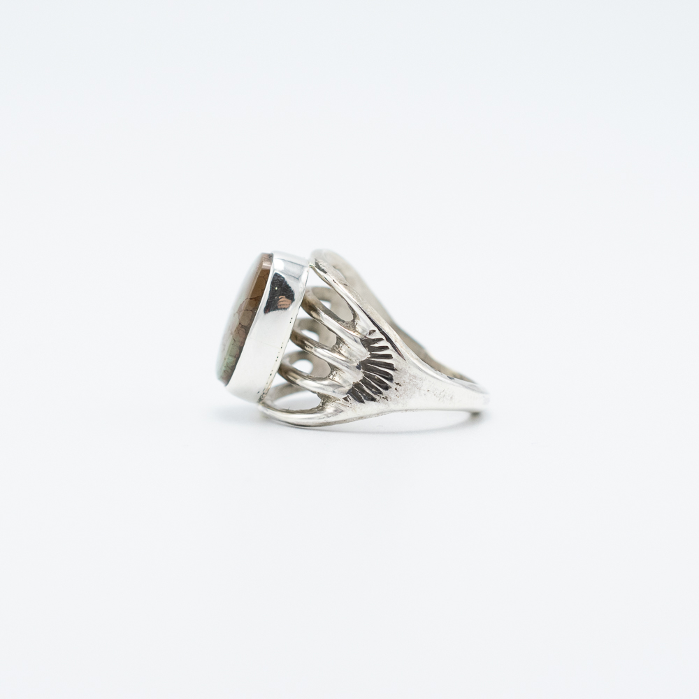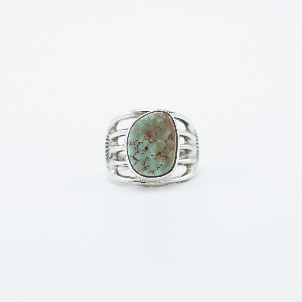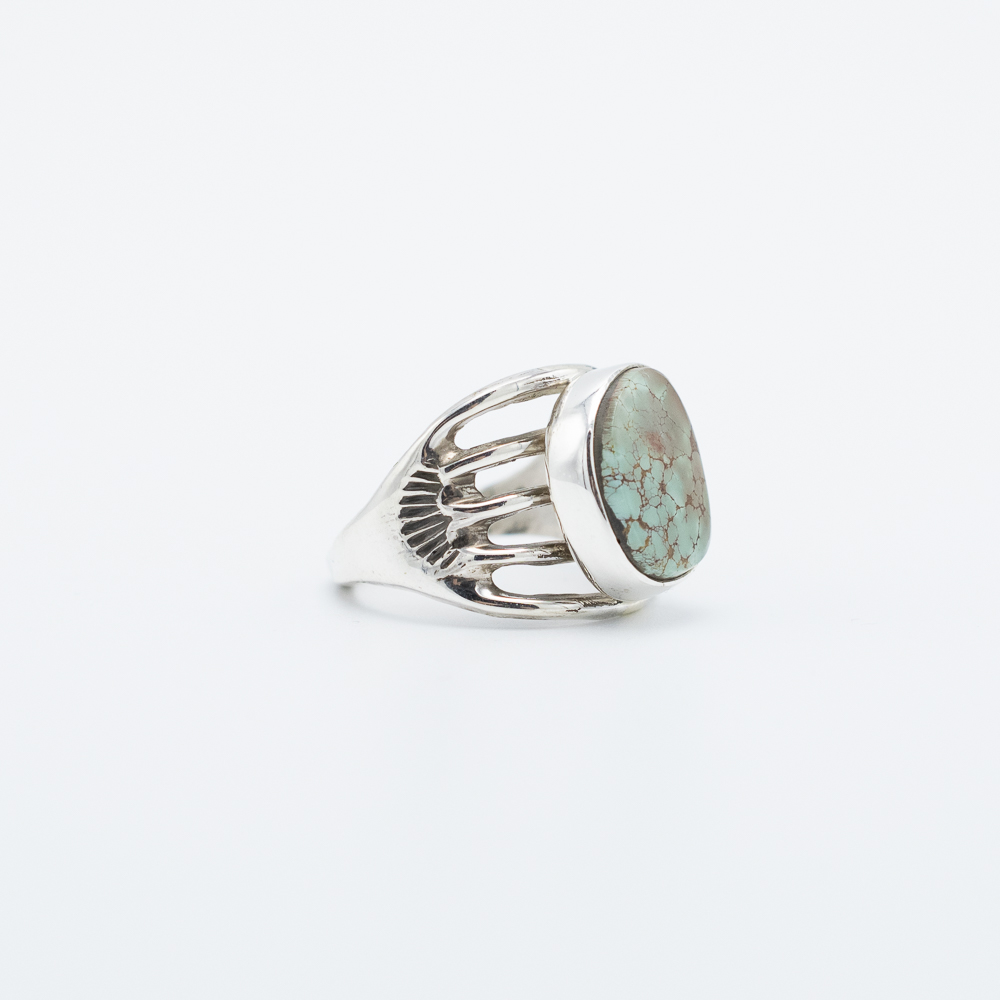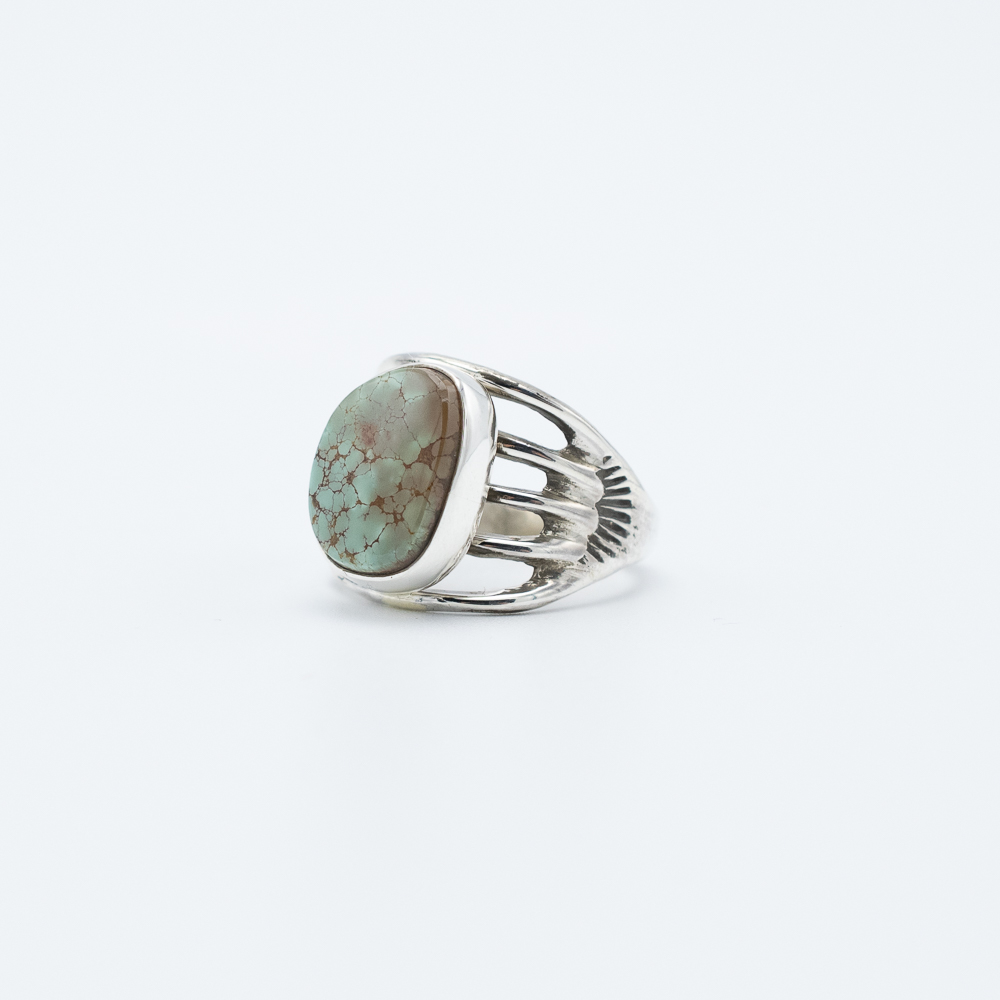 This elegant ring by Navajo artist FL Begay showcases the earthy tones of Crow Springs turquoise. The stone’s unique blend of pale green hues and brown matrix is set in sterling silver, complemented by an intricately crafted open shank design with detailed hand-stamped accents. The natural beauty of the turquoise and the artistry of the silverwork make this piece a stunning statement for everyday wear or special occasions. Handcrafted with skill and tradition, it’s a perfect addition to any collection of Native American jewelry.