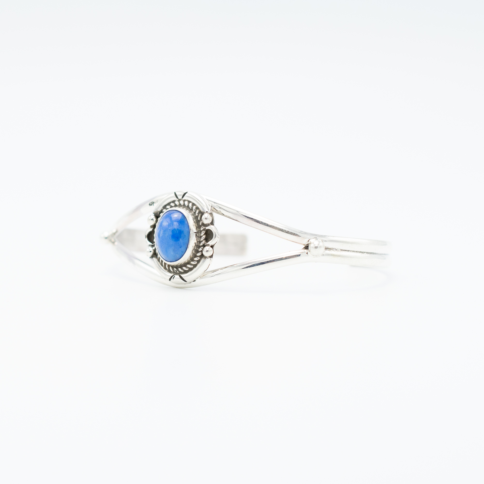 This Denim Lapis Bracelet by Navajo artist Ruth Ann Begay features a deep blue oval denim lapis stone, framed by a twisted silver border and decorative silver accents. The stone is set on an open split-shank cuff, creating a lightweight and elegant design. Handcrafted in sterling silver, this bracelet offers a timeless style that’s perfect for both everyday wear and special occasions.