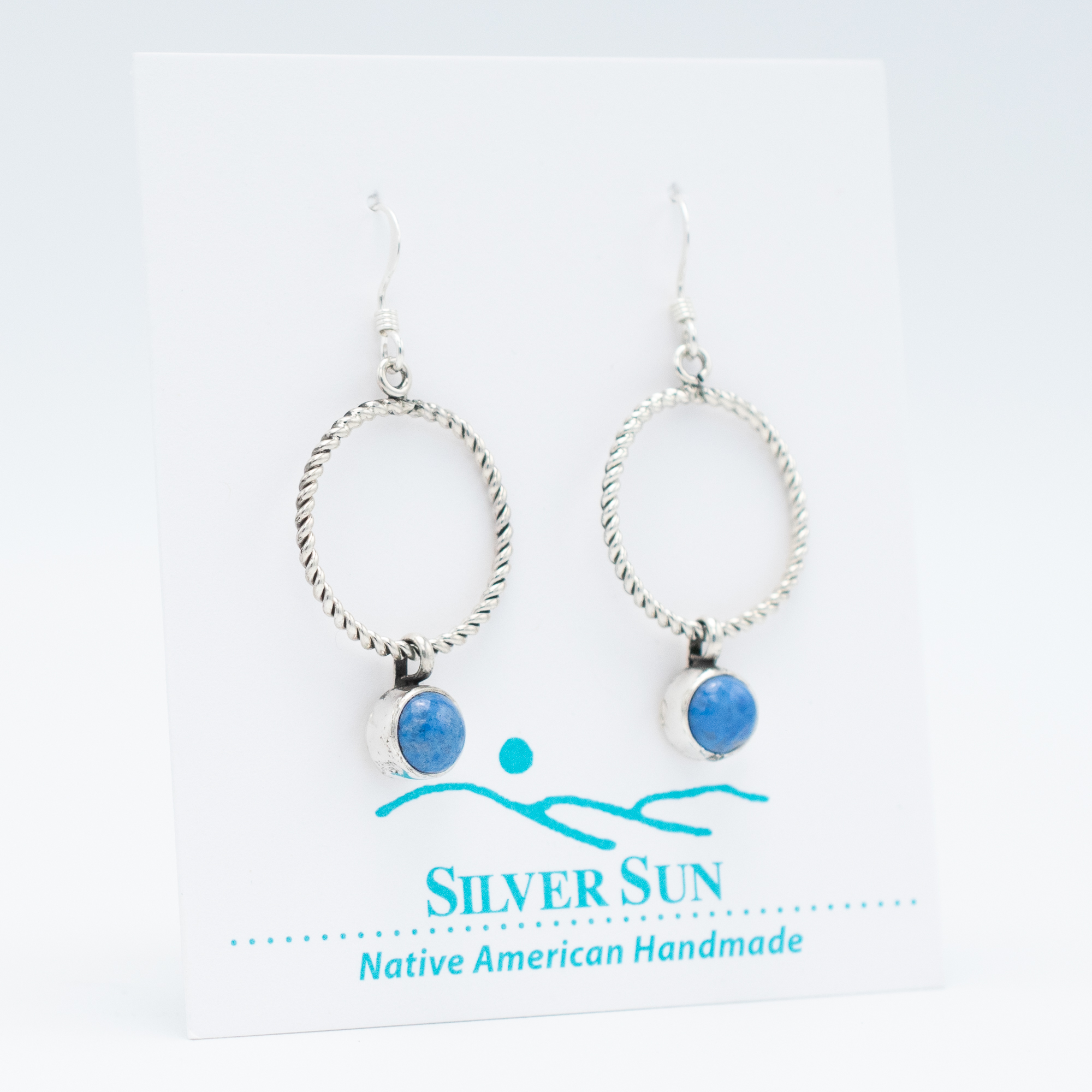 These Denim Lapis Hoop Dangle Earrings by Navajo artist Ruth Ann Begay offer a fresh, modern take on traditional materials. Each pair features a twisted sterling silver hoop with a round denim lapis drop, showcasing the stone’s soft blue hues. Lightweight and stylish, they’re a perfect everyday accessory with just the right pop of color.