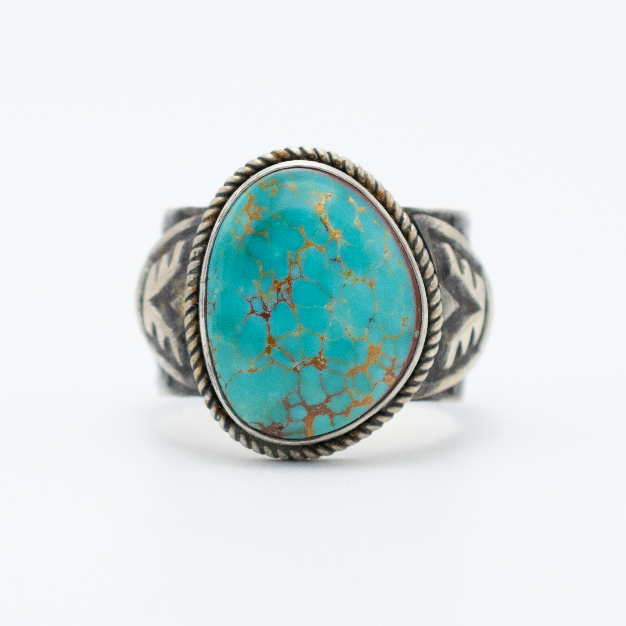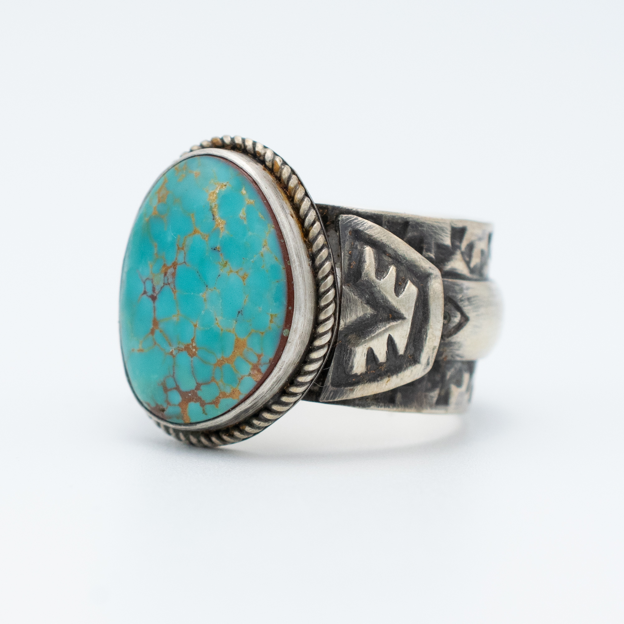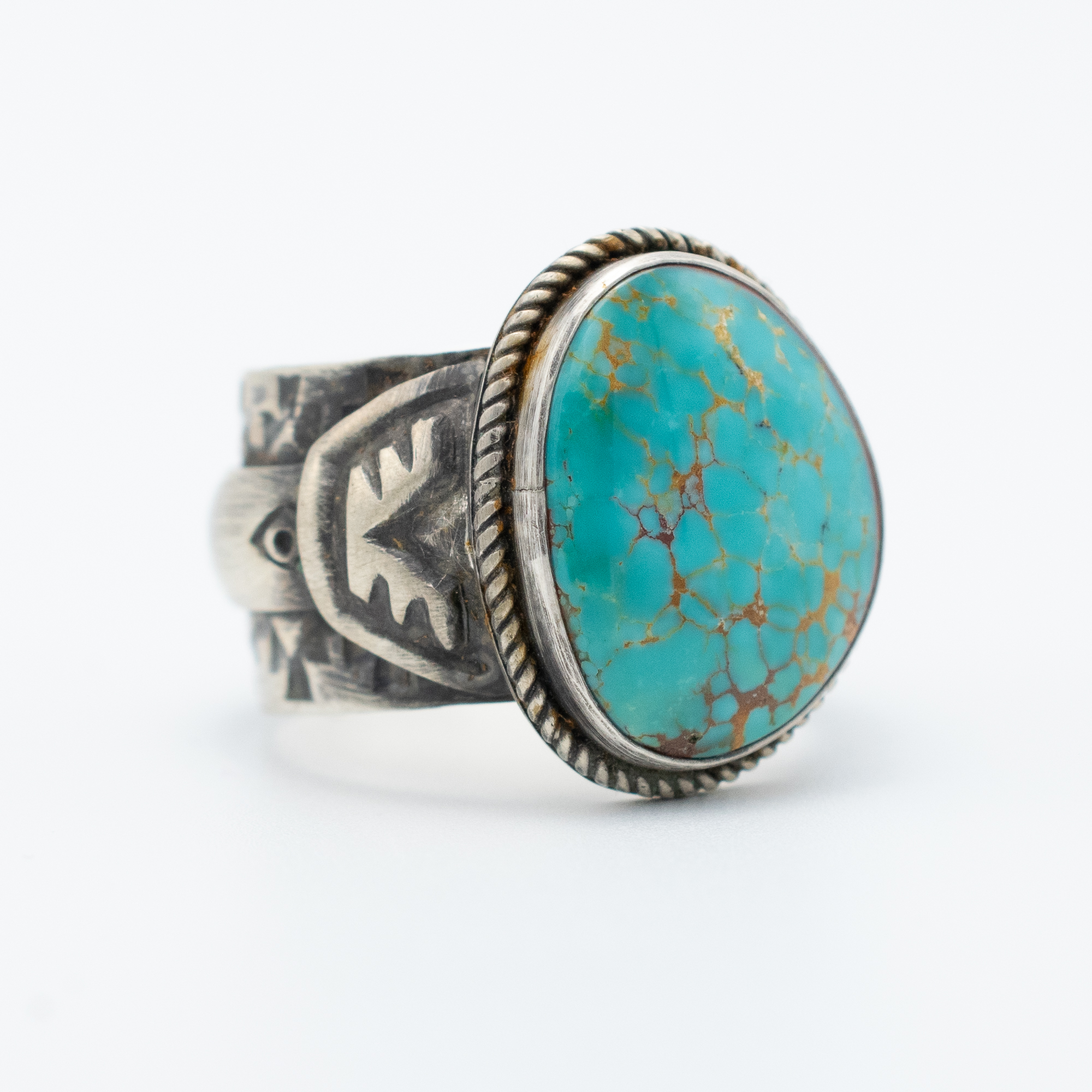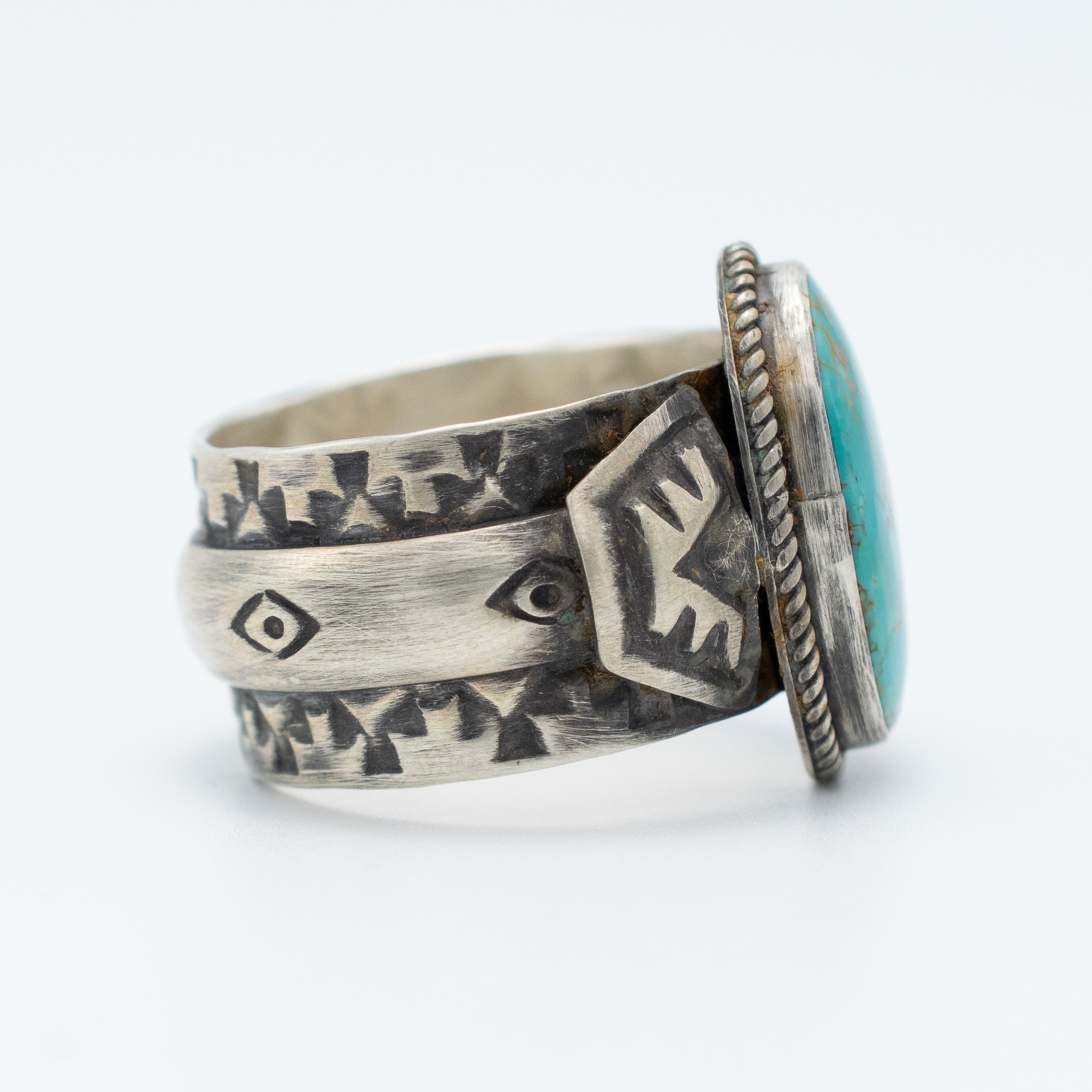 This Natural Easter Blue Turquoise Thunderbird Ring by Navajo artist Bryant Martinez features a vibrant turquoise stone, notable for its stunning color and unique matrix. Set in antiqued sterling silver, the ring showcases intricate stamp work, including a detailed Thunderbird motifs that add a bold and powerful element to the design. The craftsmanship and symbolism make this ring an exceptional piece for any jewelry collection.