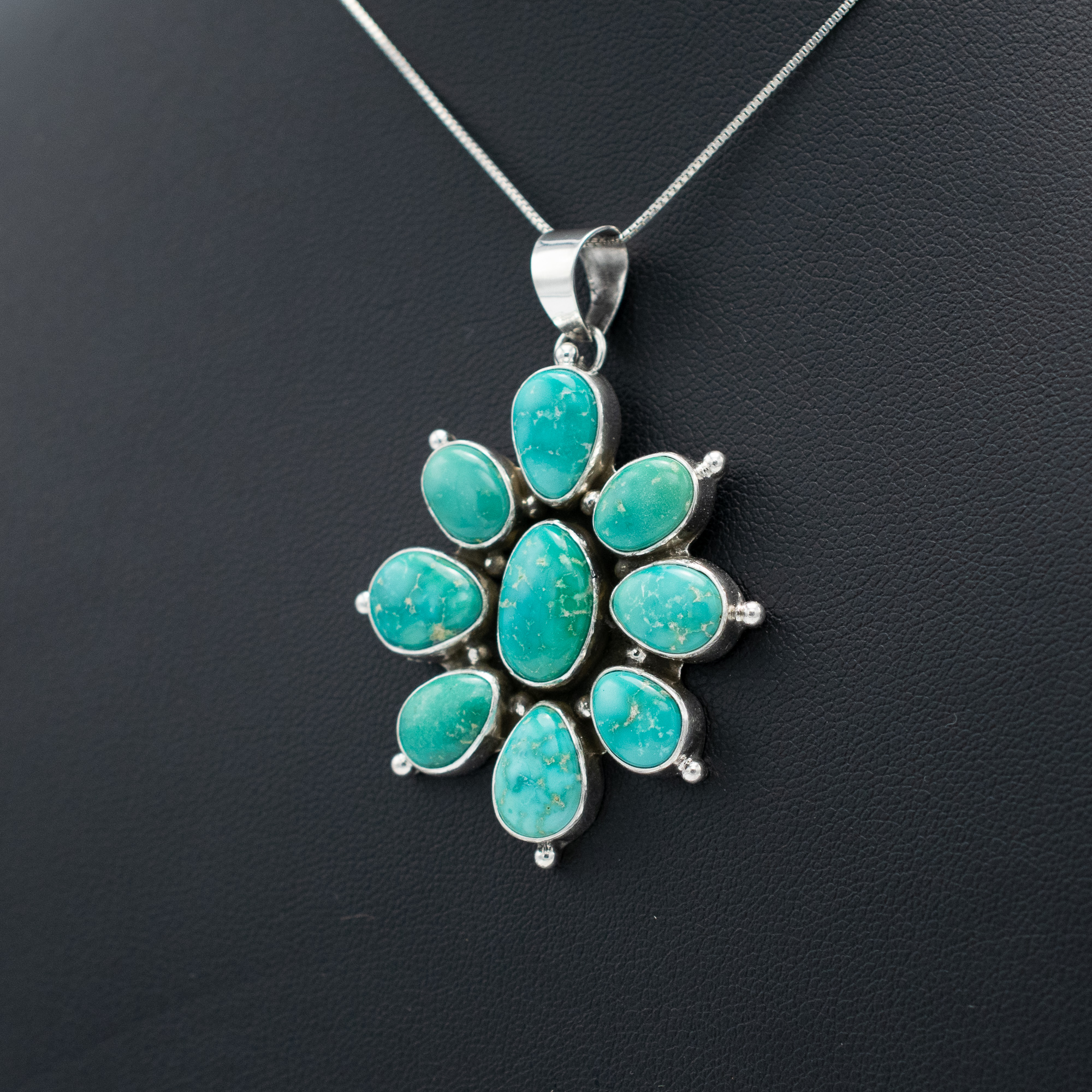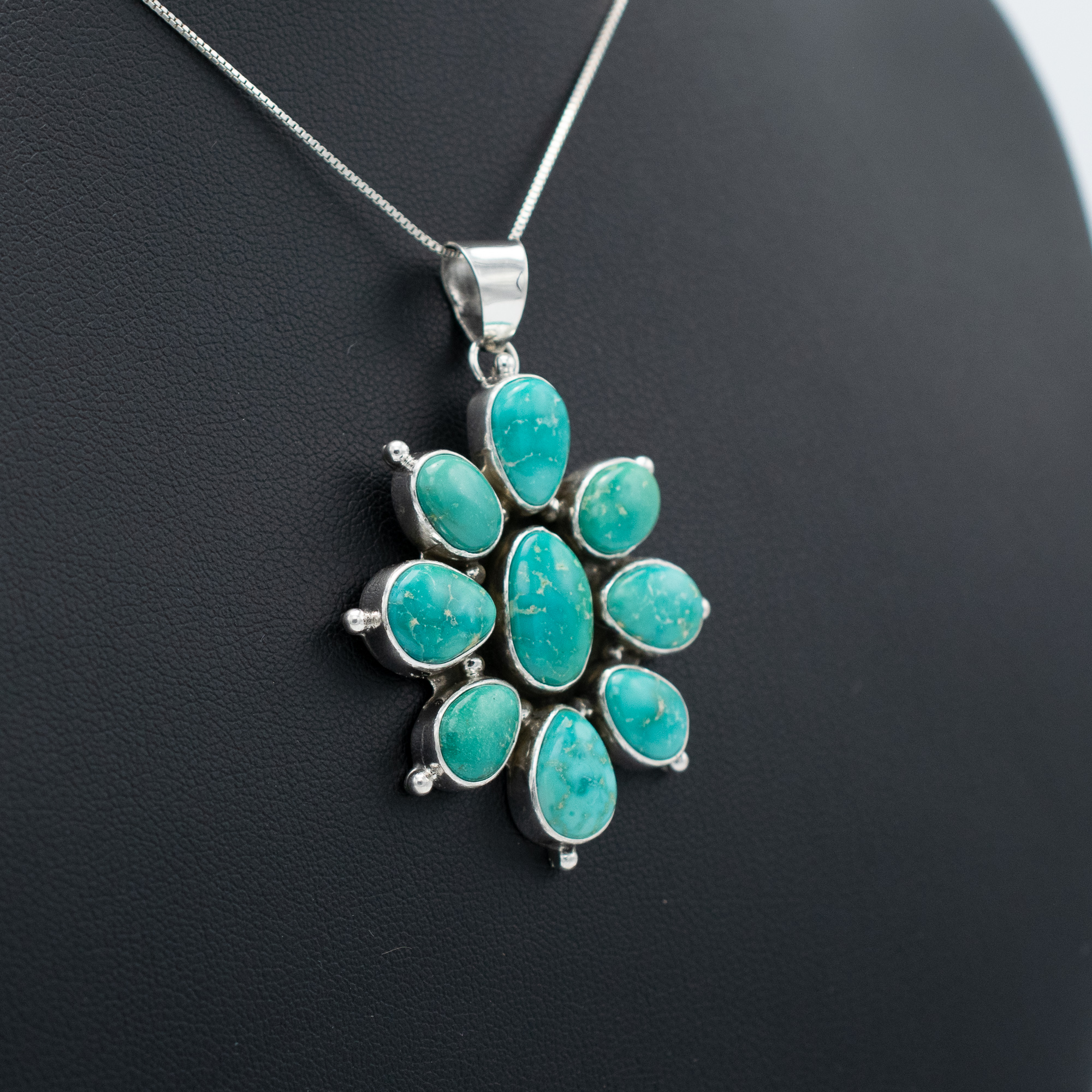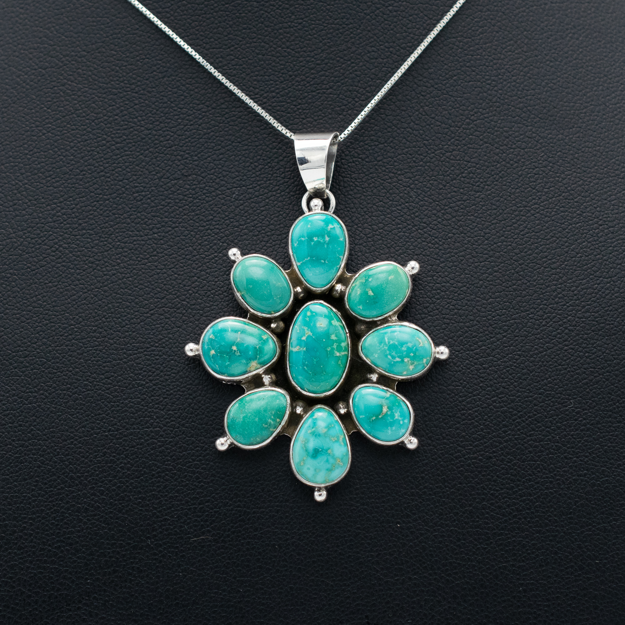 This beautifully handcrafted cluster pendant by Navajo artist Ruth Ann Begay features vibrant enhanced Emerald Valley turquoise stones, each set in sterling silver. The teardrop and oval-shaped stones radiate outward in a balanced floral-inspired arrangement, accented by silver bead details. The bold yet elegant design highlights the rich green hues and unique matrix of the turquoise, making this pendant a striking statement piece. A perfect addition to any collection, it seamlessly blends traditional Navajo artistry with contemporary elegance.